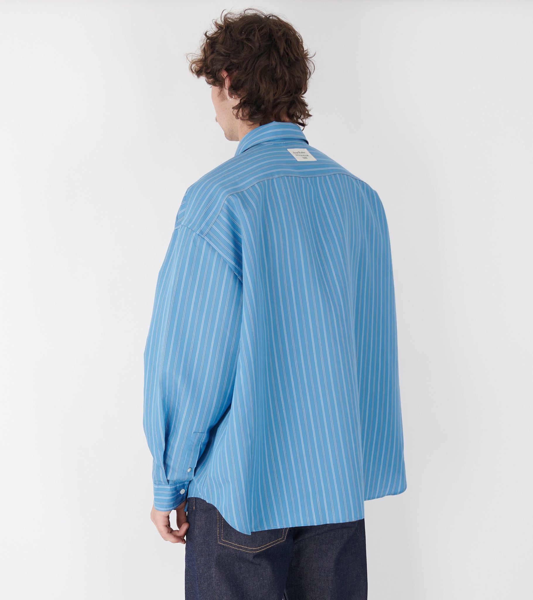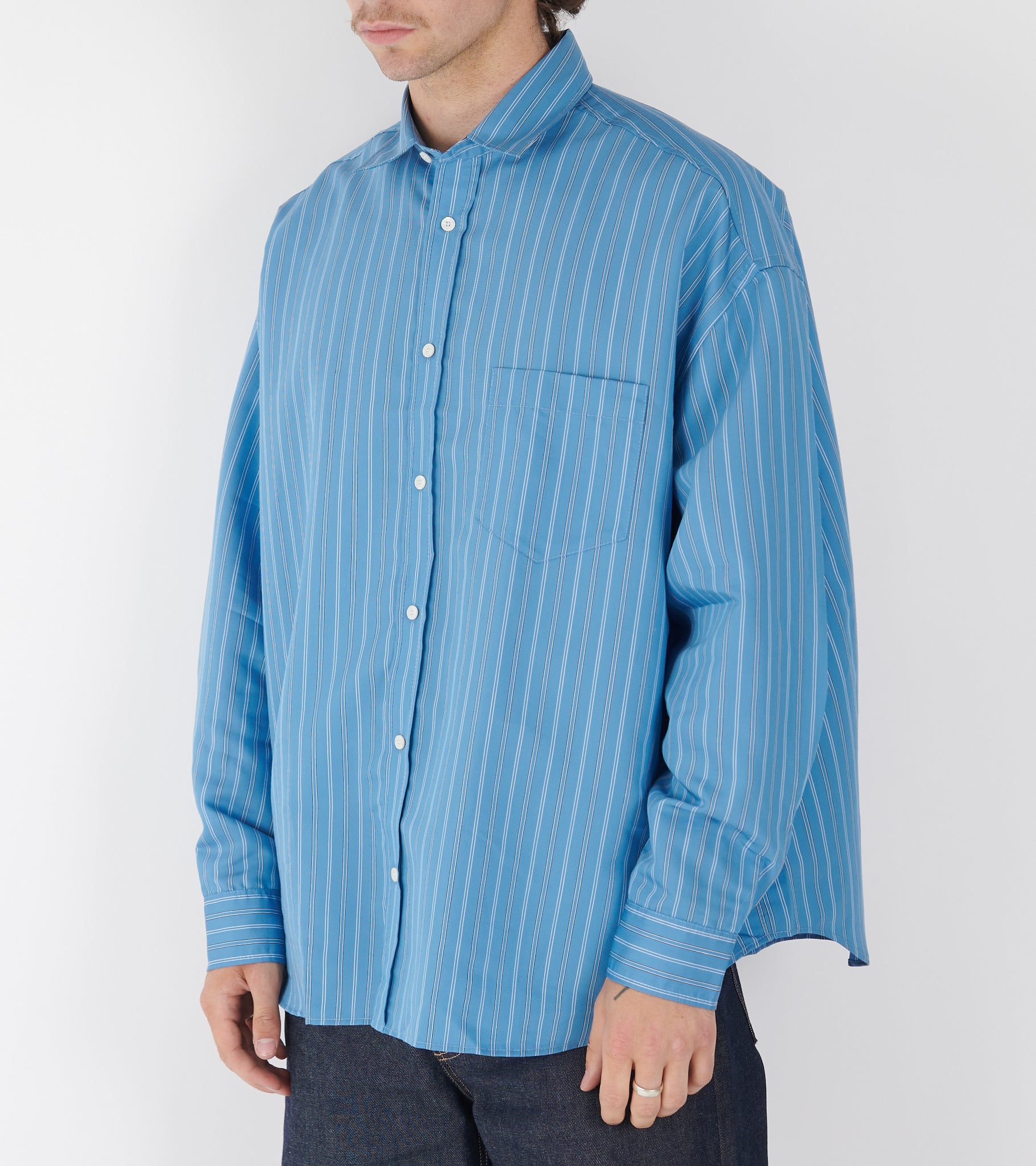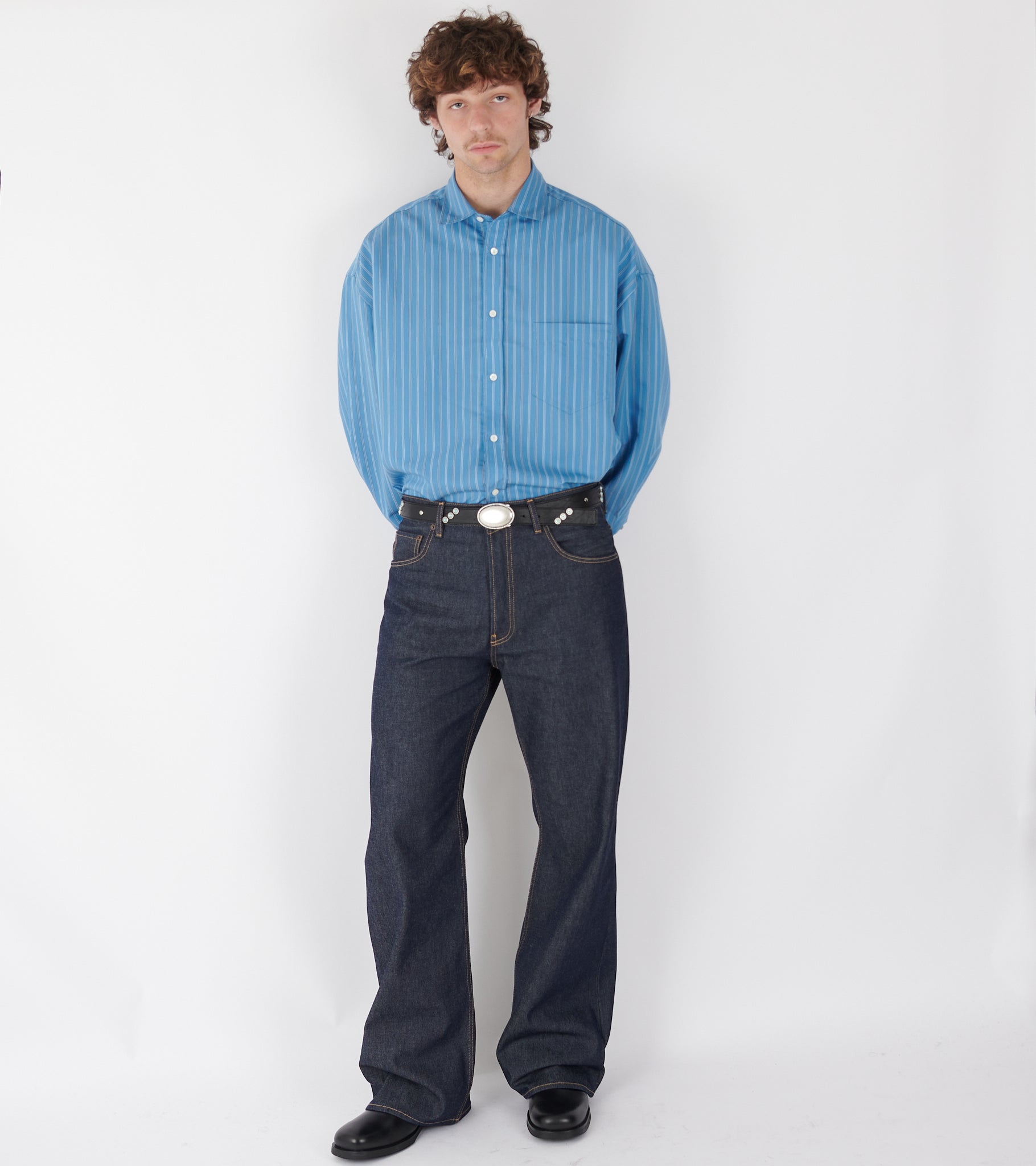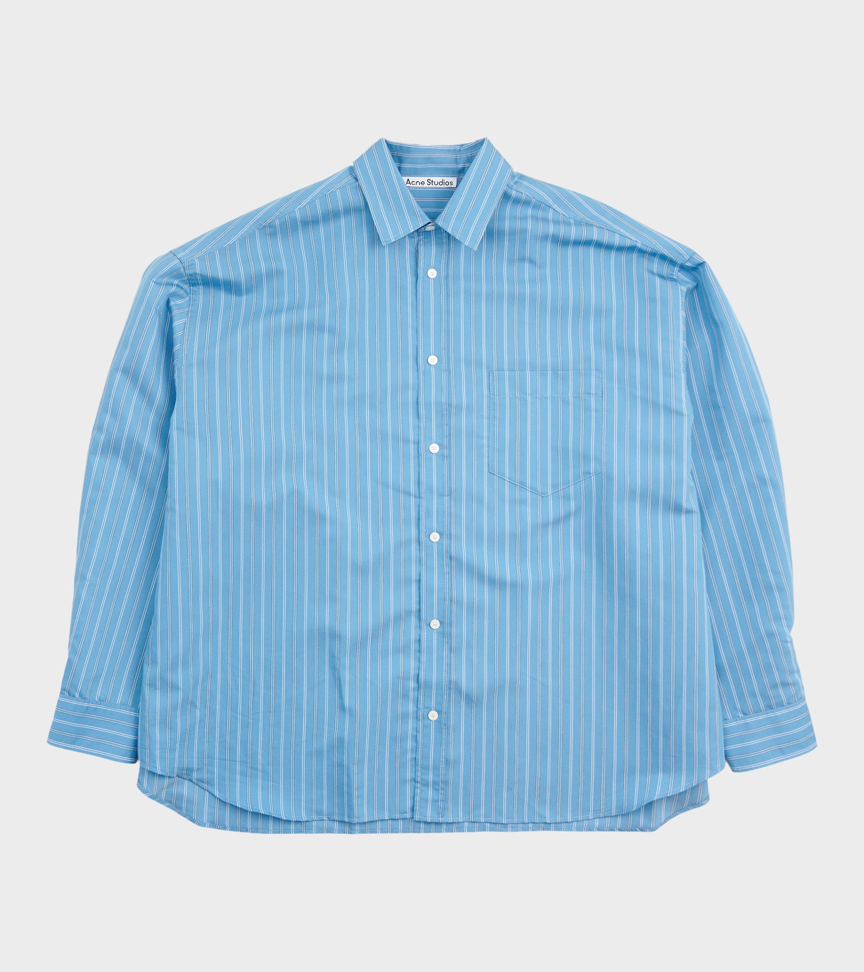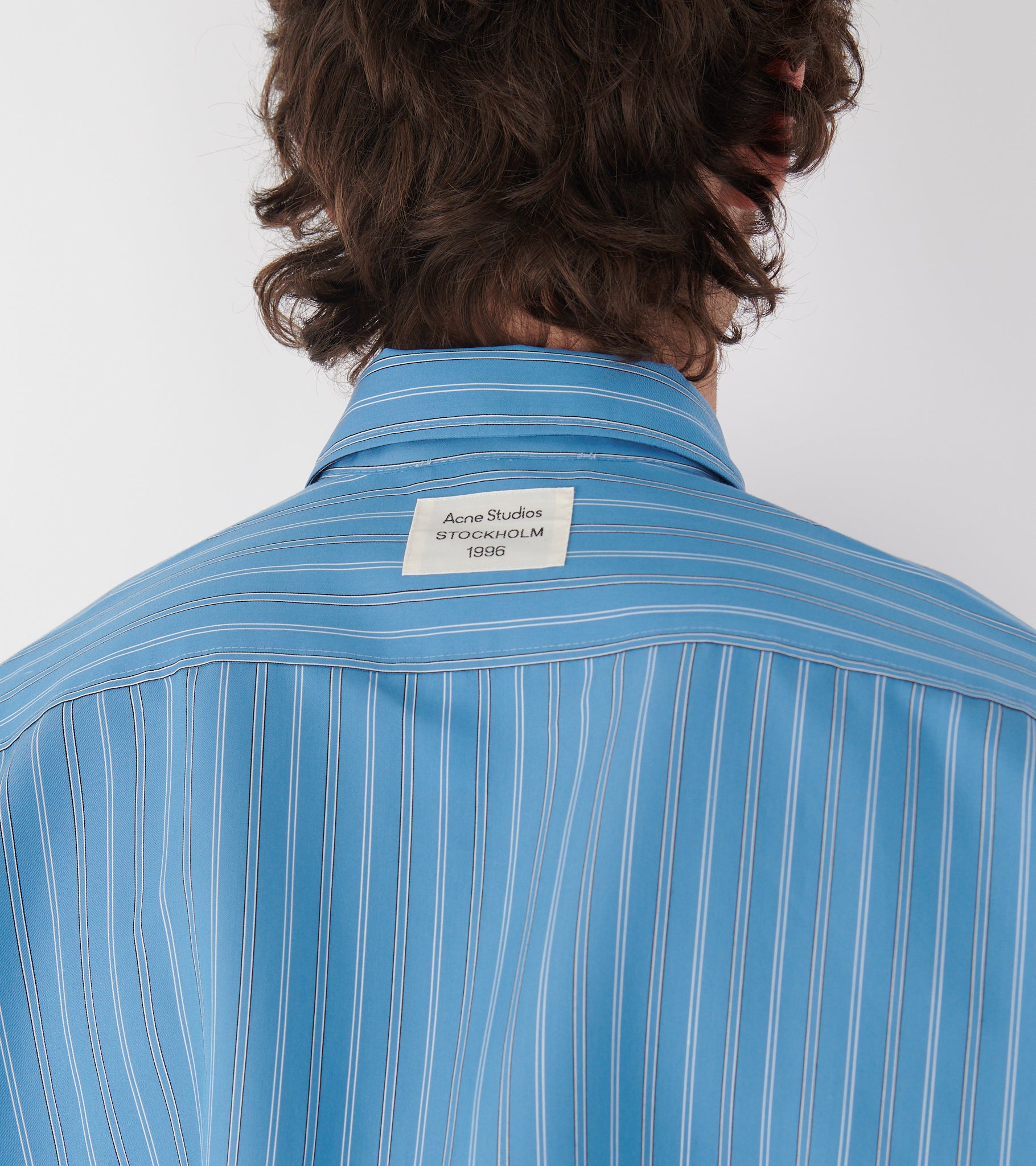 Blå skjorte med tynde hvide og sorte striber fra Acne Studios.