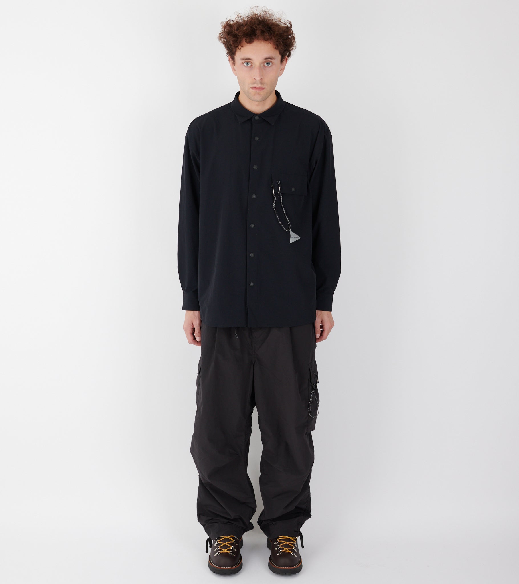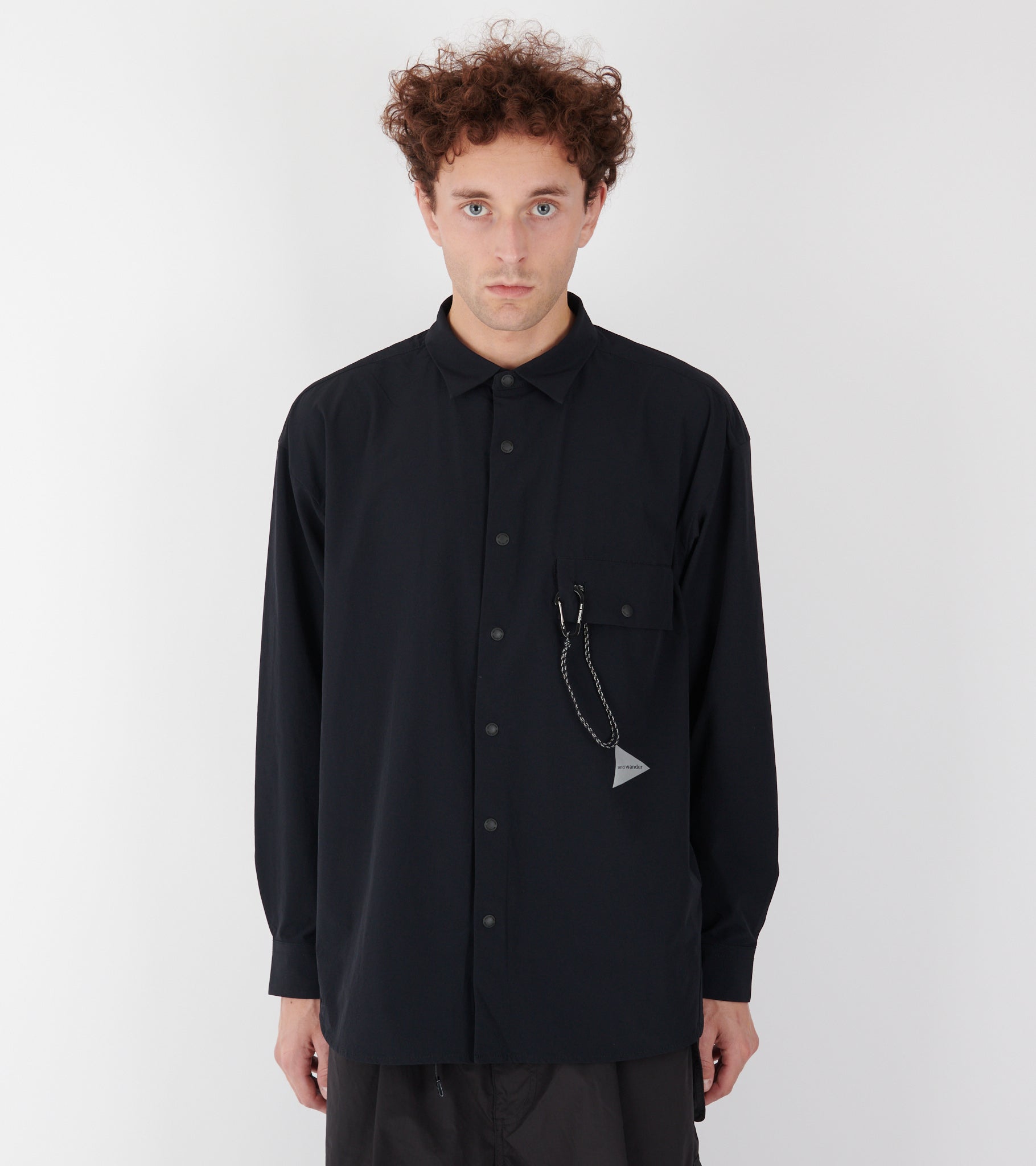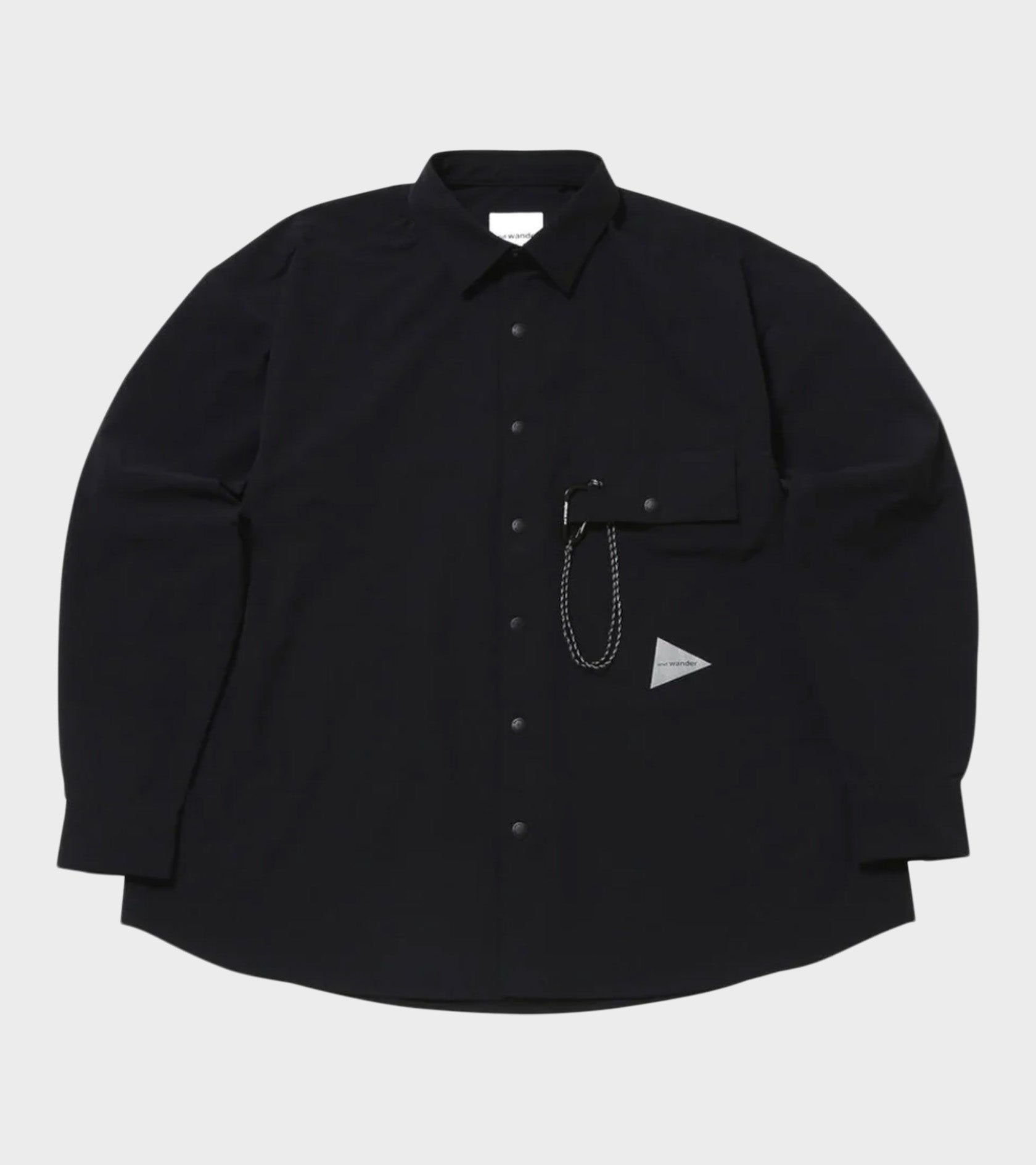 Sort overshirt fra And Wander. Denne overshirt har en klassisk krave og en knaplukning med sorte logoknapper. På brystlommen er en aftagelig karabinhage.