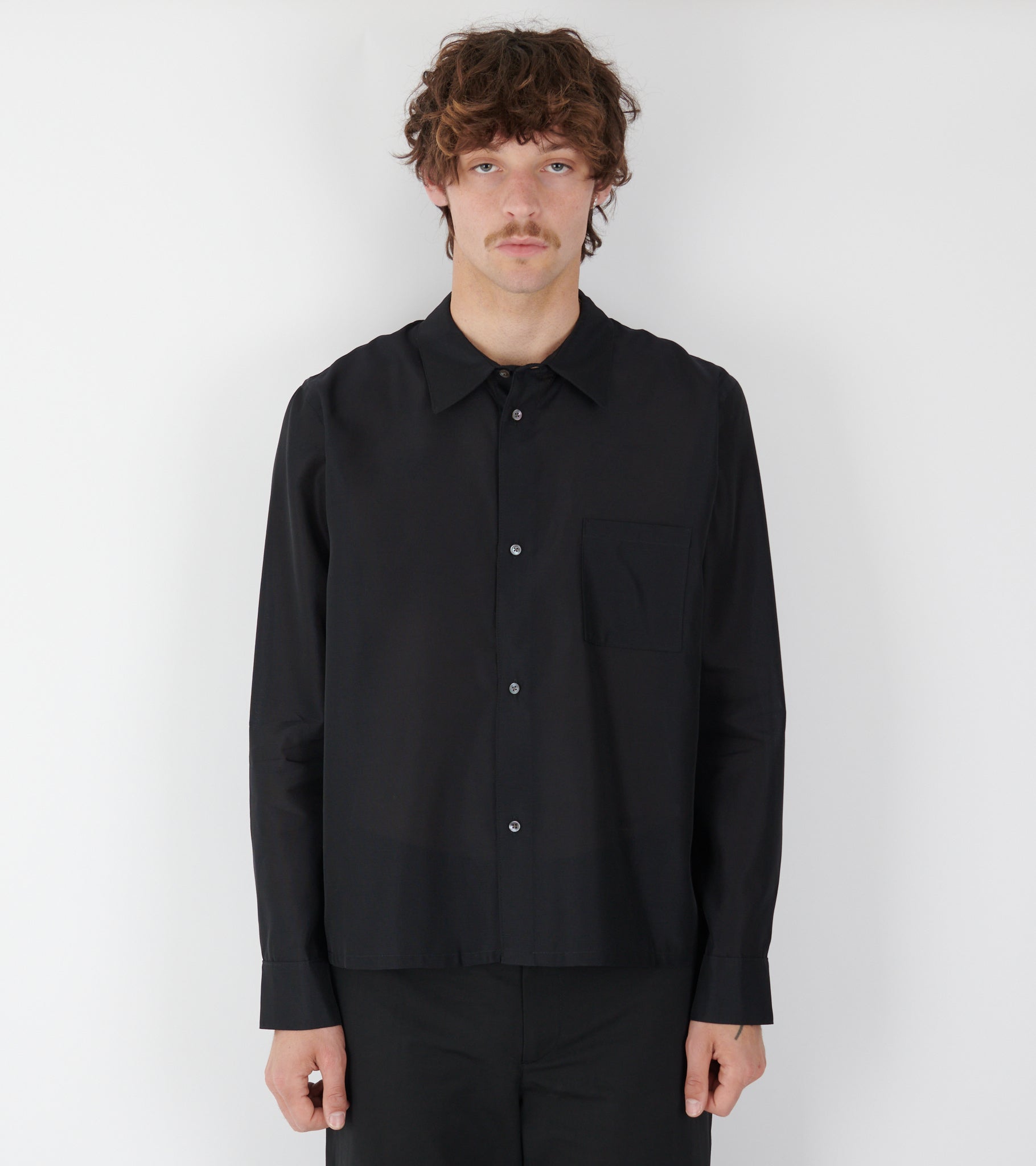 Sort skjorte fra Berner Kühl. Dinner Shirt har en klassisk krave, en brystlomme og en knaplukning med mørkegrå perlemorsknapper. Skjorten er fremstillet i en see through deadstock kvalitet, bestående af silke og uld.
