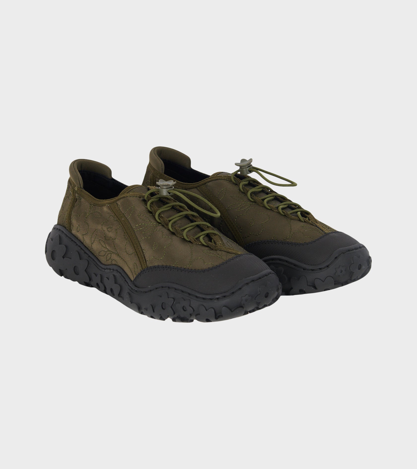 Olivengrønne sneakers fra Cecilie Bahnsen. Alina Sneakers har en overdel i polyester-satin med broderede blomster. Skoen har overlays i læder, en quicklace-lukning med et blomster-spænde samt en blomstret chunky sort ydersål.