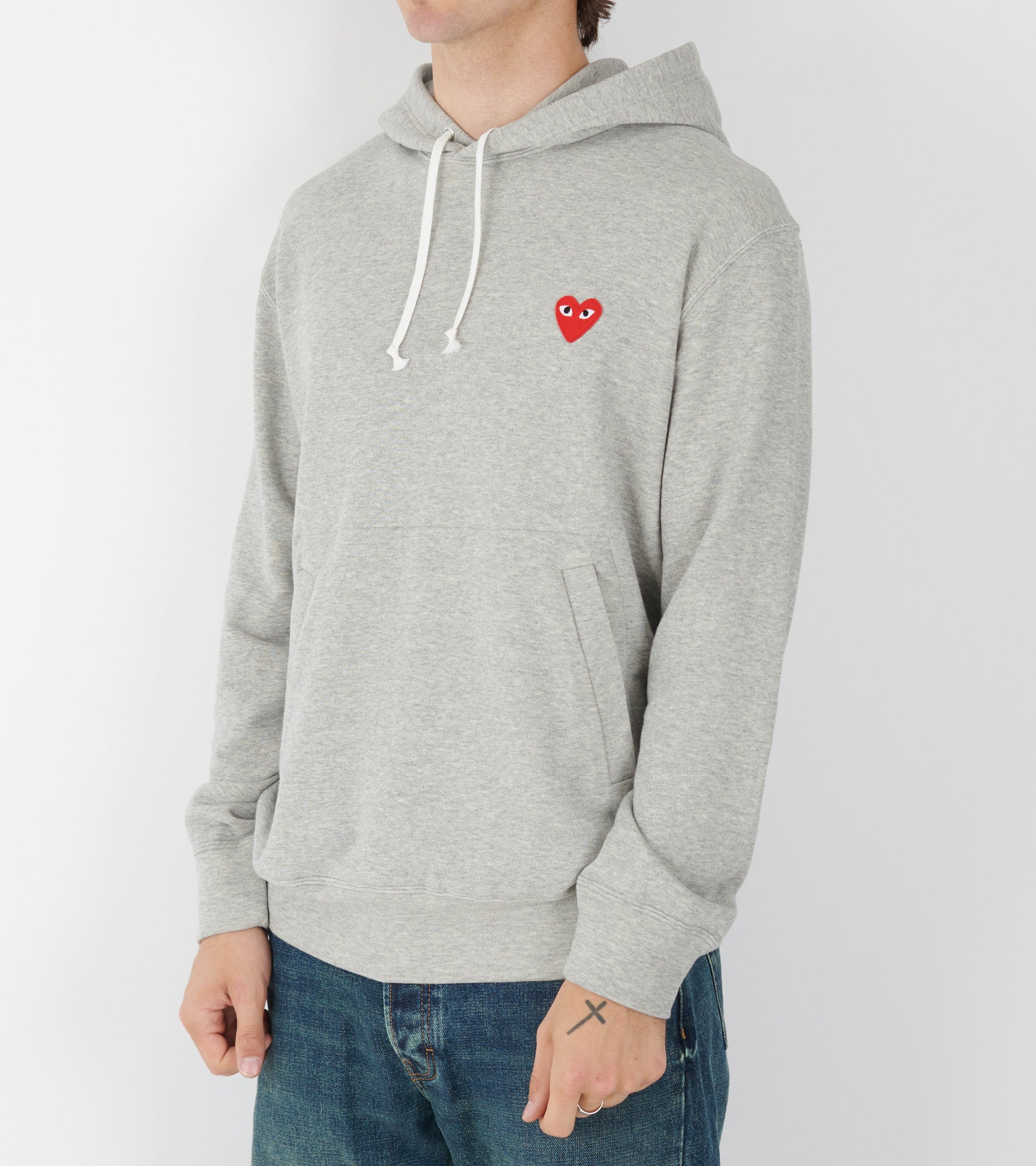 Grå unisex hættetrøje med det karakteristiske hjerte fra Comme des Garcons Play. Hættetrøjen har en klassisk hætte med snore og en kængurulomme på fronten. Ved venstre bryst er hjertet broderet i rød.