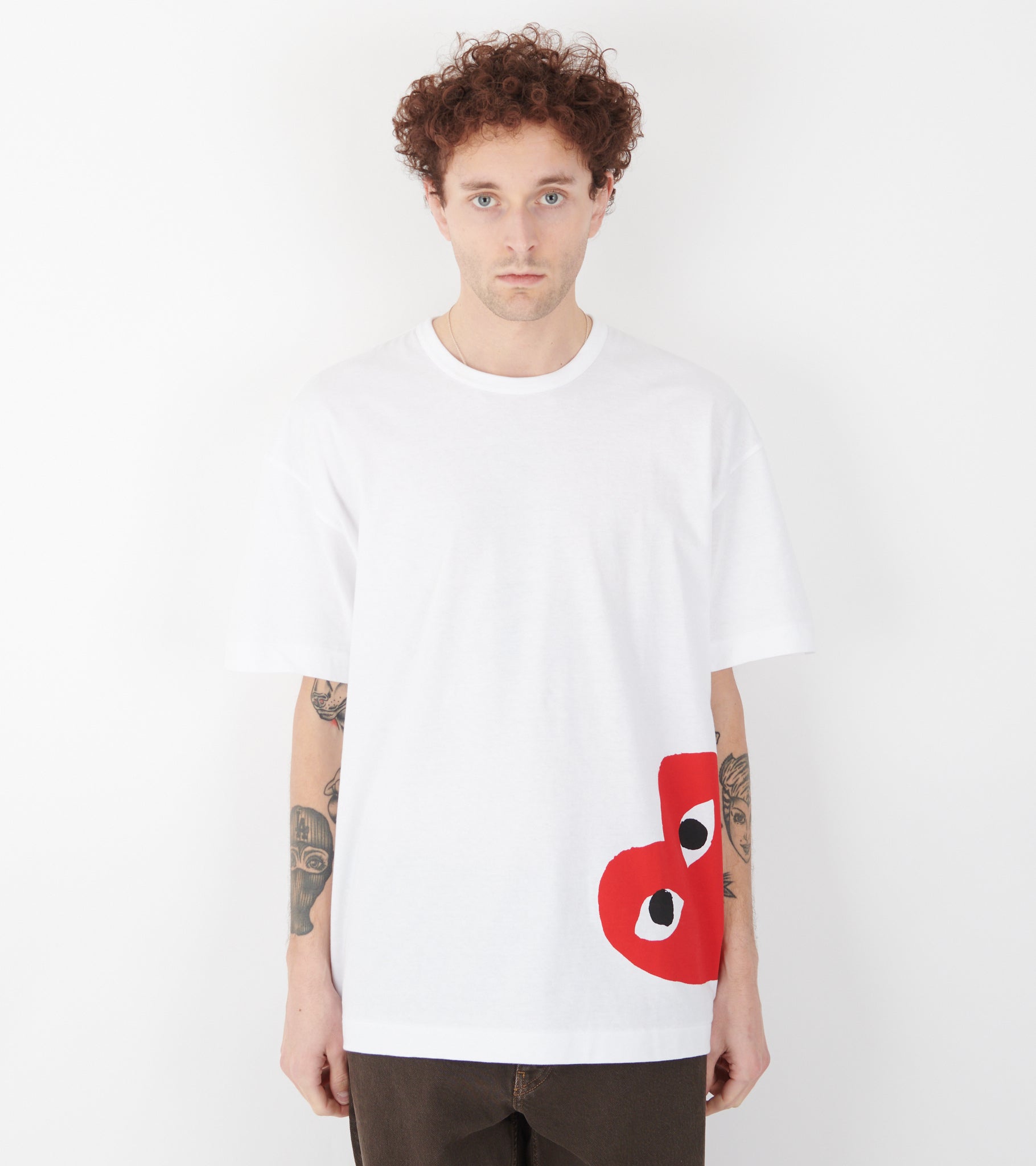 Hvid oversize unisex t-shirt fra Comme des Garcons PLAY med mærkets karakteristiske hjerte med øjne. Det ikoniske hjerte med øjnene fra PLAY er designet af Filip Pagowski og er gennemgående på alle PLAY produkter. Denne t-shirt har et stort printet rødt hjerte på fronten.