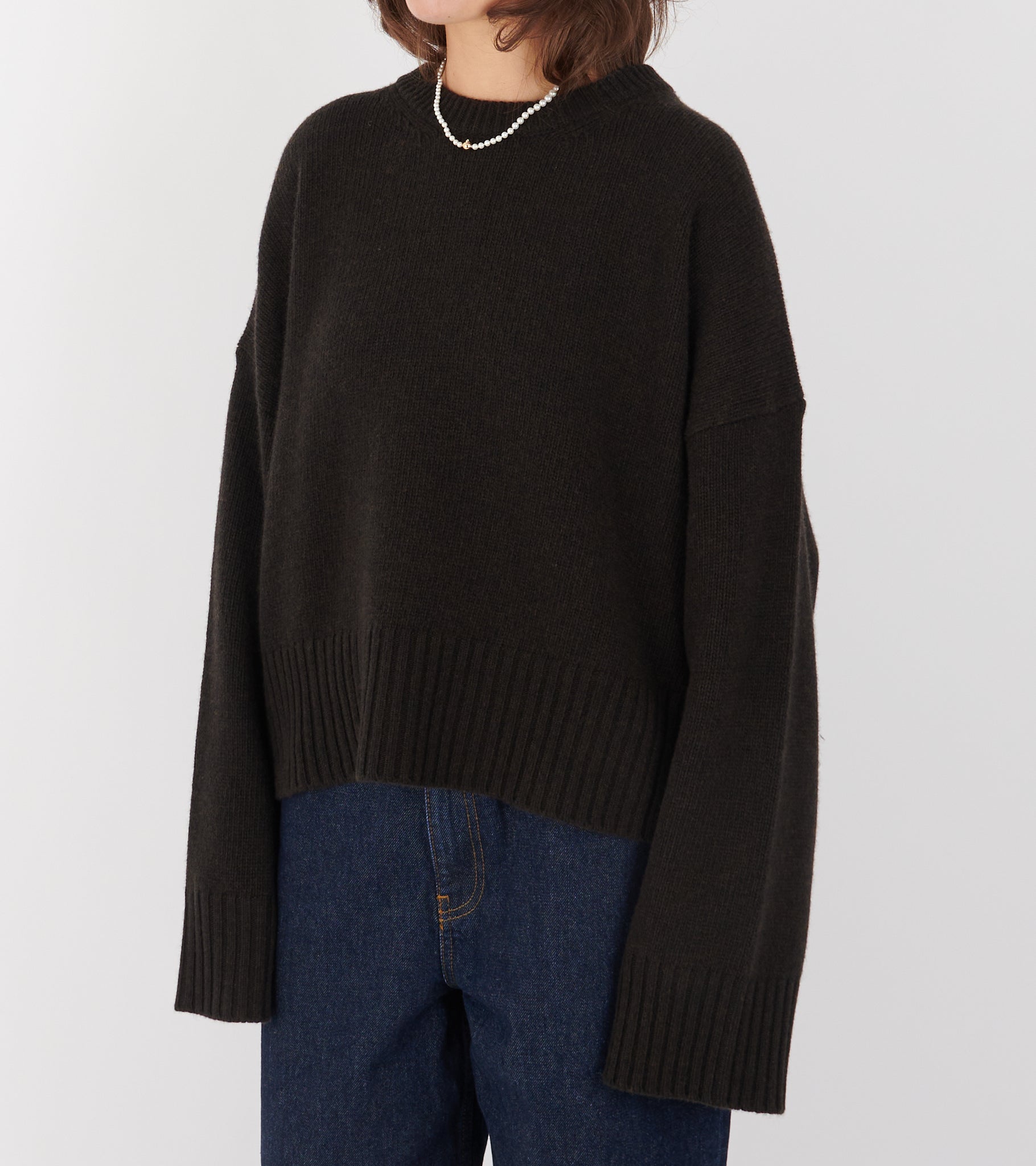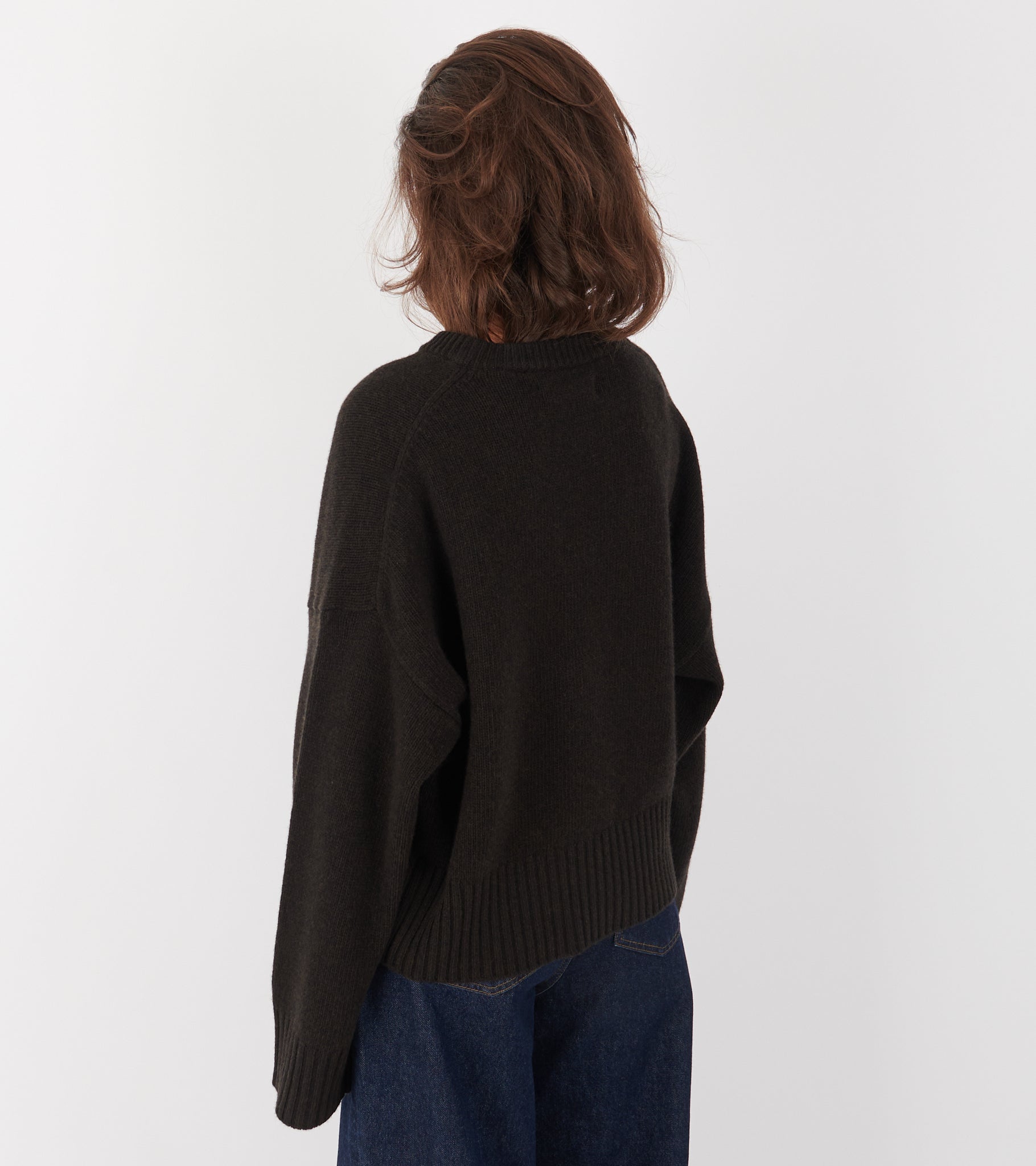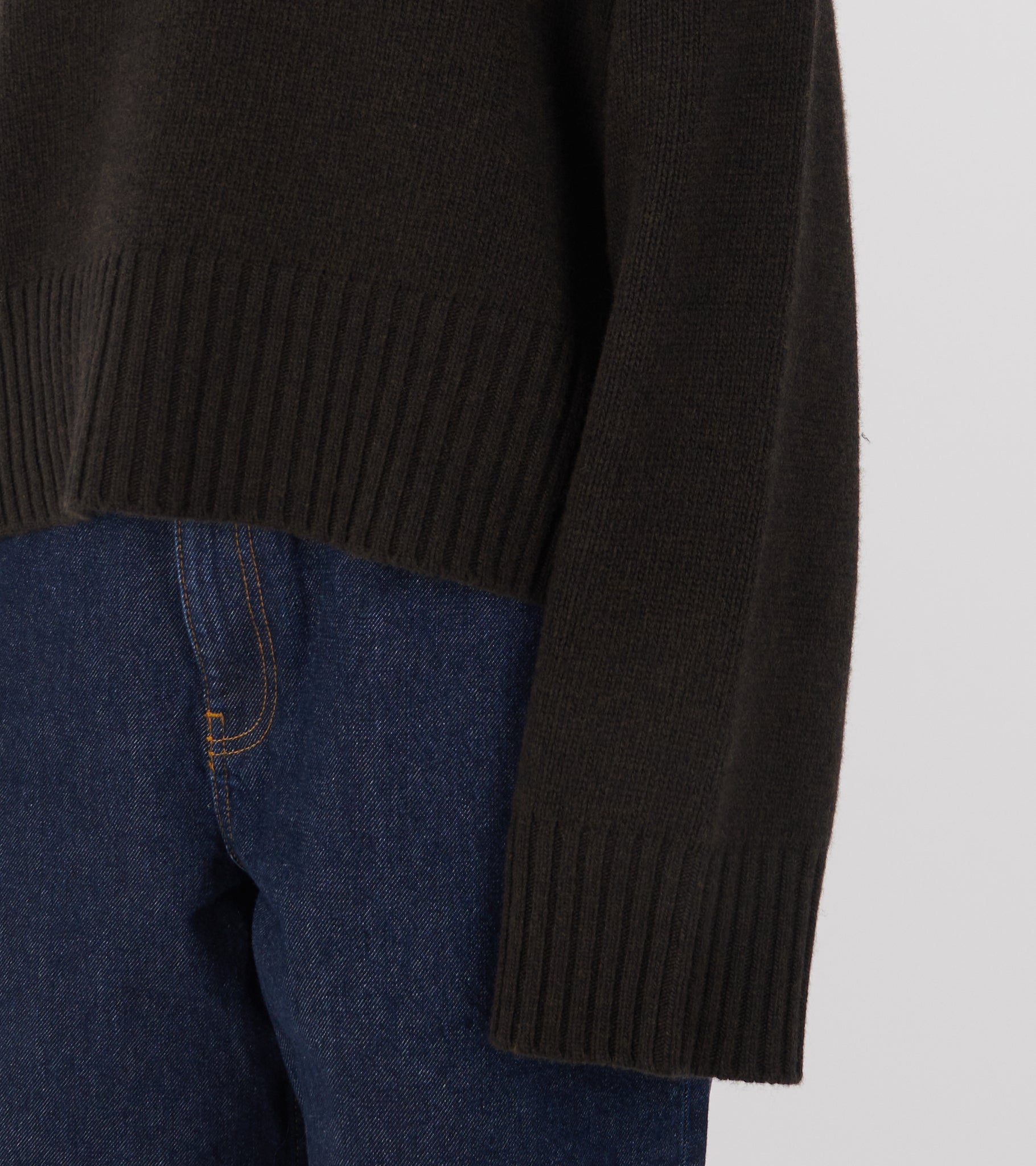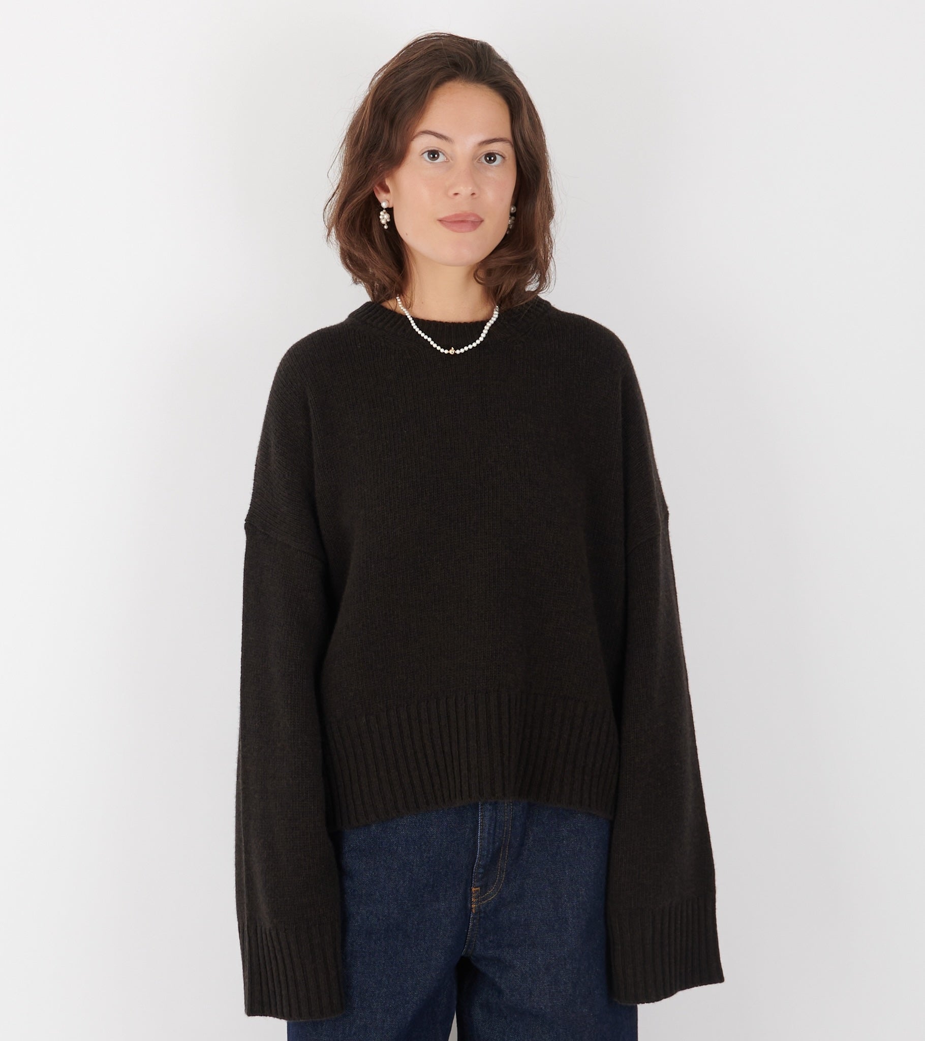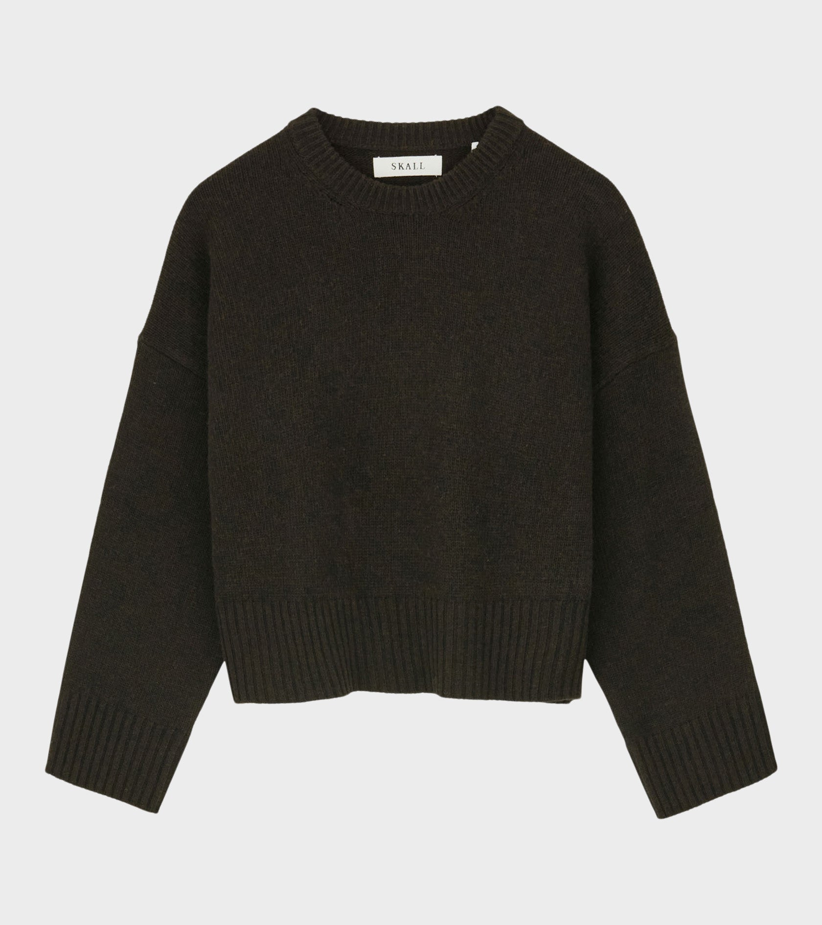 Mørkebrun strik i merinould fra Skall Studio. Campa Jumper har ribstrikkede kanter, en rund hals samt sænkede skuldre.
