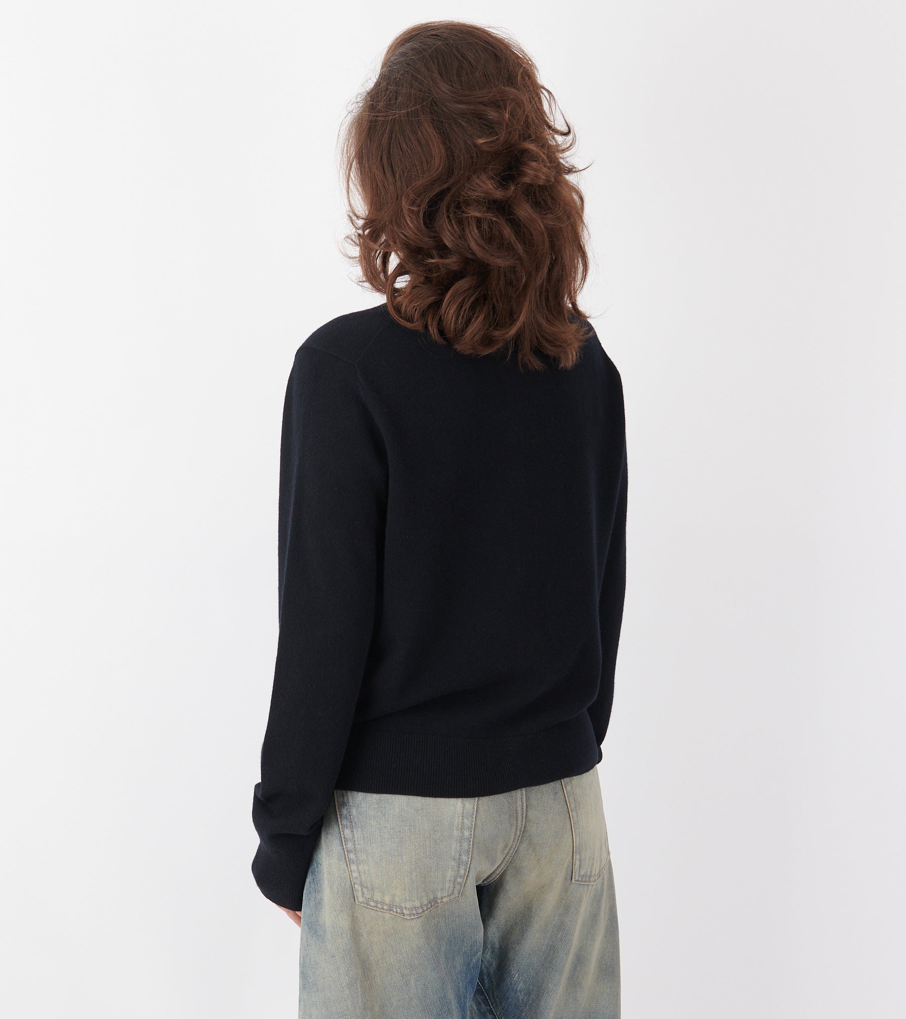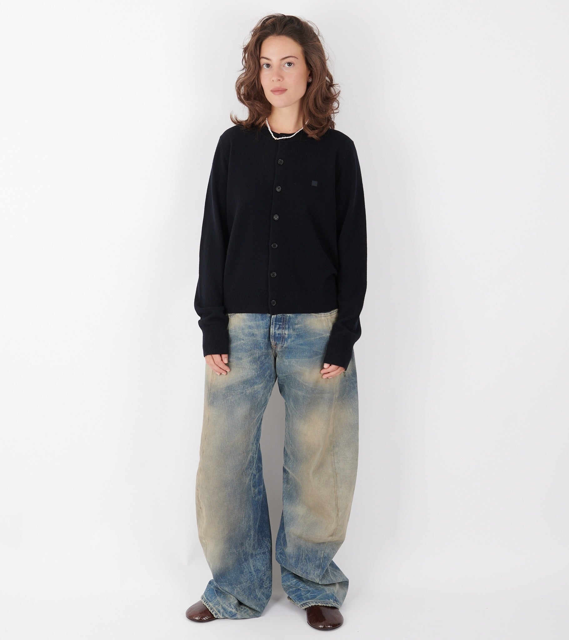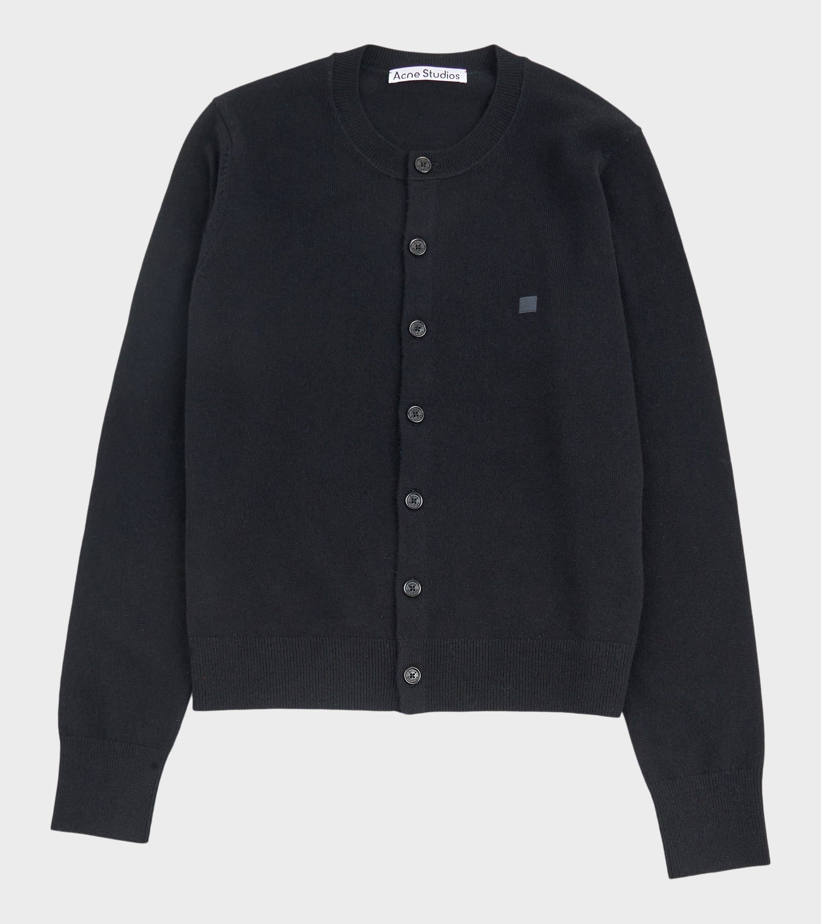 Sort cardigan i uld fra Acne Studios. Denne cardigan har en rund hals og en knaplukning med sorte logo-knapper. Ved venstre bryst er et lille broderet Acne Studios Face logo.