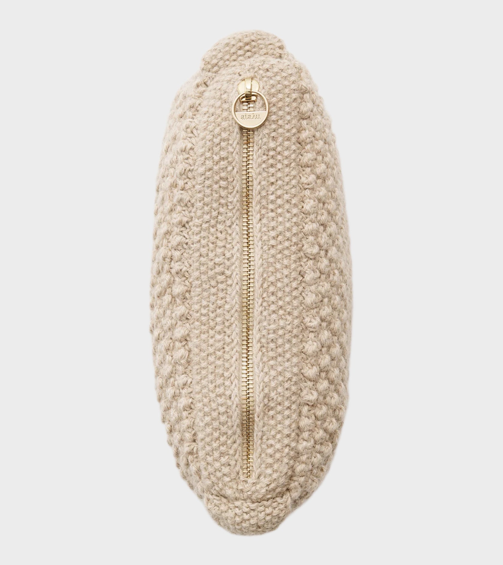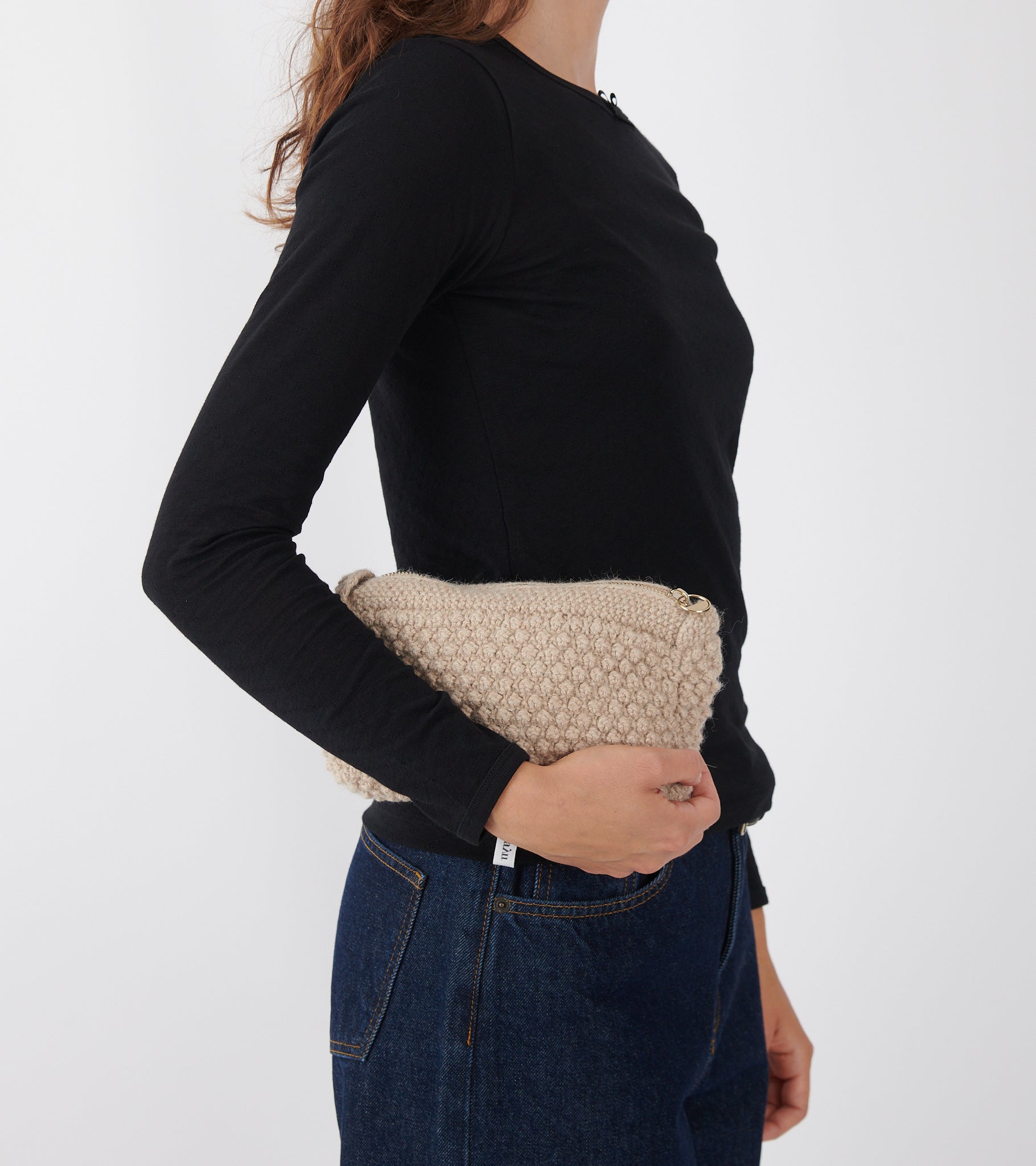 Beige håndstrikket clutch fra Aiayu. Helen Classic Clutch Wheat er fremstillet i boblestrikket lamauld og har en guld lynlåslukning. I foret er initialerne broderet af den kvinde, der har håndstrikket den.