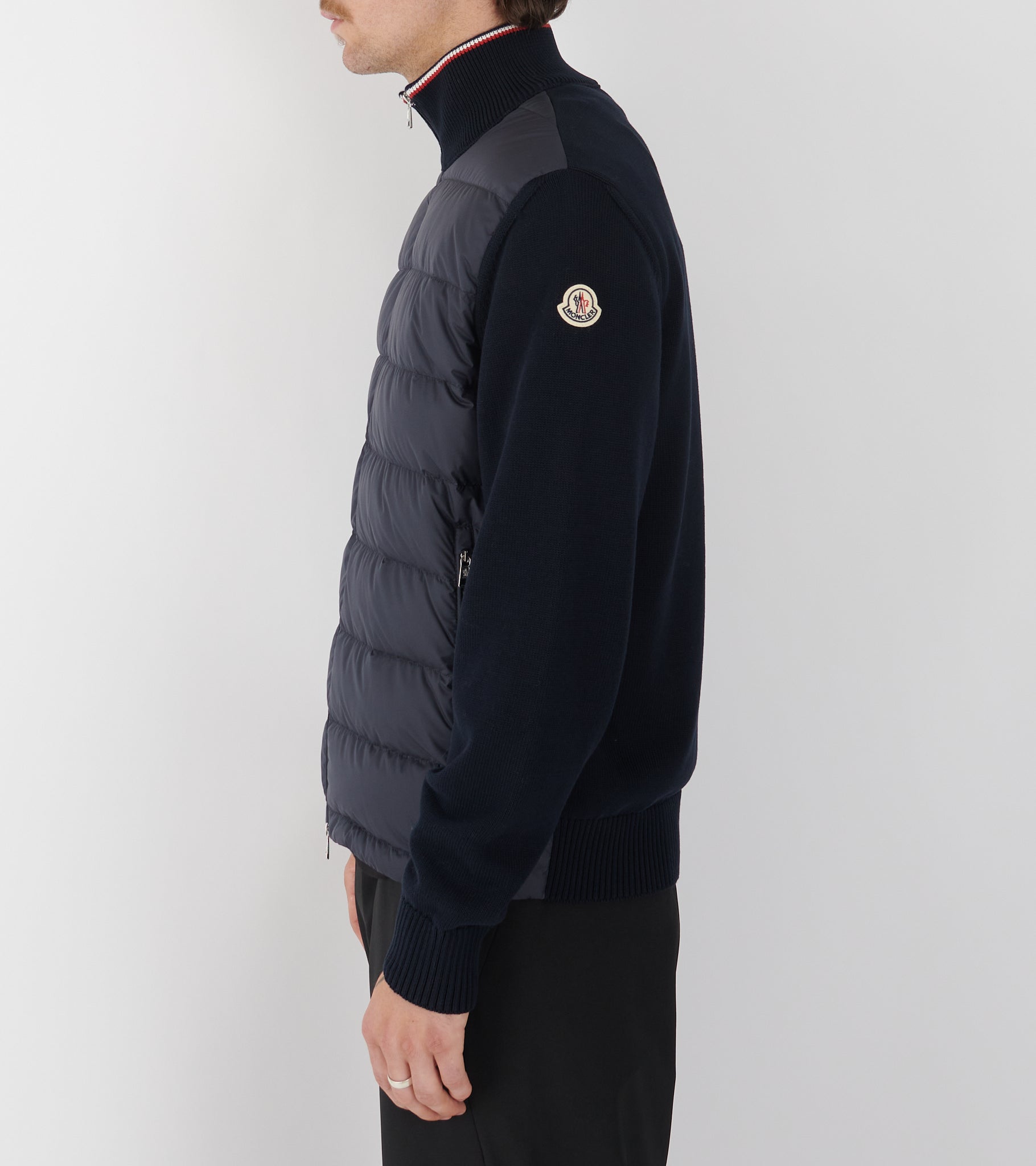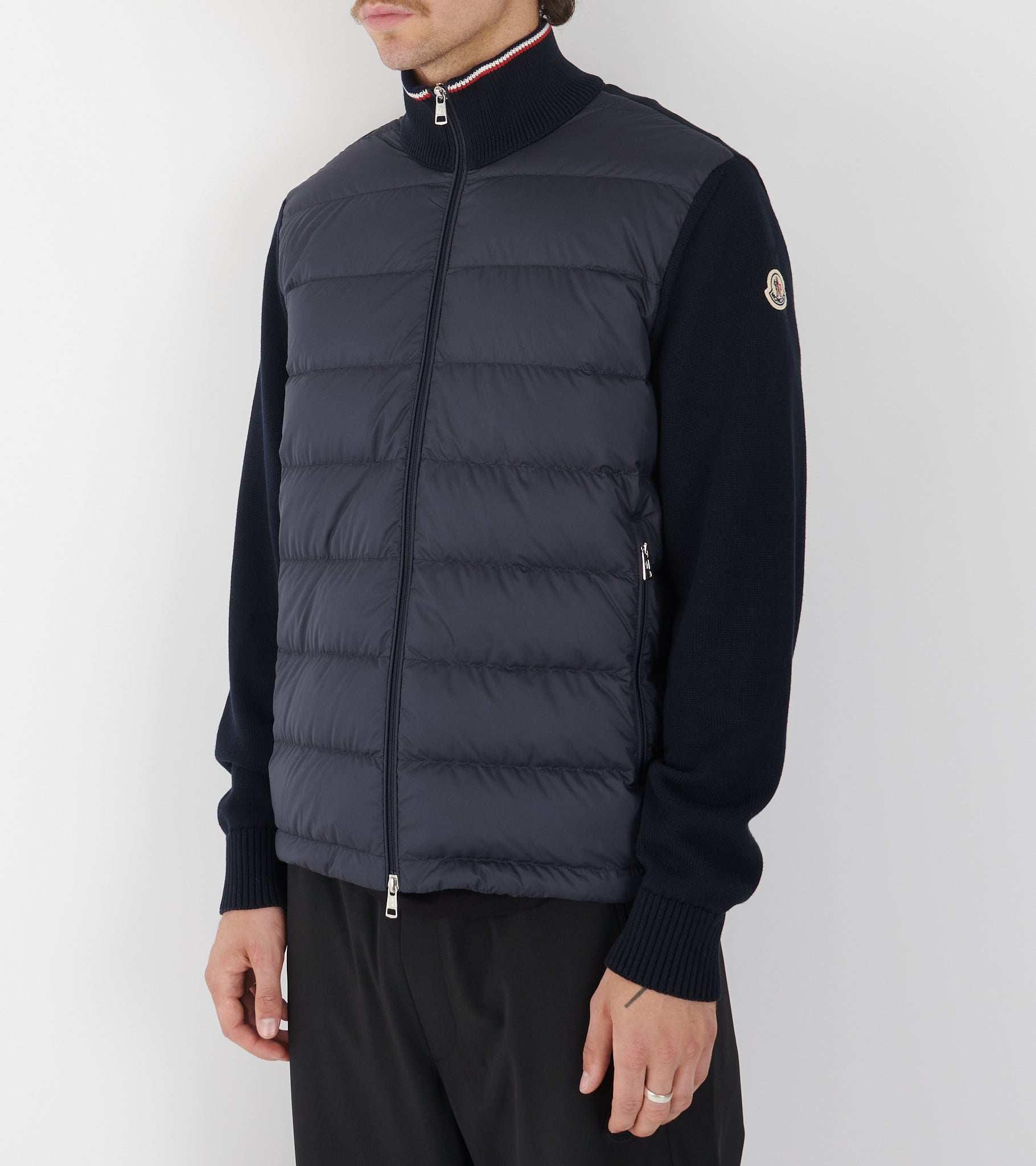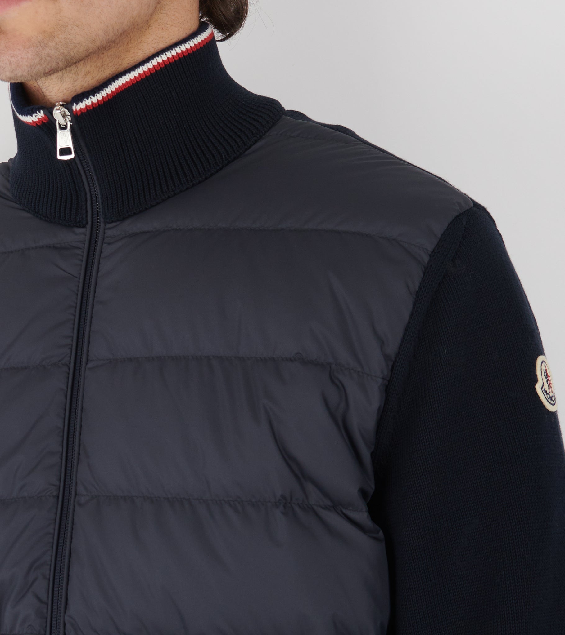 Cardigan Tricot i navy fra Moncler. Denne jakke er fremstillet i bomuldsgarn og har en front i polyester - fronten er foret med bløde dun og fjer. Jakken har en dobbeltgående lynlåslukning samt Tricolor Stripes øverst ved kraven. På venstre ærme er det ikoniske logo i filt.
