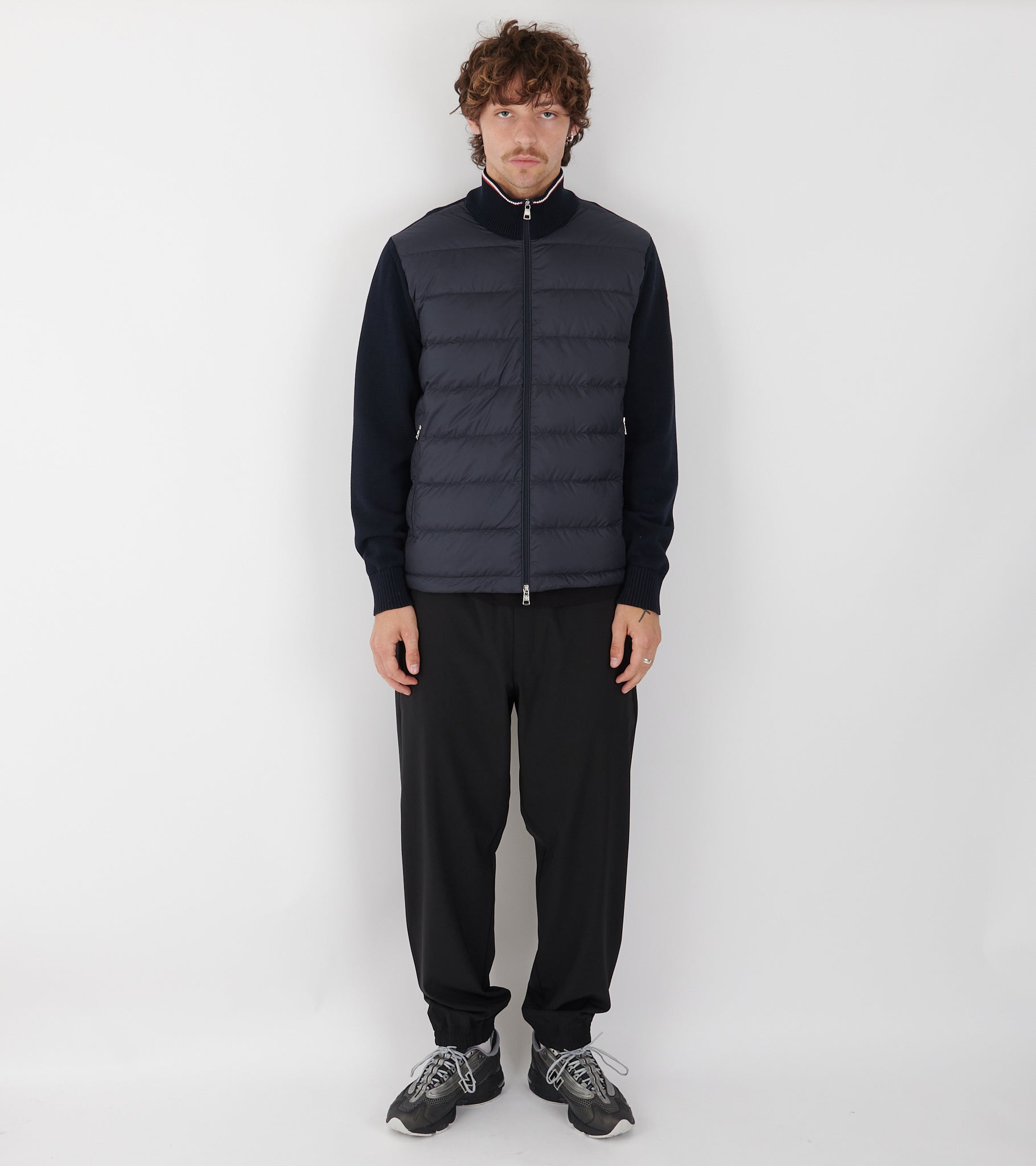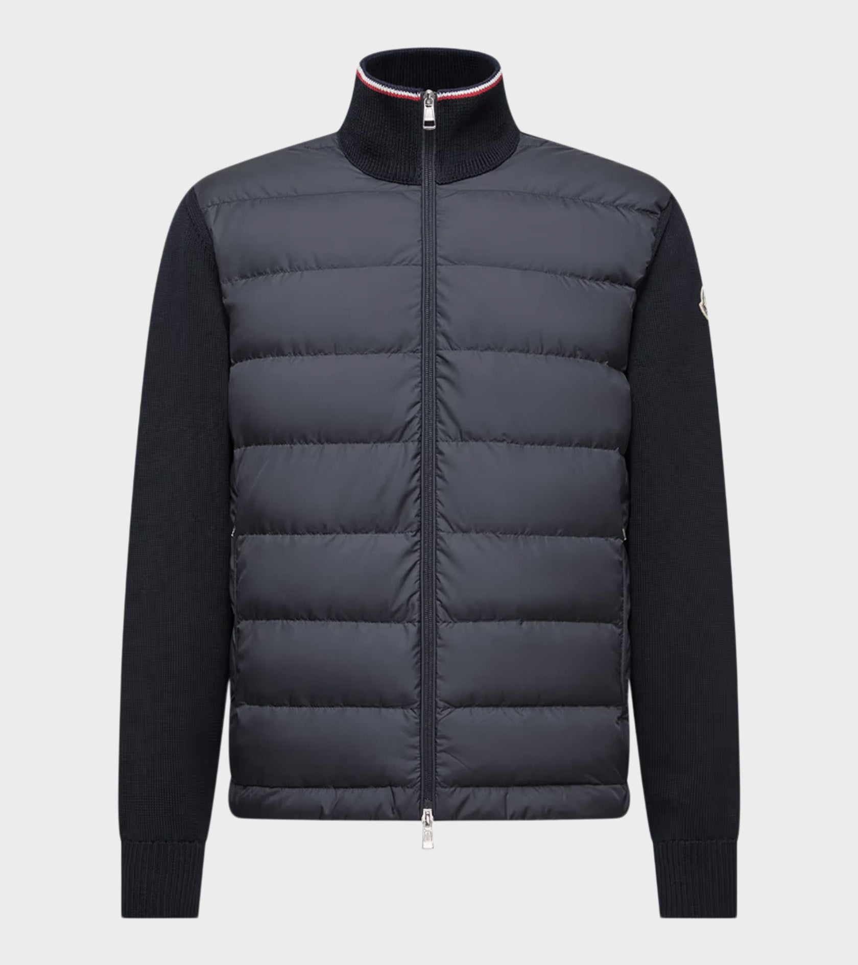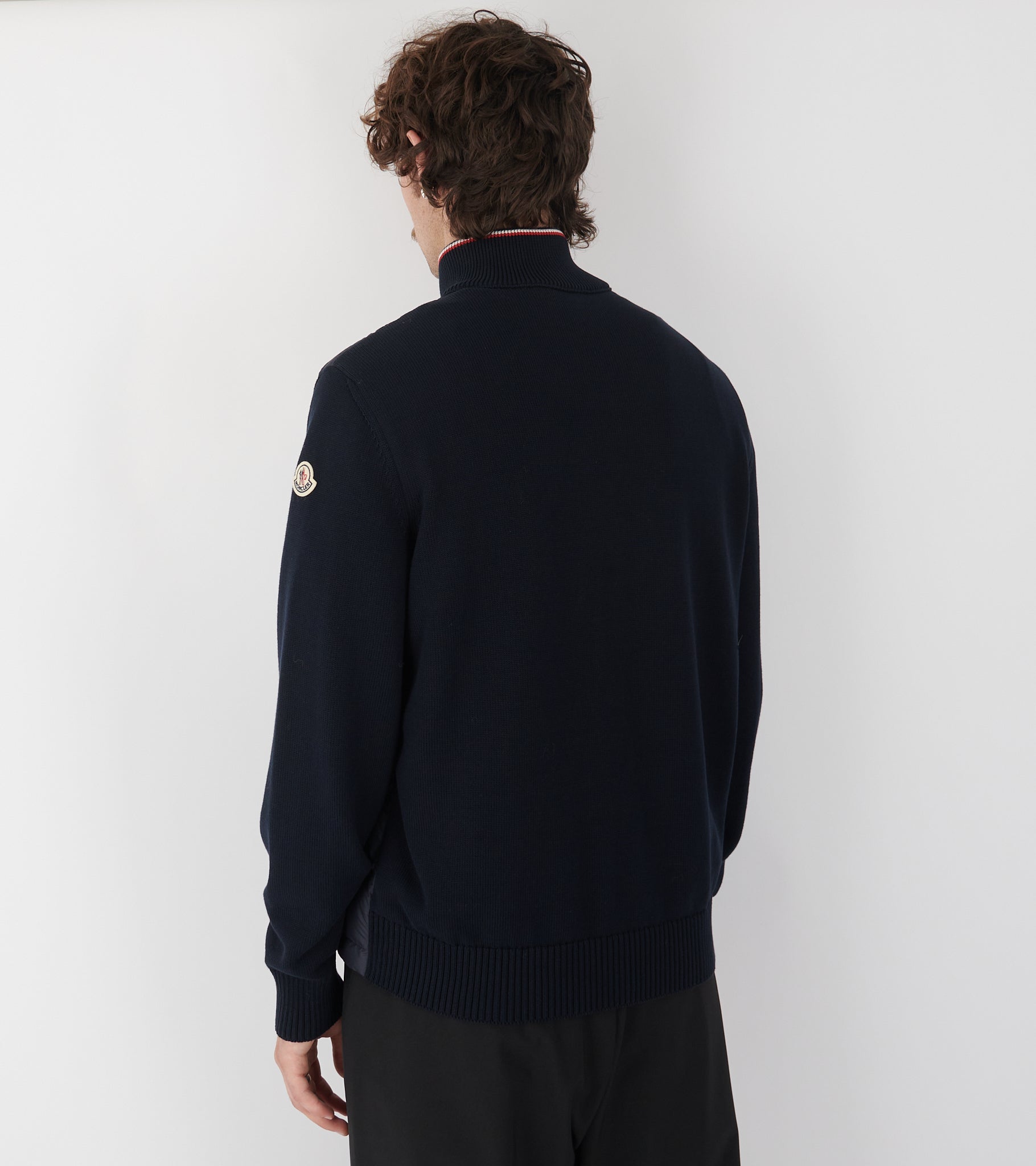Cardigan Tricot i navy fra Moncler. Denne jakke er fremstillet i bomuldsgarn og har en front i polyester - fronten er foret med bløde dun og fjer. Jakken har en dobbeltgående lynlåslukning samt Tricolor Stripes øverst ved kraven. På venstre ærme er det ikoniske logo i filt.