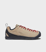 Klatre-inspirerede sneakers i beige ruskind fra Keen. Jasper Sneakers har en fodseng i kork og latex, som former sig efter foden. Den har runde røde snørebånd som går helt ud til tåen og en sort ydresål i gummi. På siden samt tungen er et diskret præget logo.