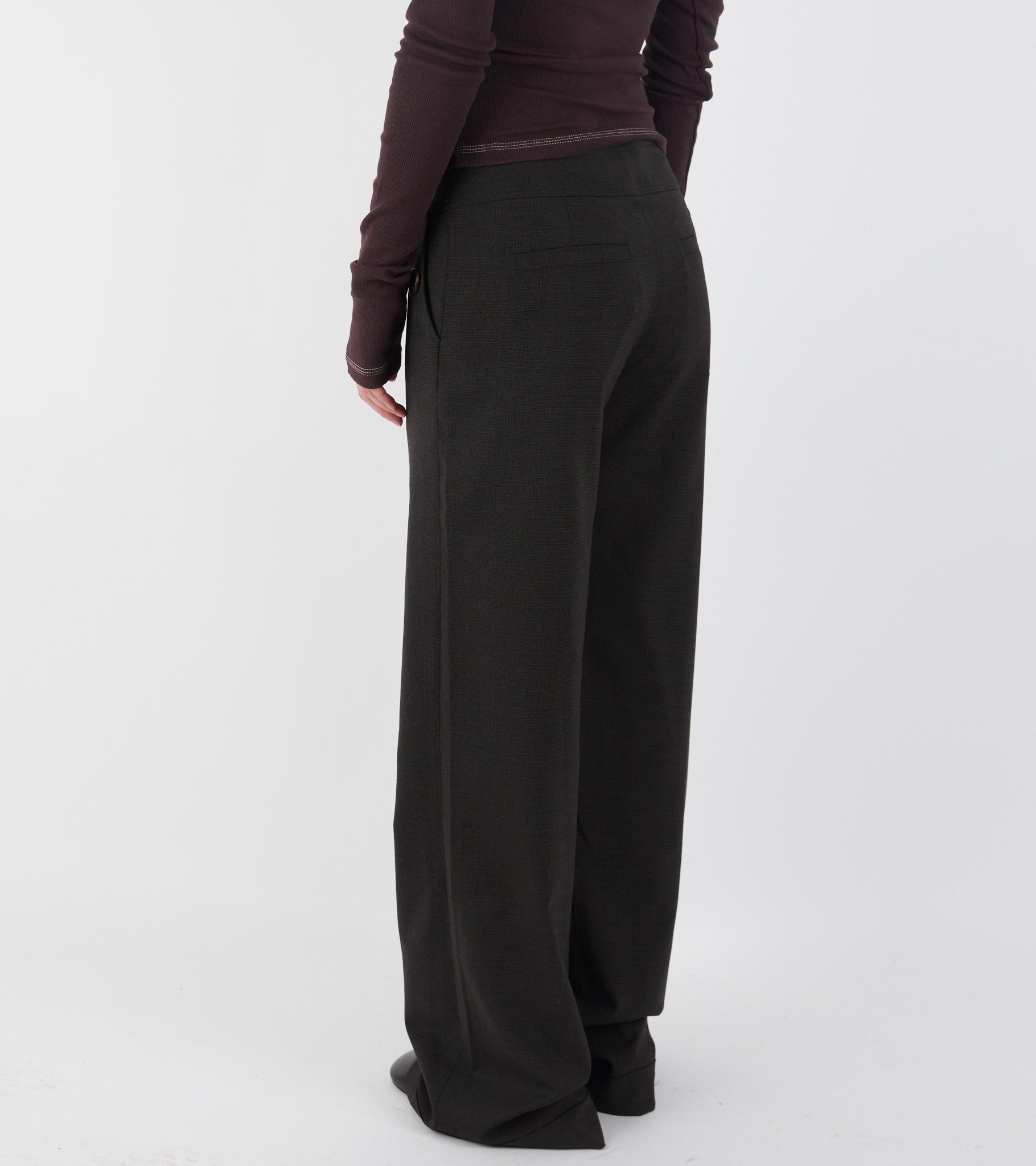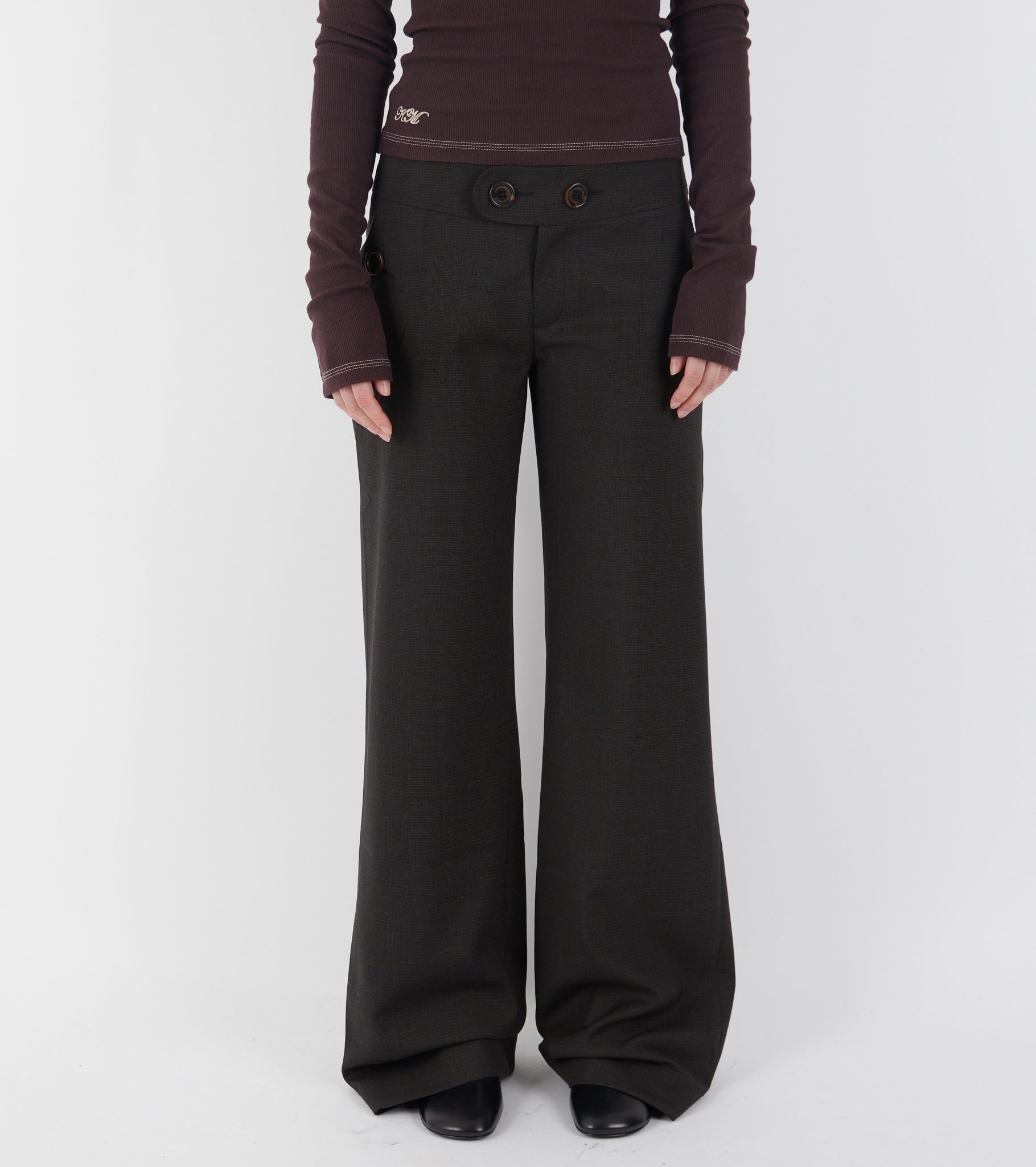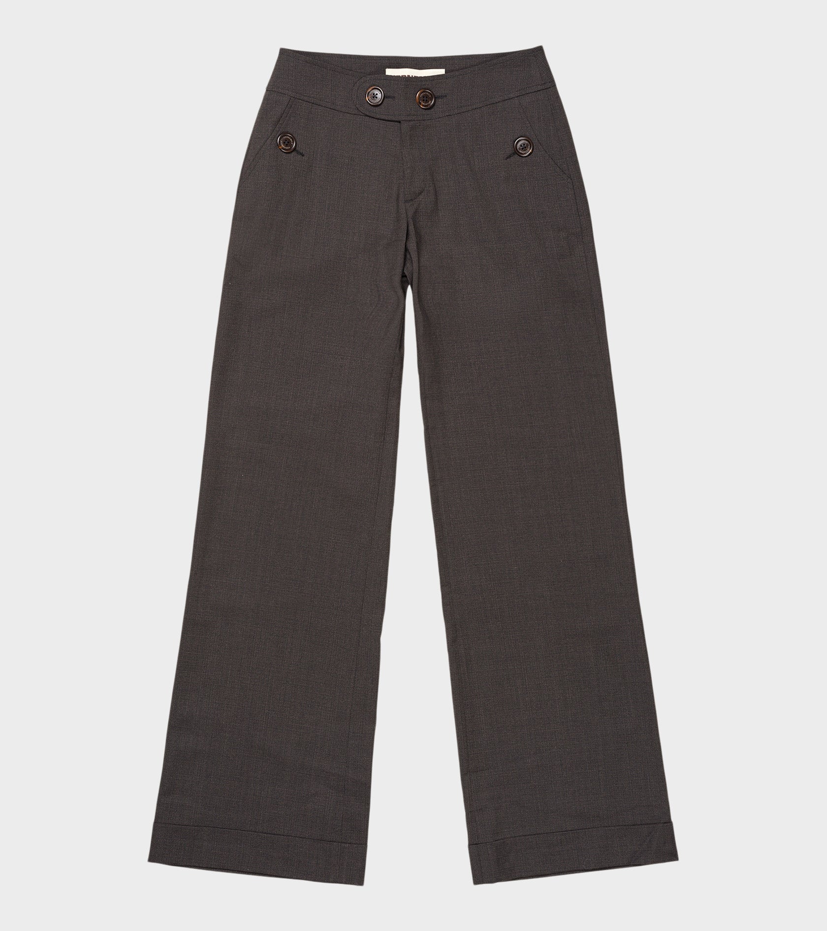 Jenni Pants fra Kernemilk. Bukserne er fremstillet i en brun/sort uldblanding og har en lav talje, lige ben samt knapdetaljer øverst.