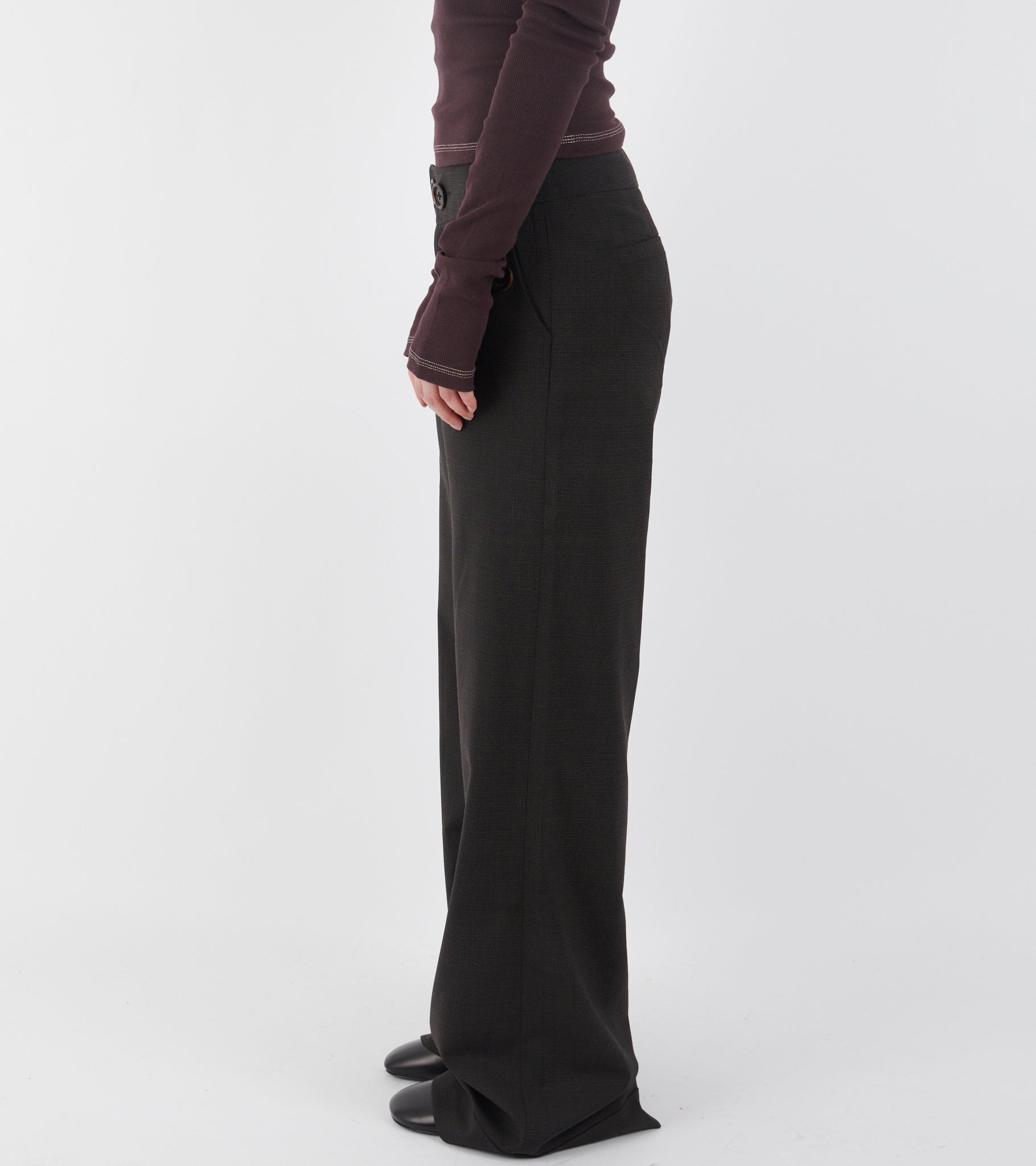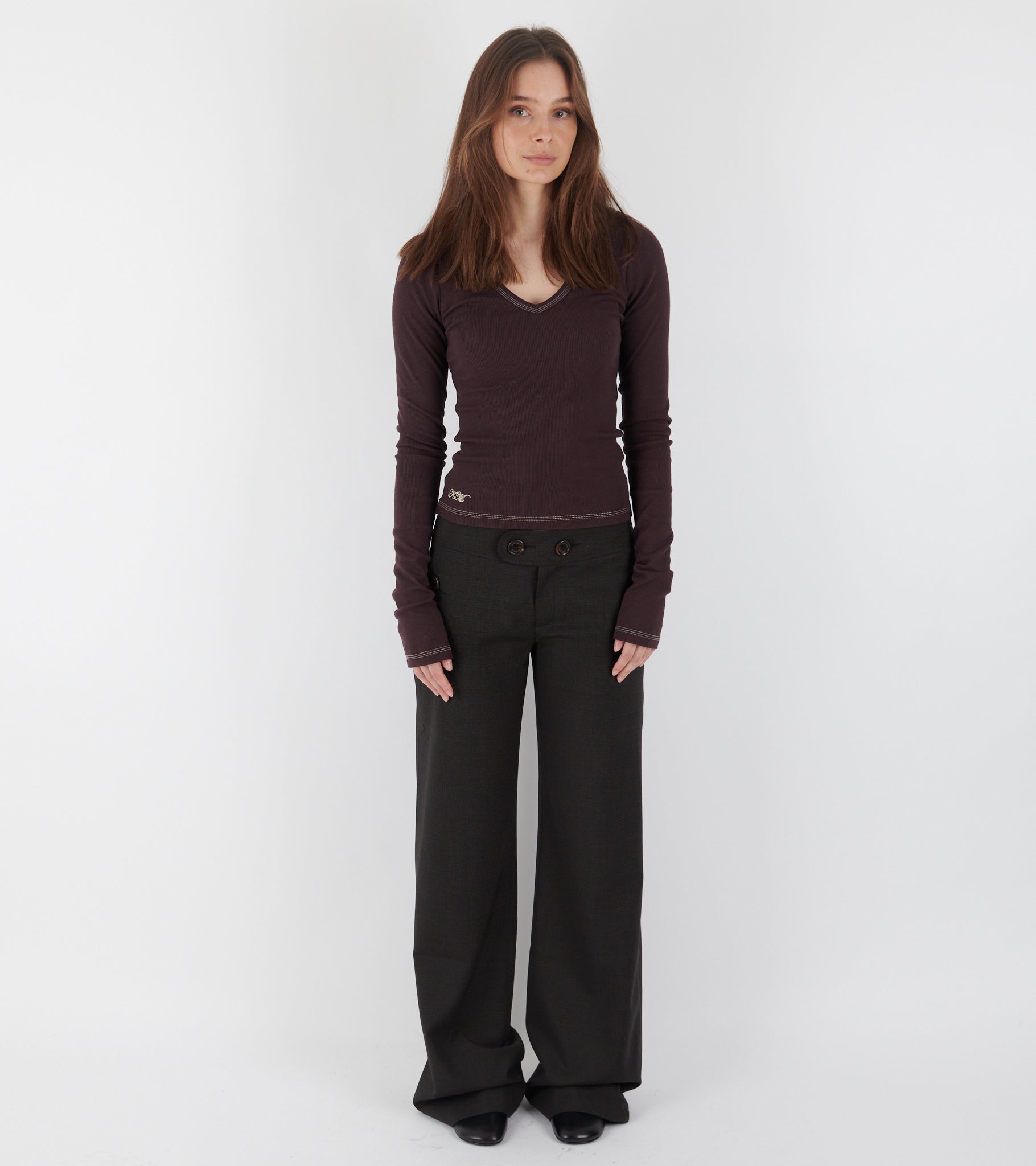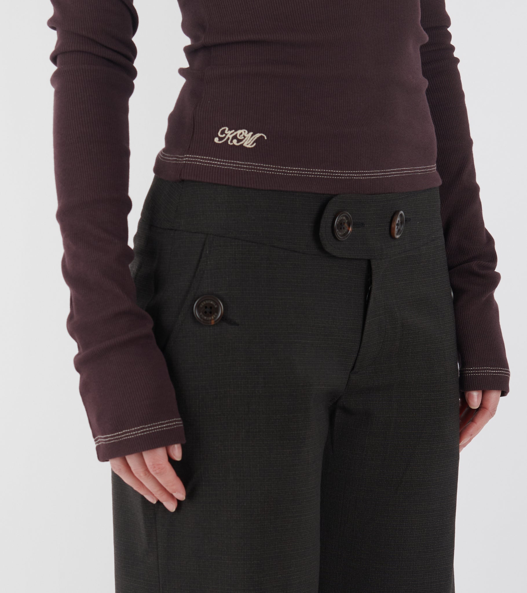 Jenni Pants fra Kernemilk. Bukserne er fremstillet i en brun/sort uldblanding og har en lav talje, lige ben samt knapdetaljer øverst.