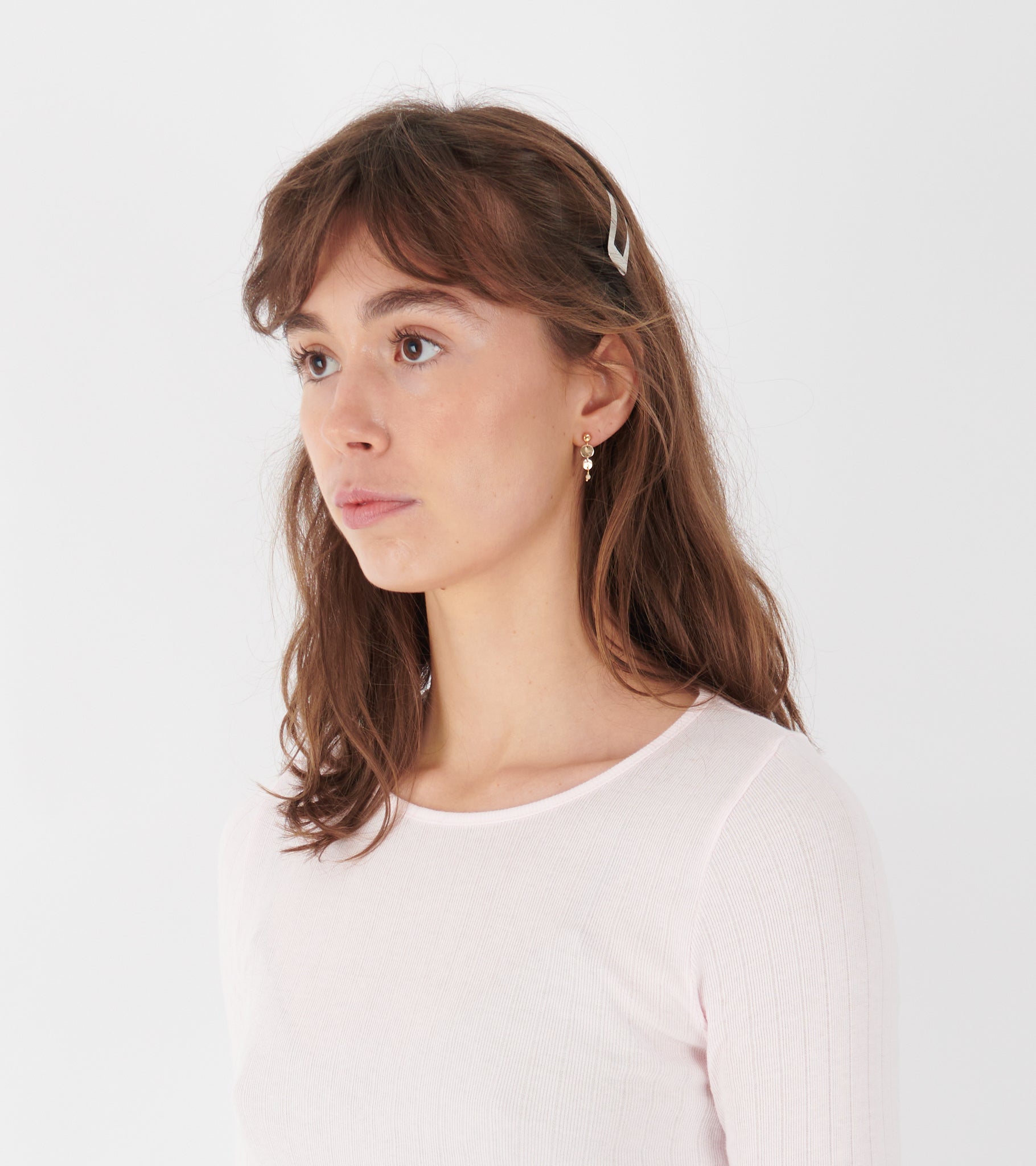 Guldbelagt ørering med to bankede vedhæng samt en lille lyserød sten fra Leleah.