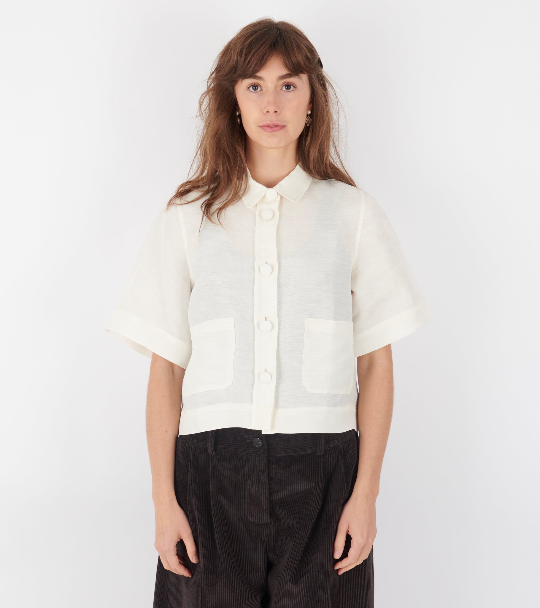 Off white kortærmet skjorte fra Mati Mati. Skjorten er produceret af dead stock fra de store modehuse.