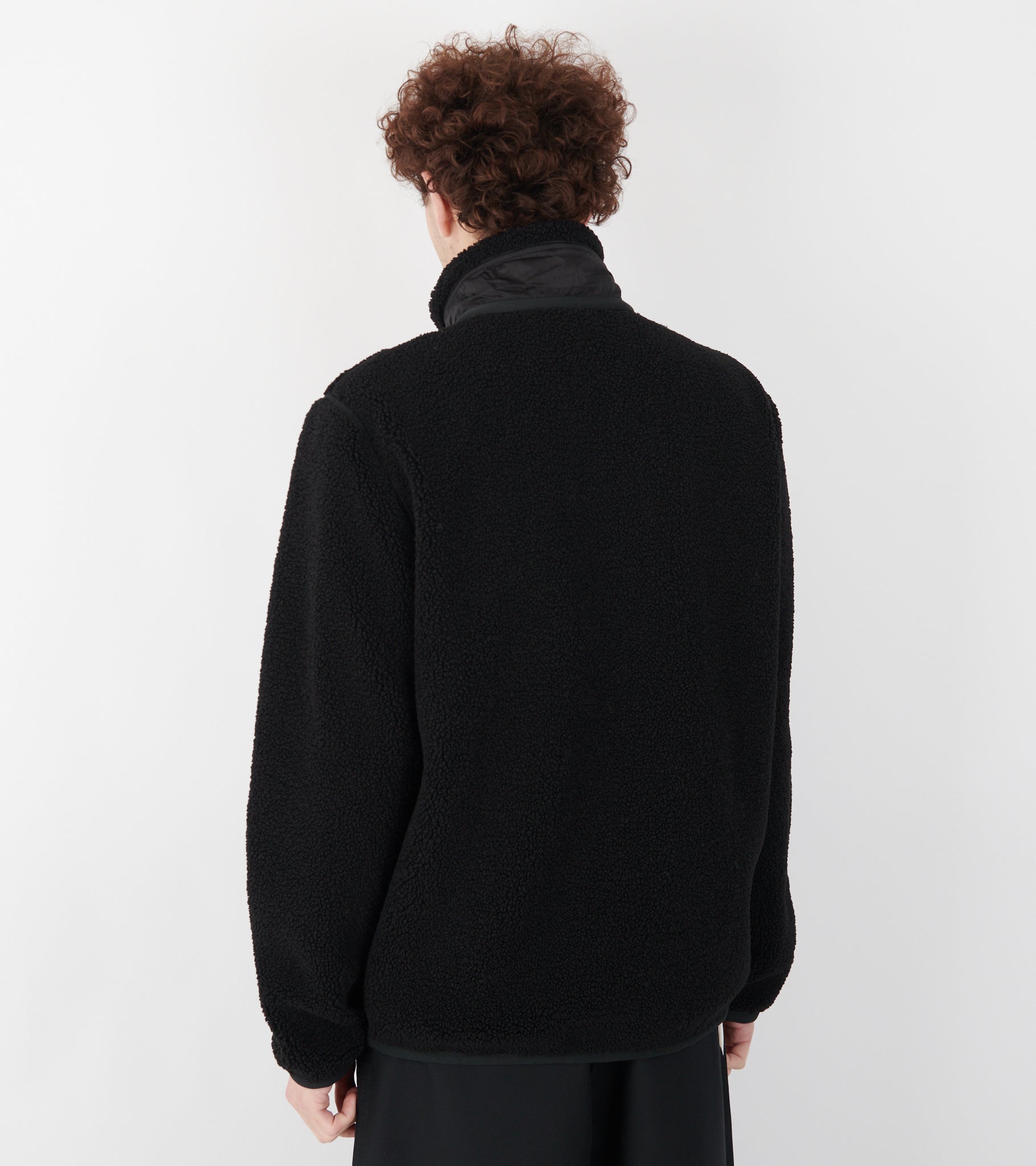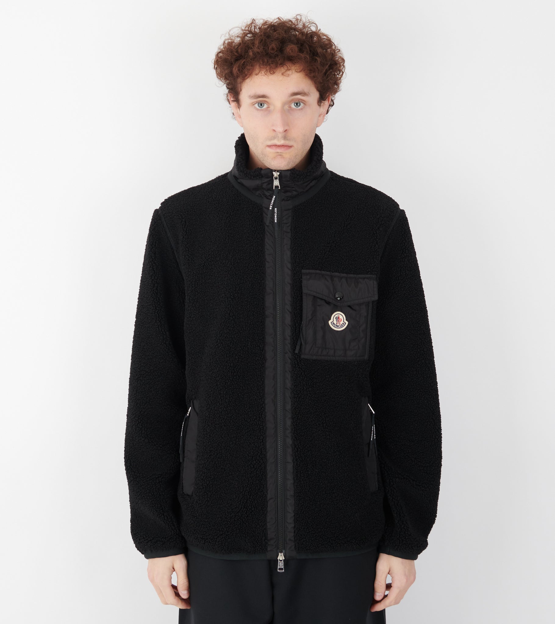 Sort jakke i teddy-fleece fra Moncler. Jakken har en høj hals, nylon-detaljer, en dobbeltgående lynlåslukning, en skrålomme i hver side samt en brystlomme.