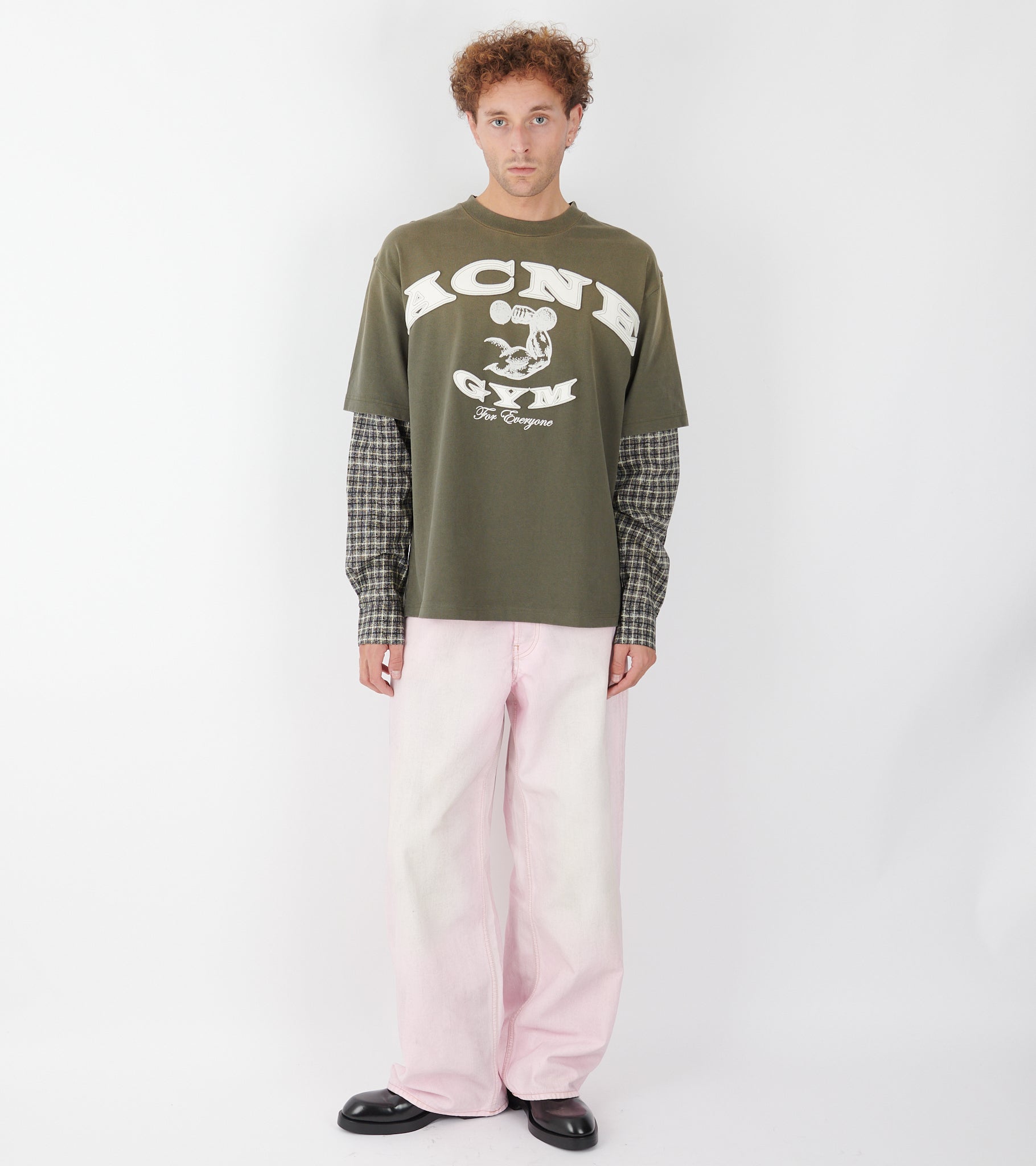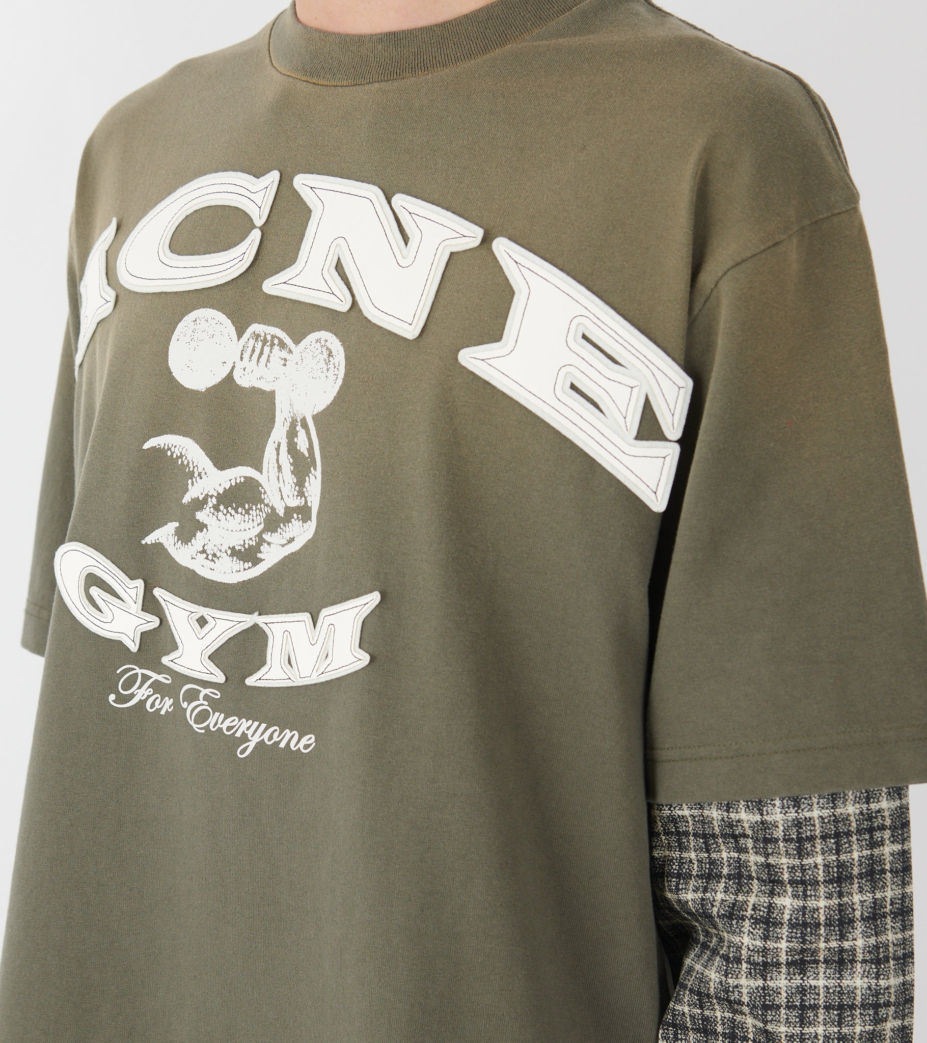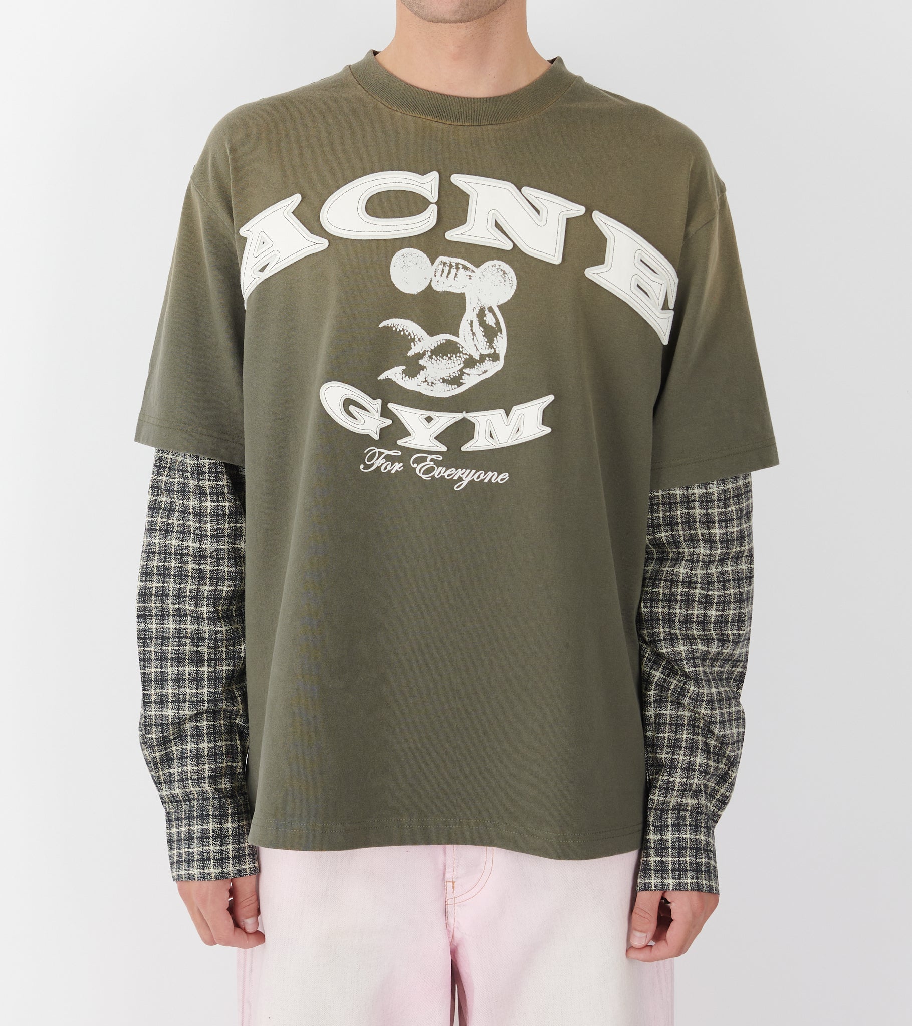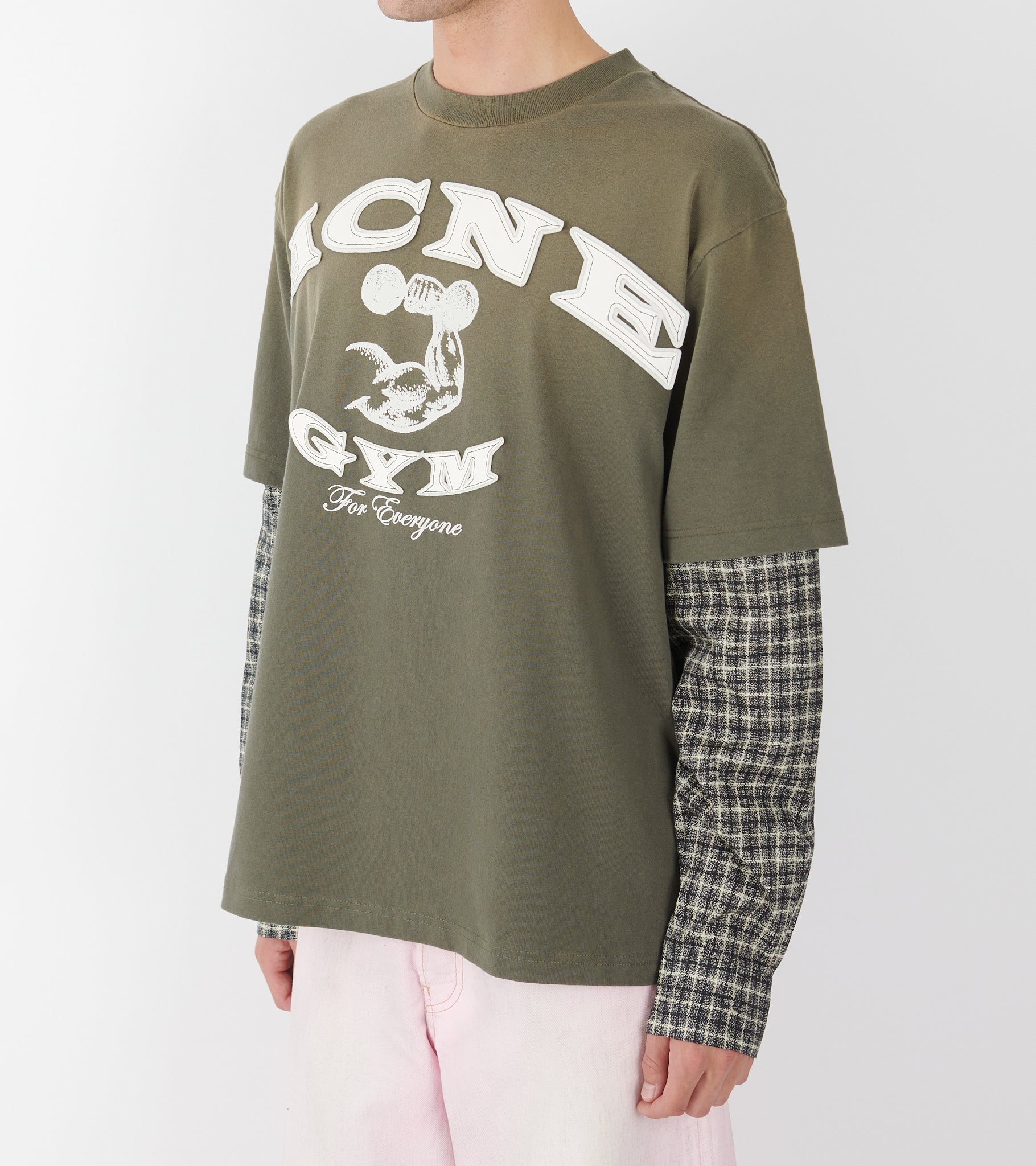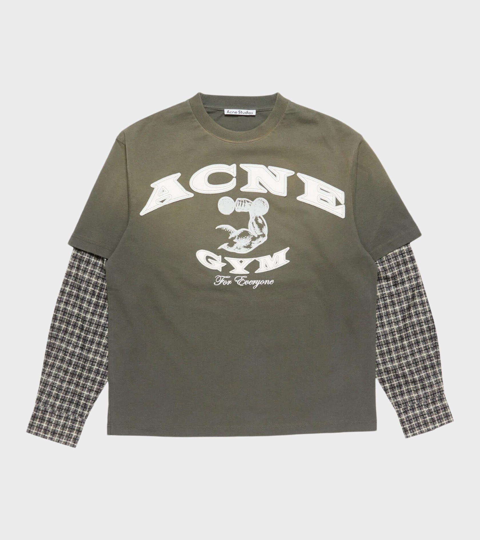 Layered t-shirt fra Acne Studios. Denne t-shirt er i en olivengrøn nuance og er fremstillet i økologisk bomuld. Den har ærmer i ternet bomuldspoplin og logoprint på fronten. 'Acne Gym' er skrevet med filt samt læder.