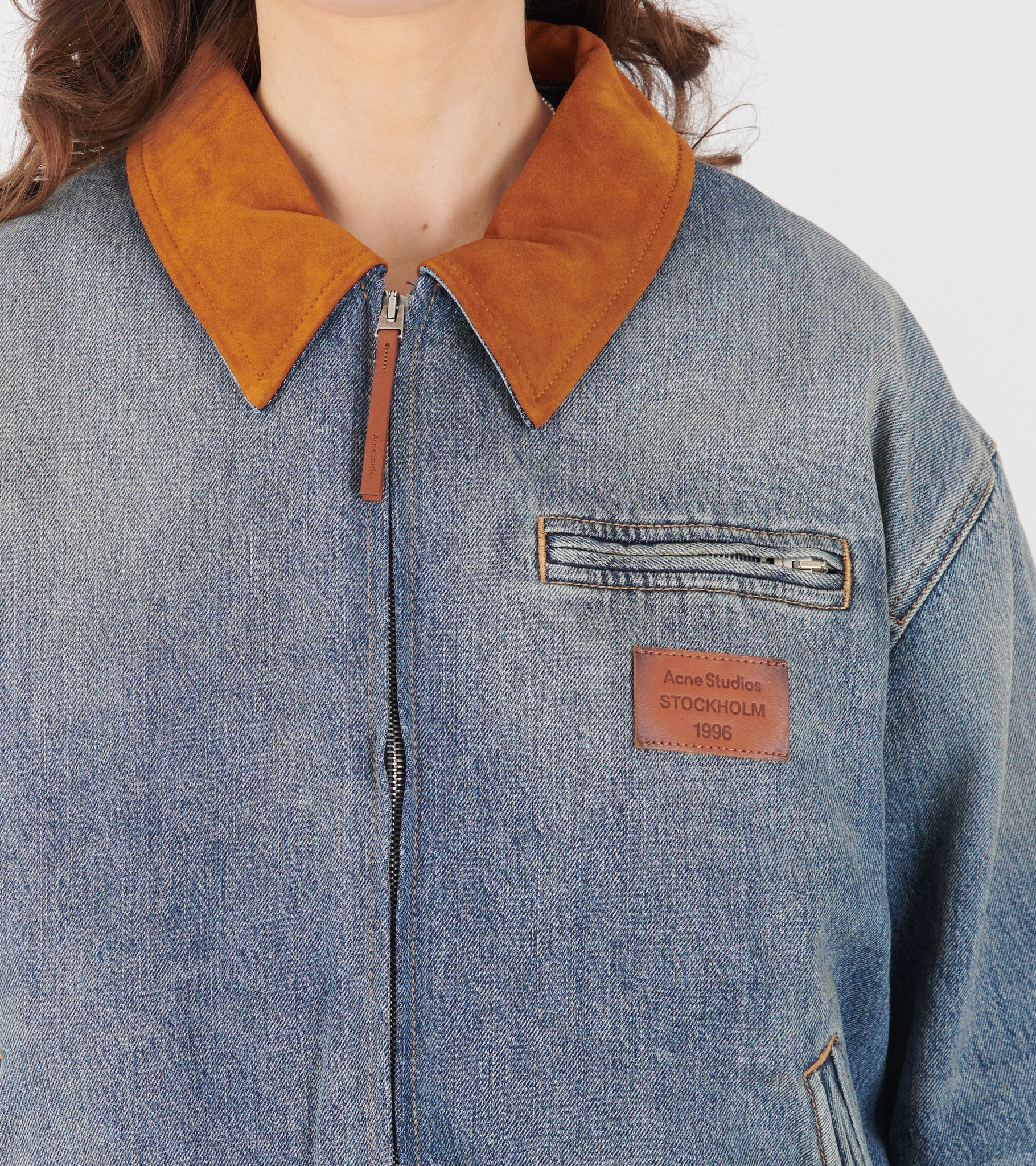 Bomberjakke i økologisk bomuldsdenim fra Acne Studios. Jakken har et 'faded' look, en brun krave i ruskind, en dobbeltgående lynlåslukning samt tre lommer på fronten. Under brystlommen er et brunt logotag i læder.