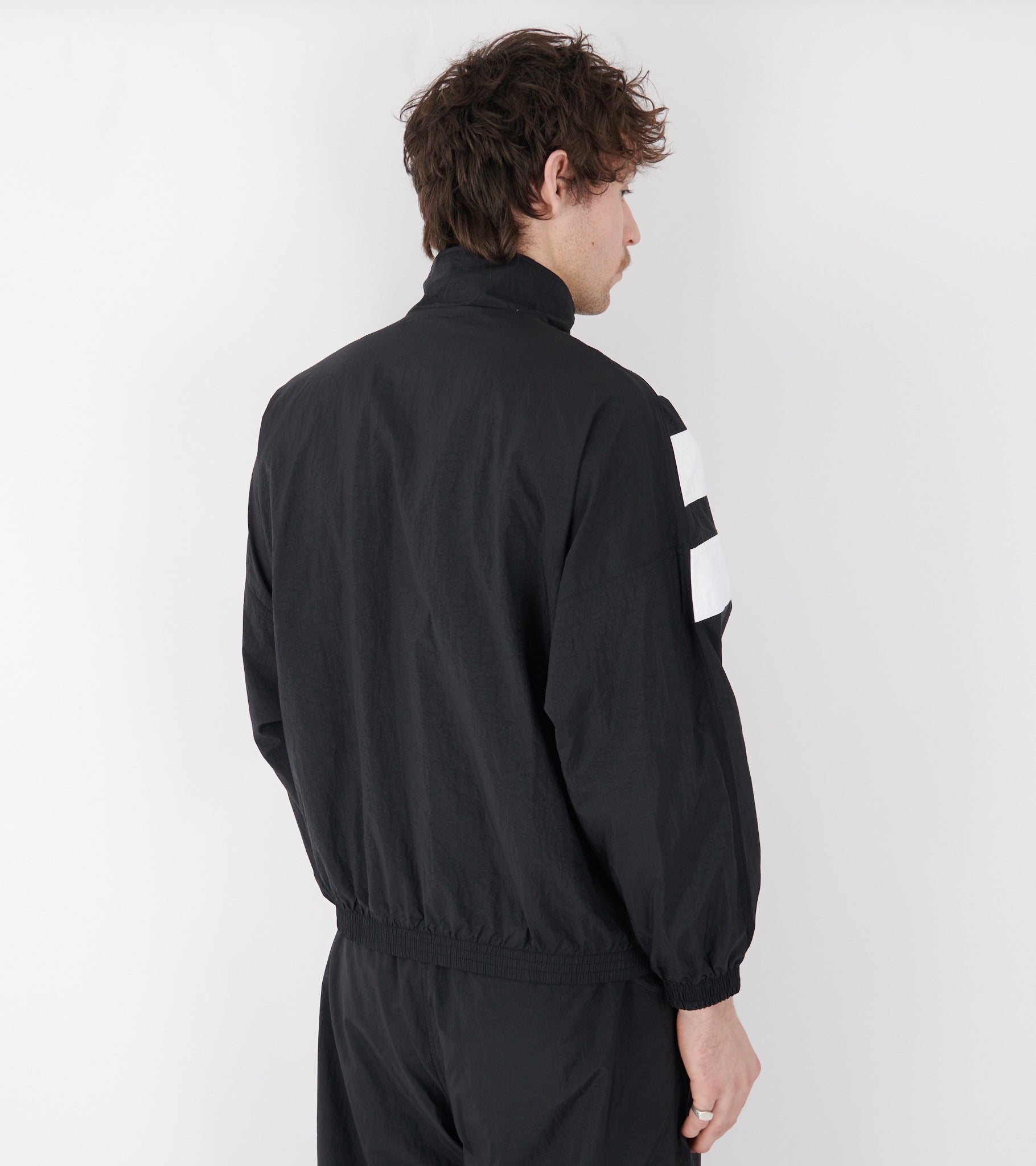 Sort trackjakke i genanvendt nylon fra Adidas. Blocking Track Top har en høj hals, en lynlåslukning og en lynlåslomme i hver side. Ved venstre bryst er et hvidt broderet logo. Øverst i højre side er de ikoniske striber.