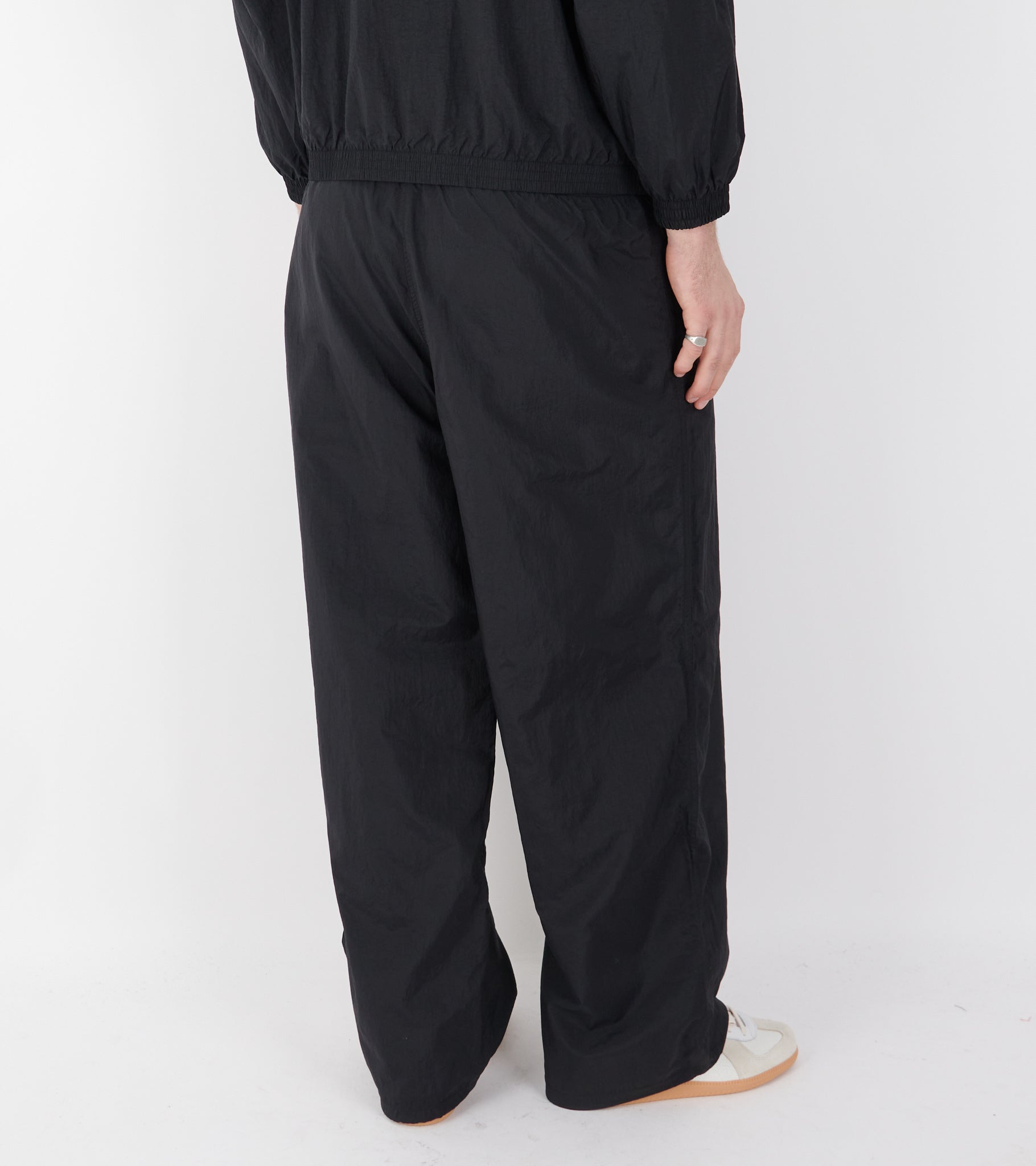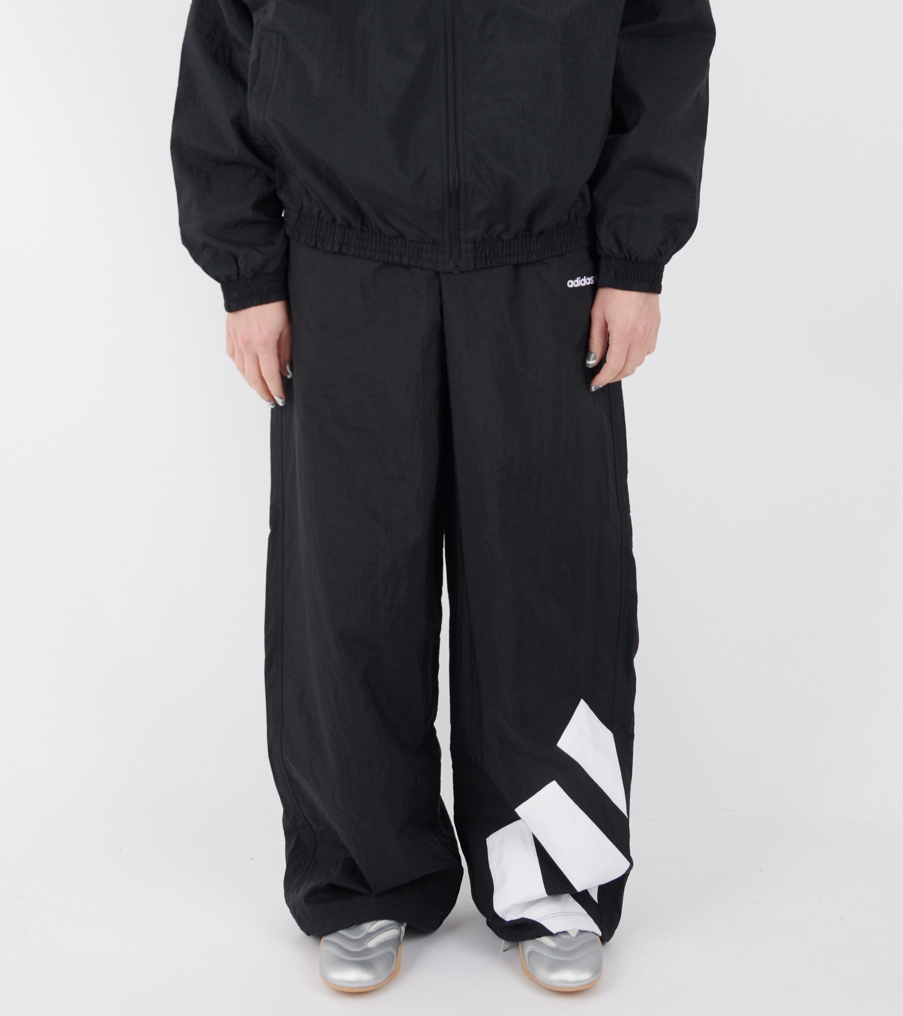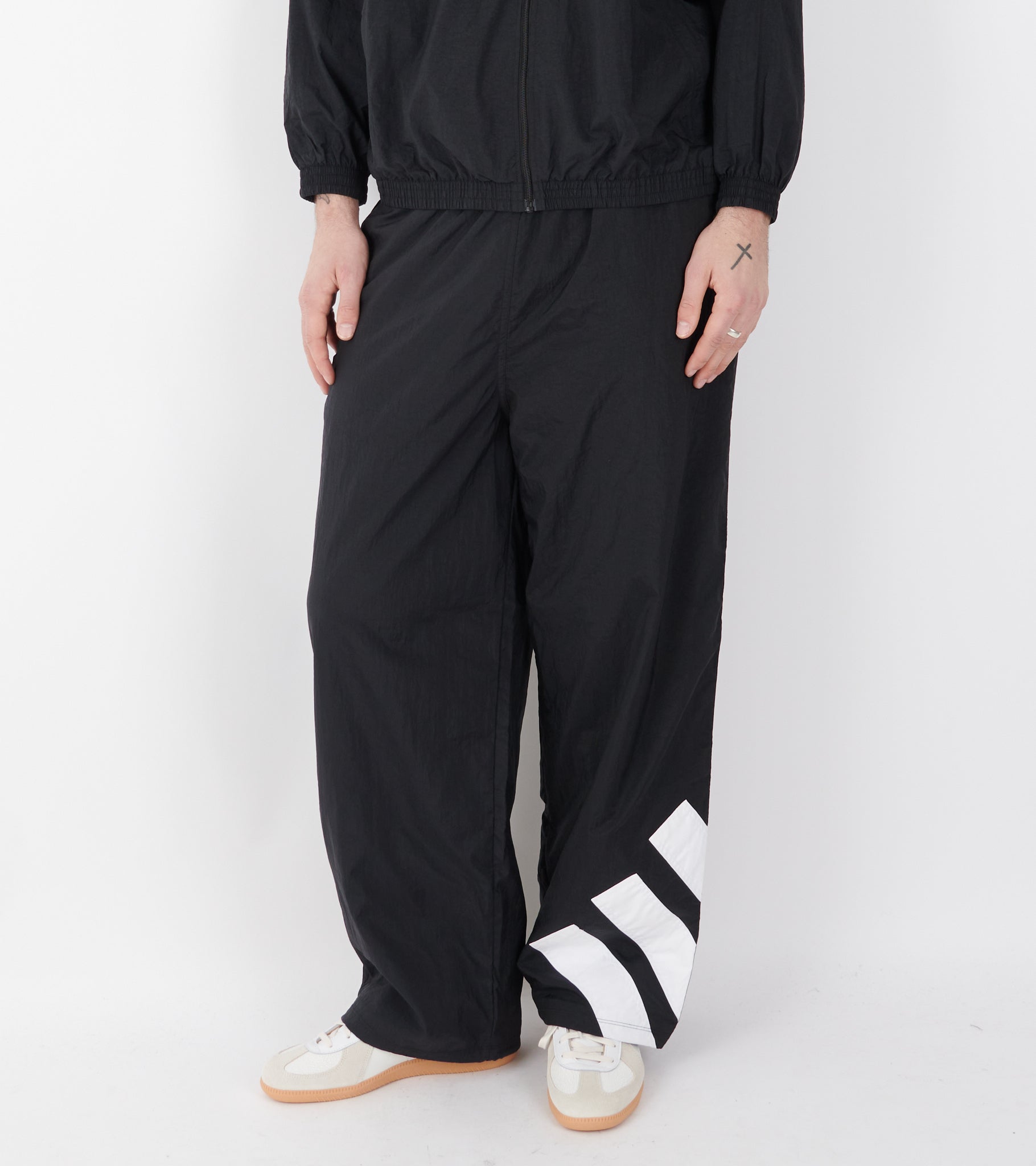 Sorte trackpants i genanvendt nylon fra Adidas. Blocking trackpants har elastik og et indvendigt bindebånd i livet, en lynlåslomme i hver side samt et hvidt broderet logo i venstre side. Nederst på venstre ben er de ikoniske tre striber. Bukserne har brede ben med en indvendig justerbar elastik i bunden.