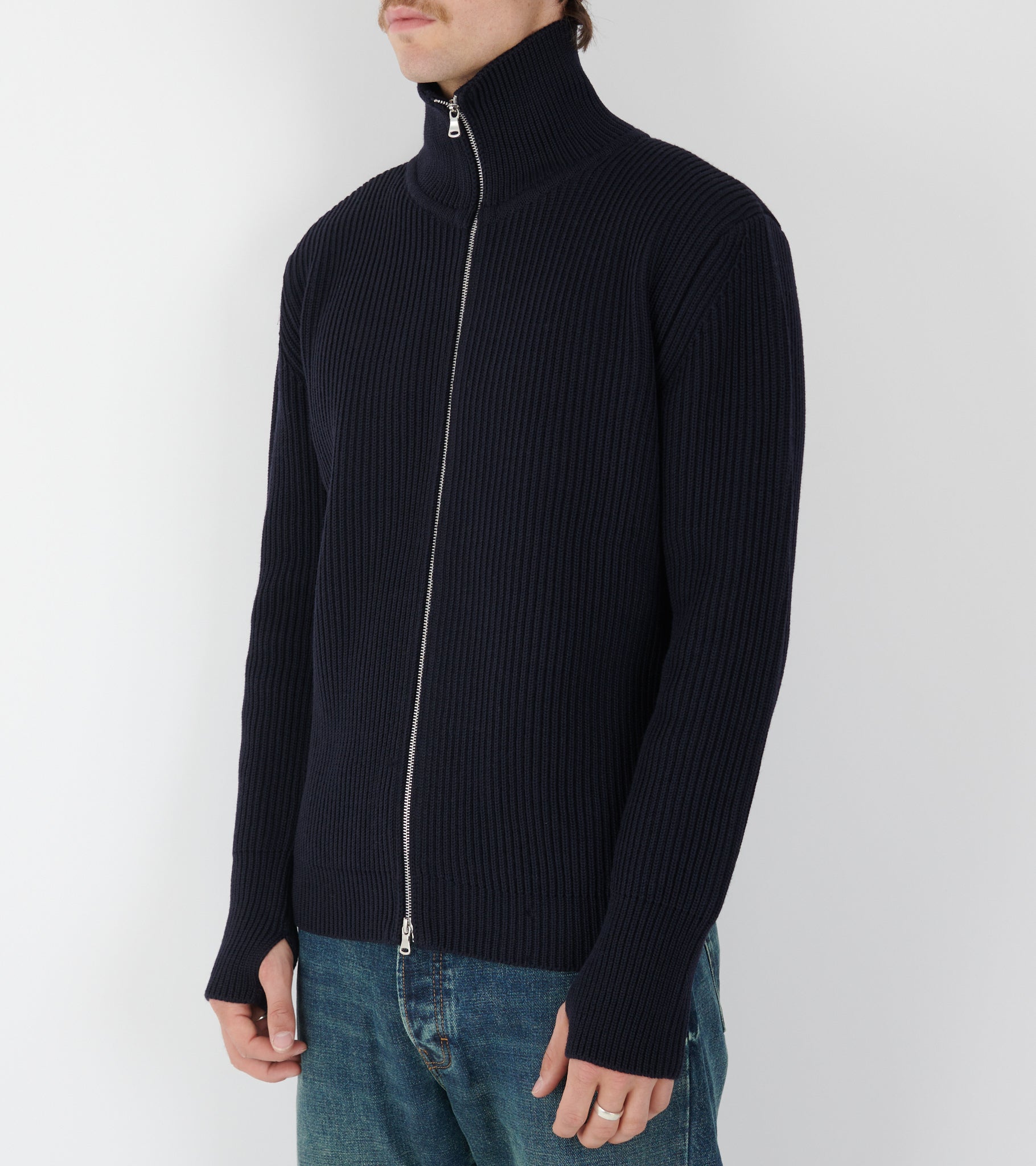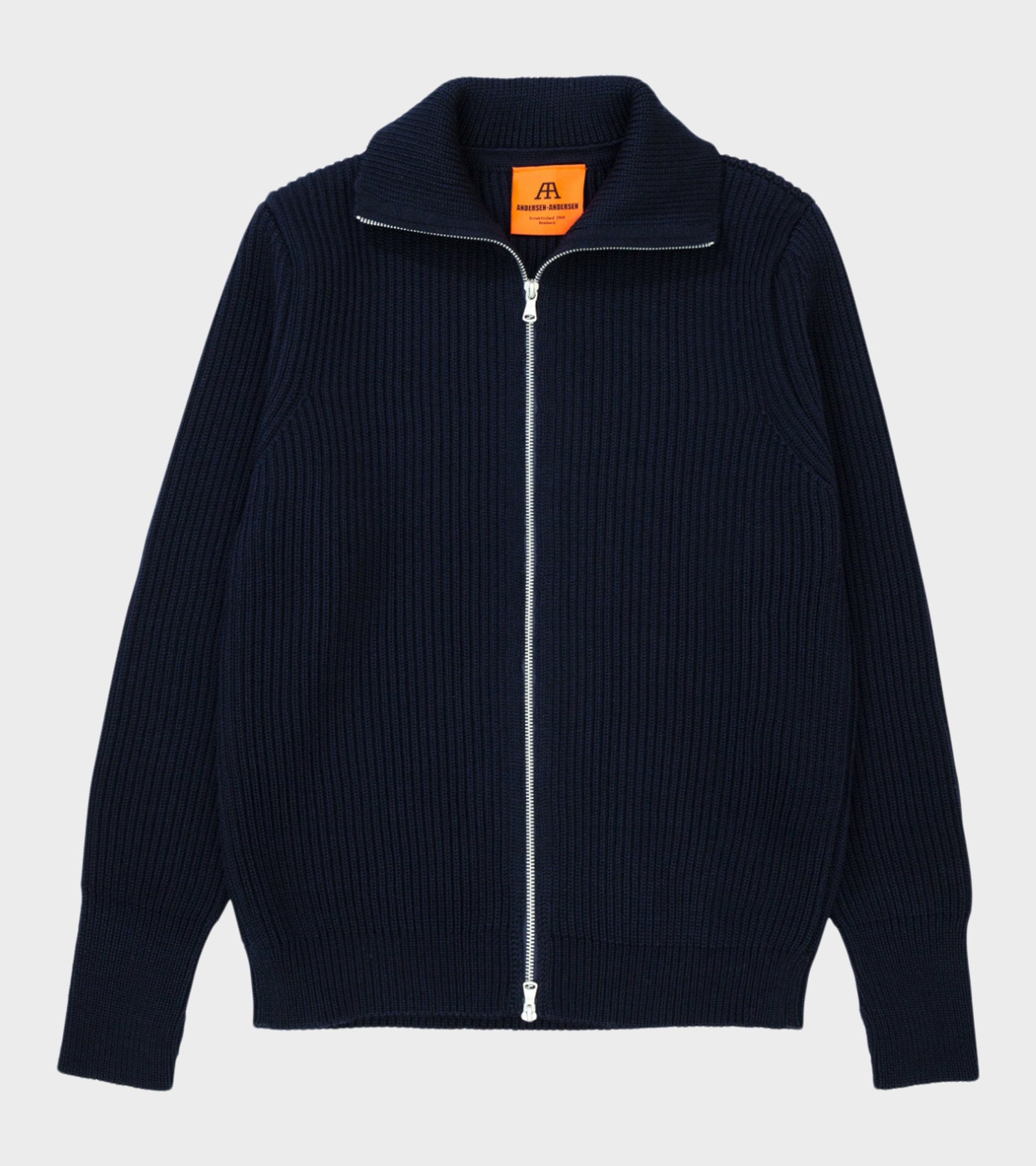 Navy strik fra Andersen-Andersen. Navy Full-zip er fremstillet i en kraftig ribstrikket jomfru uld og har en høj hals, en dobbeltgående lynlåslukning i metal, et hul til tommelfingeren og forlængede ærme-rib i enderne.