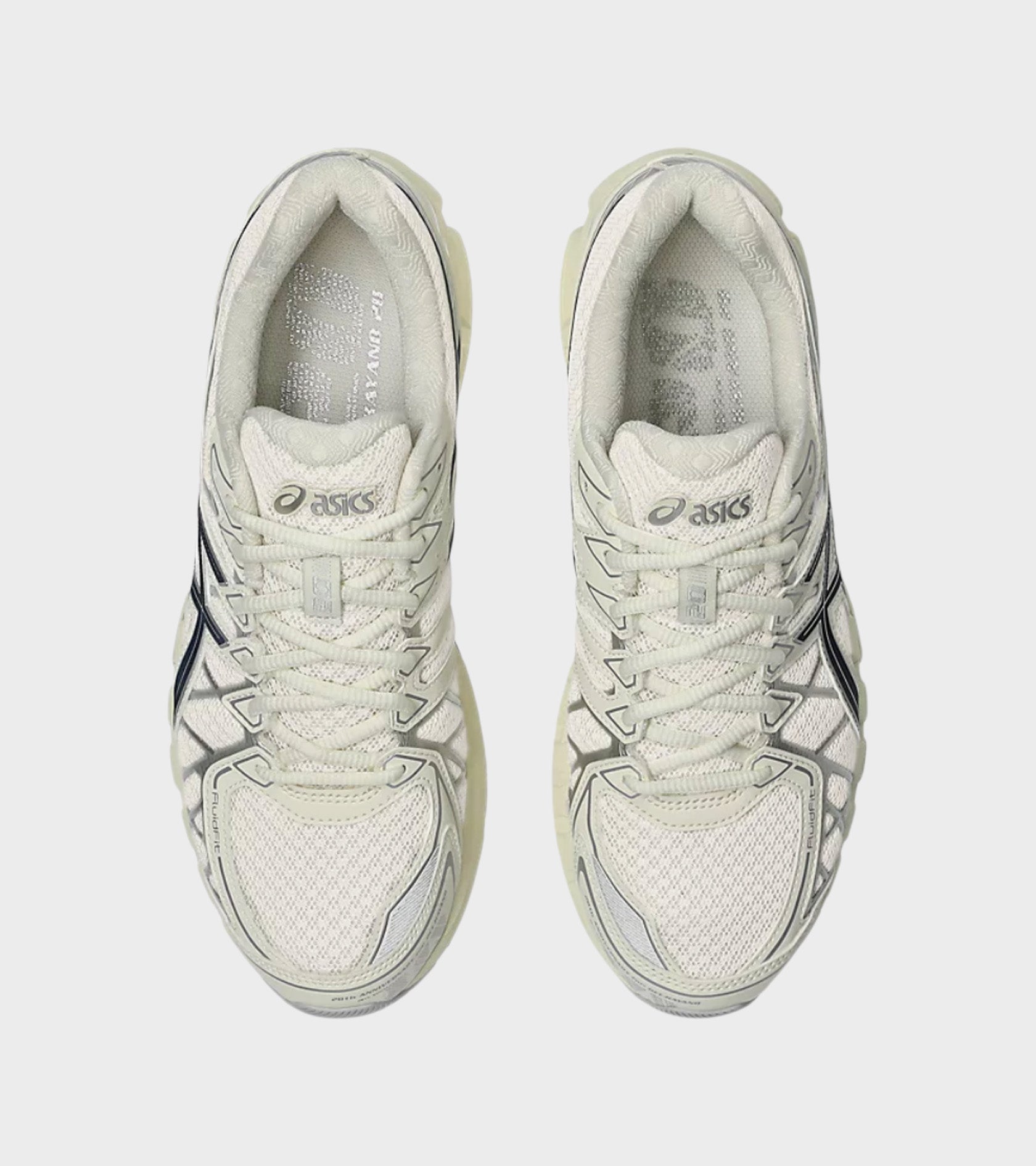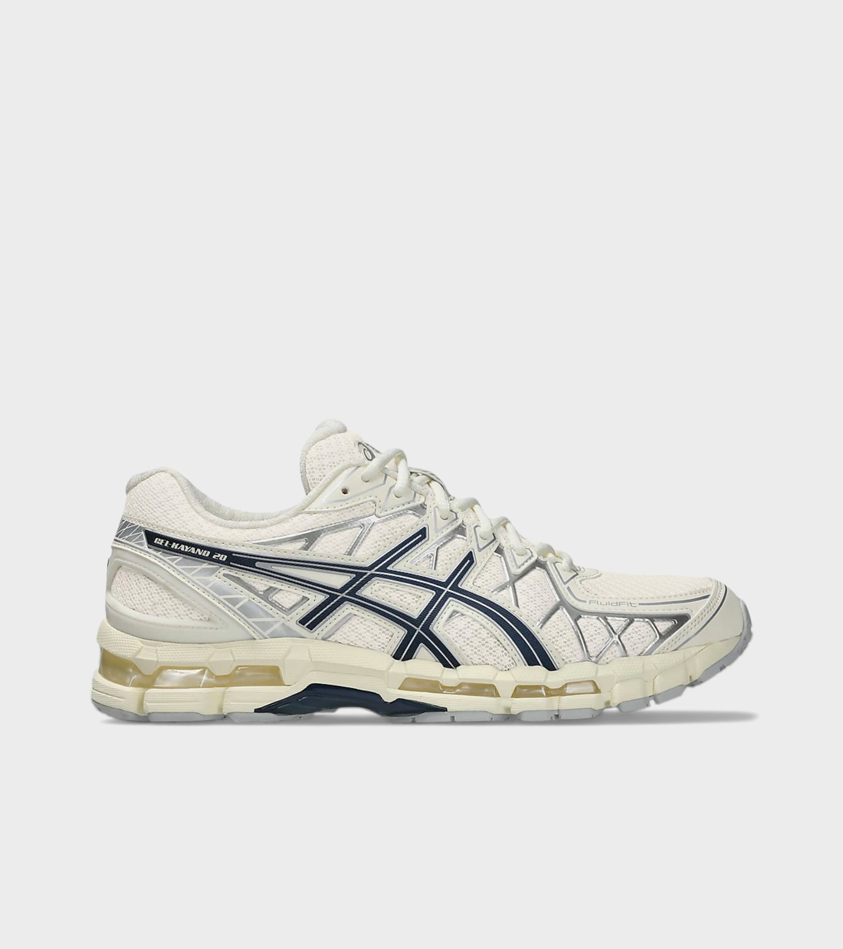 Gel-Kayano 20 fra Asics i råhvid med sølv og navy detaljer.