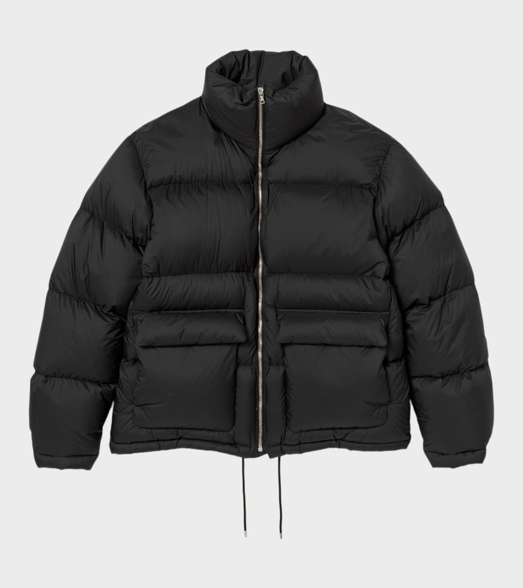 Ultra let sort dunjakke i en mini-ripstop nylonkvalitet fra Auralee. Jakken er vind- og vandafvisende og har en høj hals, en lynlåslukning samt to lommer på fronten. Jakken er foret med andedun og har en indvendig justerbar snor i bunden.