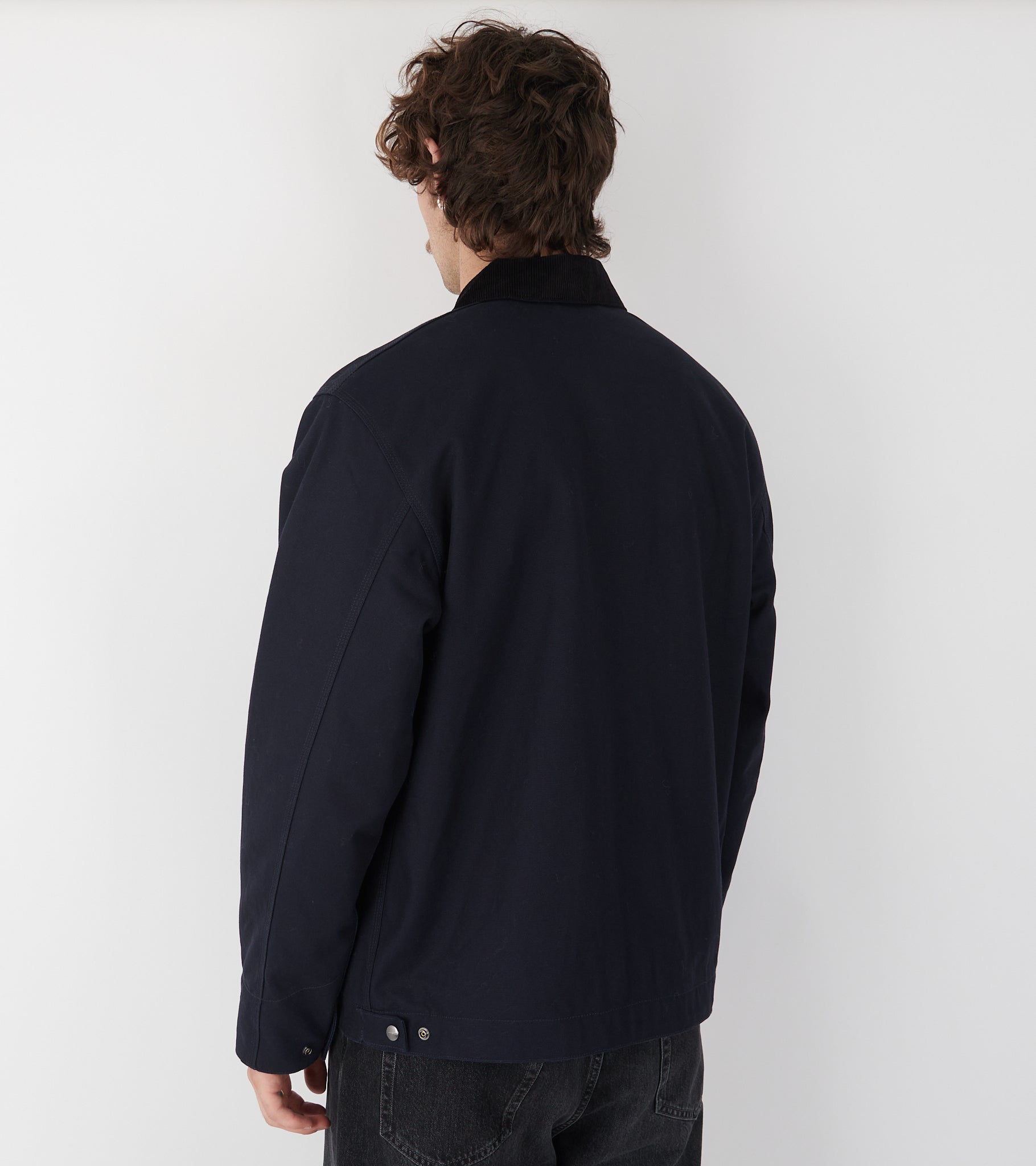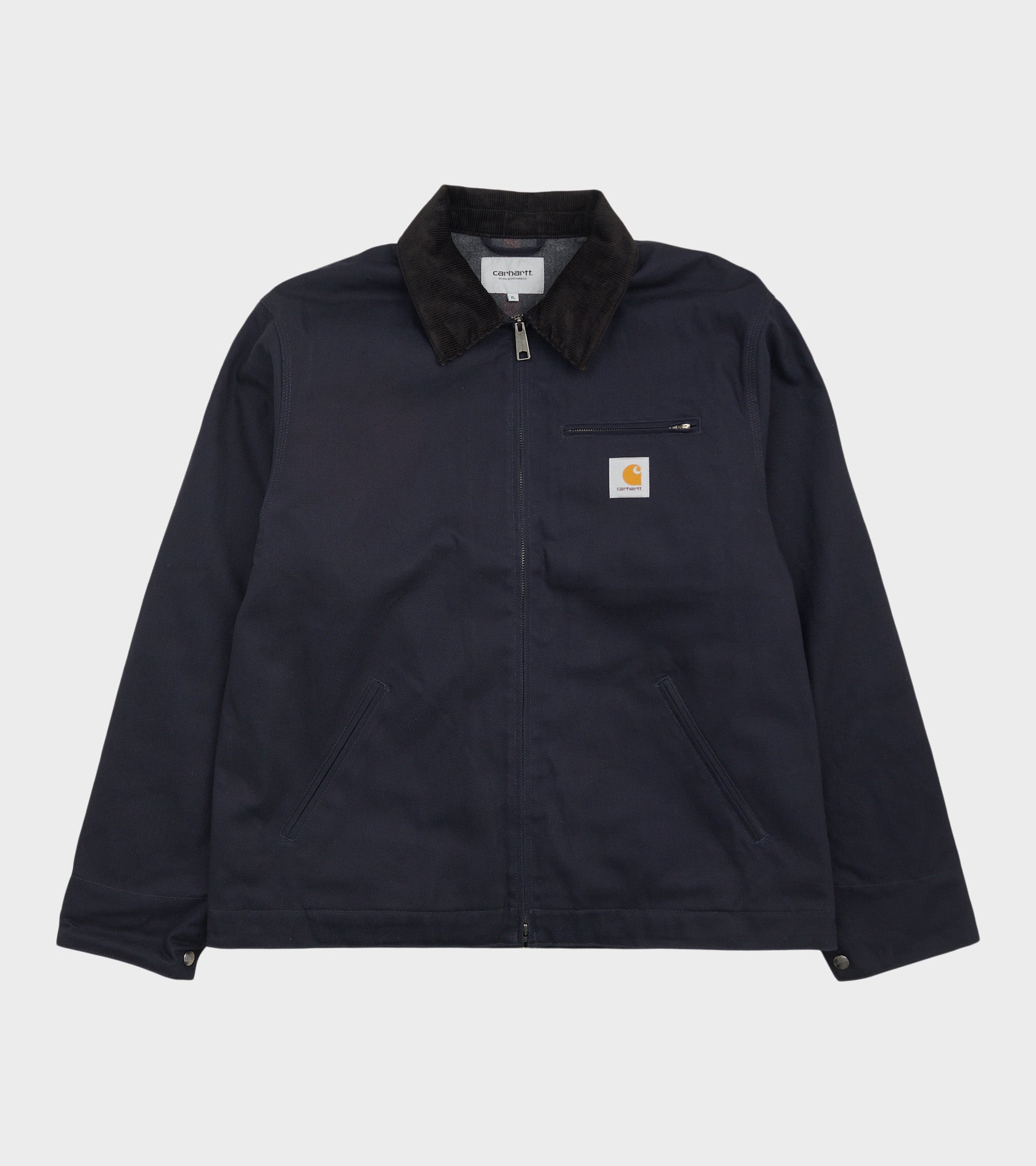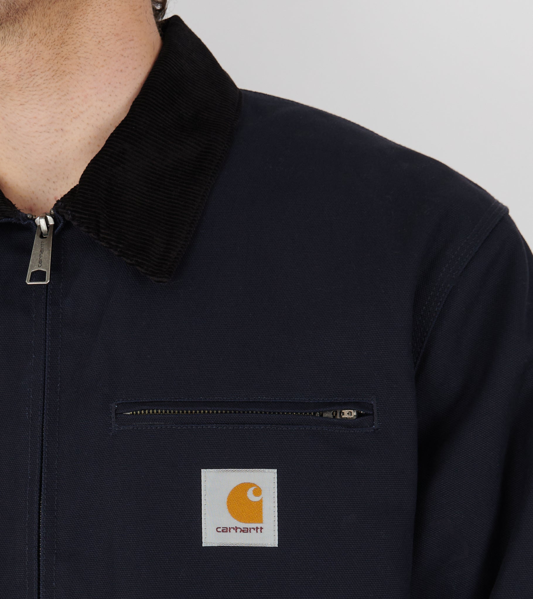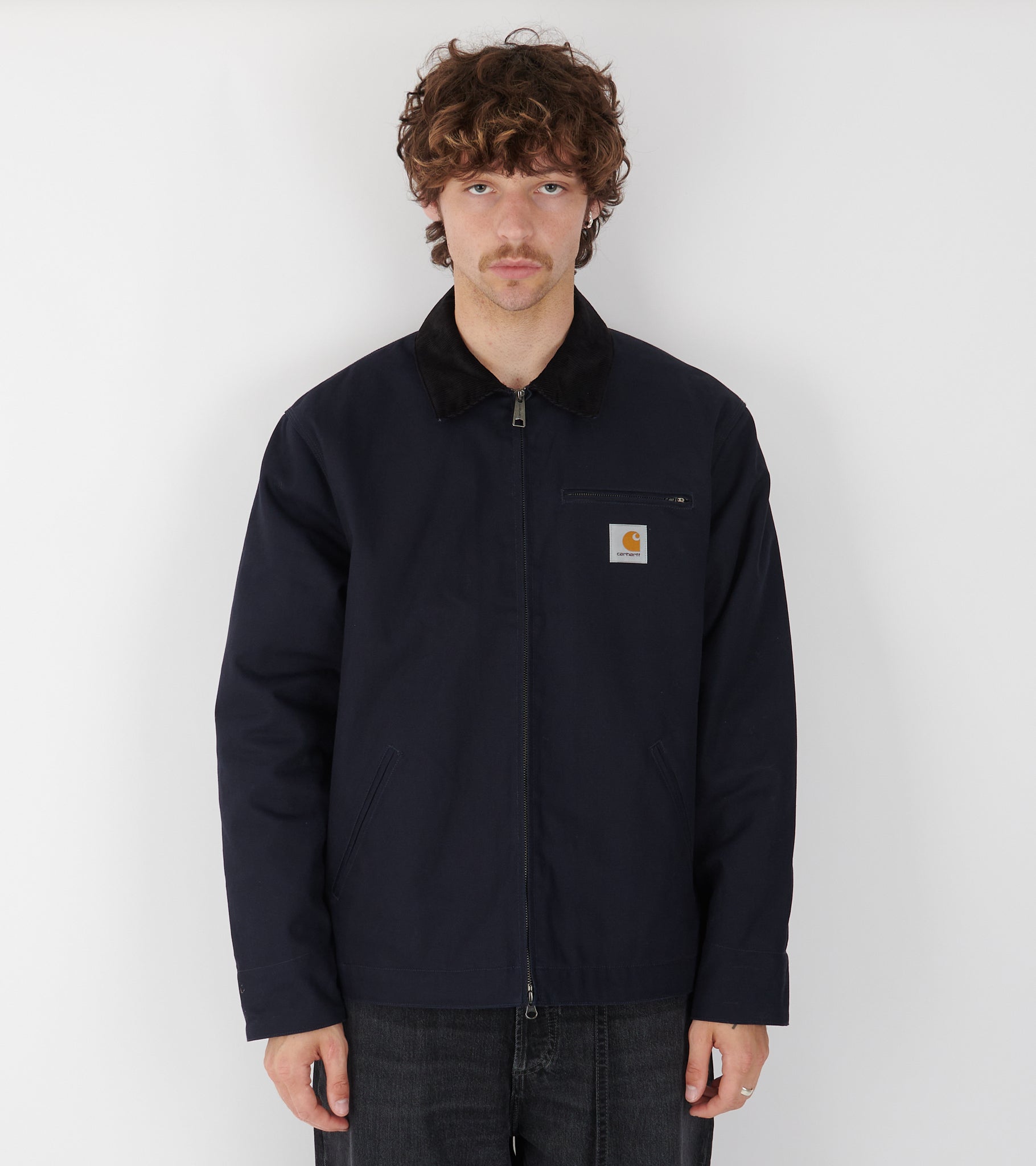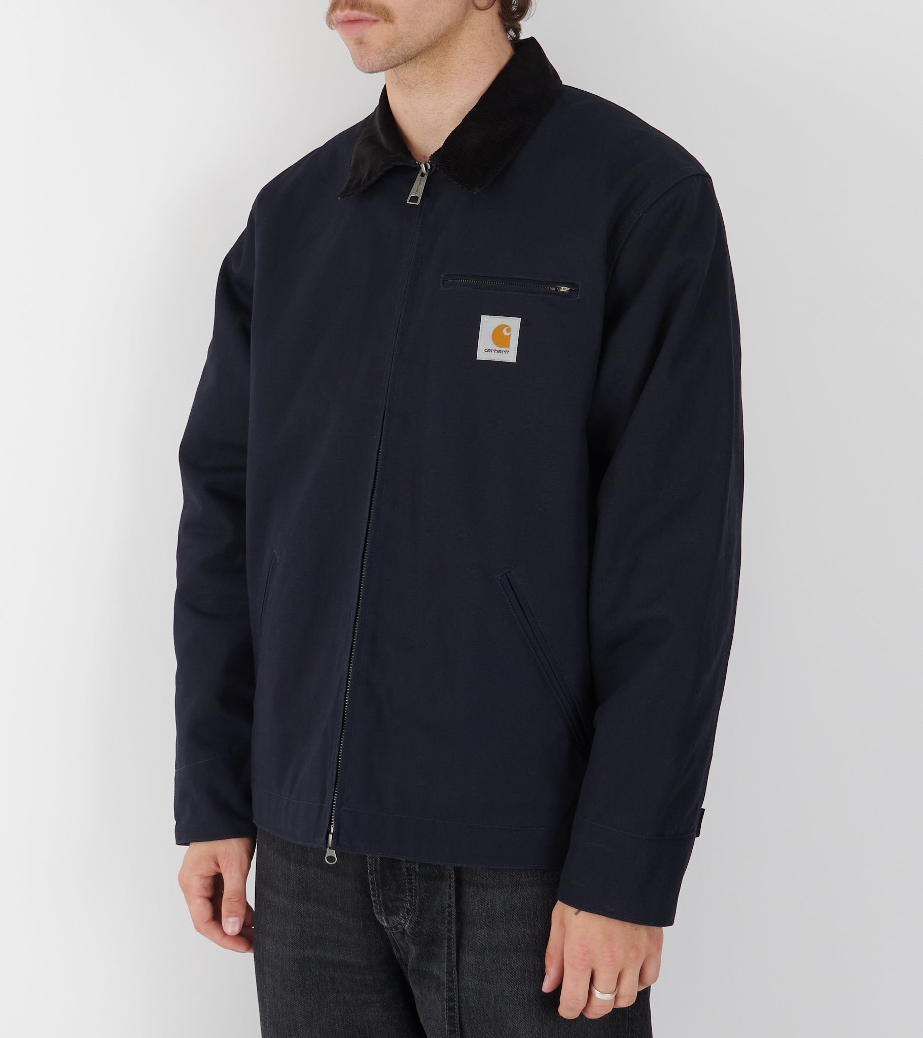 Foret navy jakke i bomuldkanvas fra Carhartt WIP. Denne jakke har en klassisk krave i sort bomuldsfløjls, en lynlåslukning og tre lommer på fronten. Ved venstre bryst er det ikoniske logo. Jakken er fremstillet i Carhartt's 'Dearbon' kanvas.