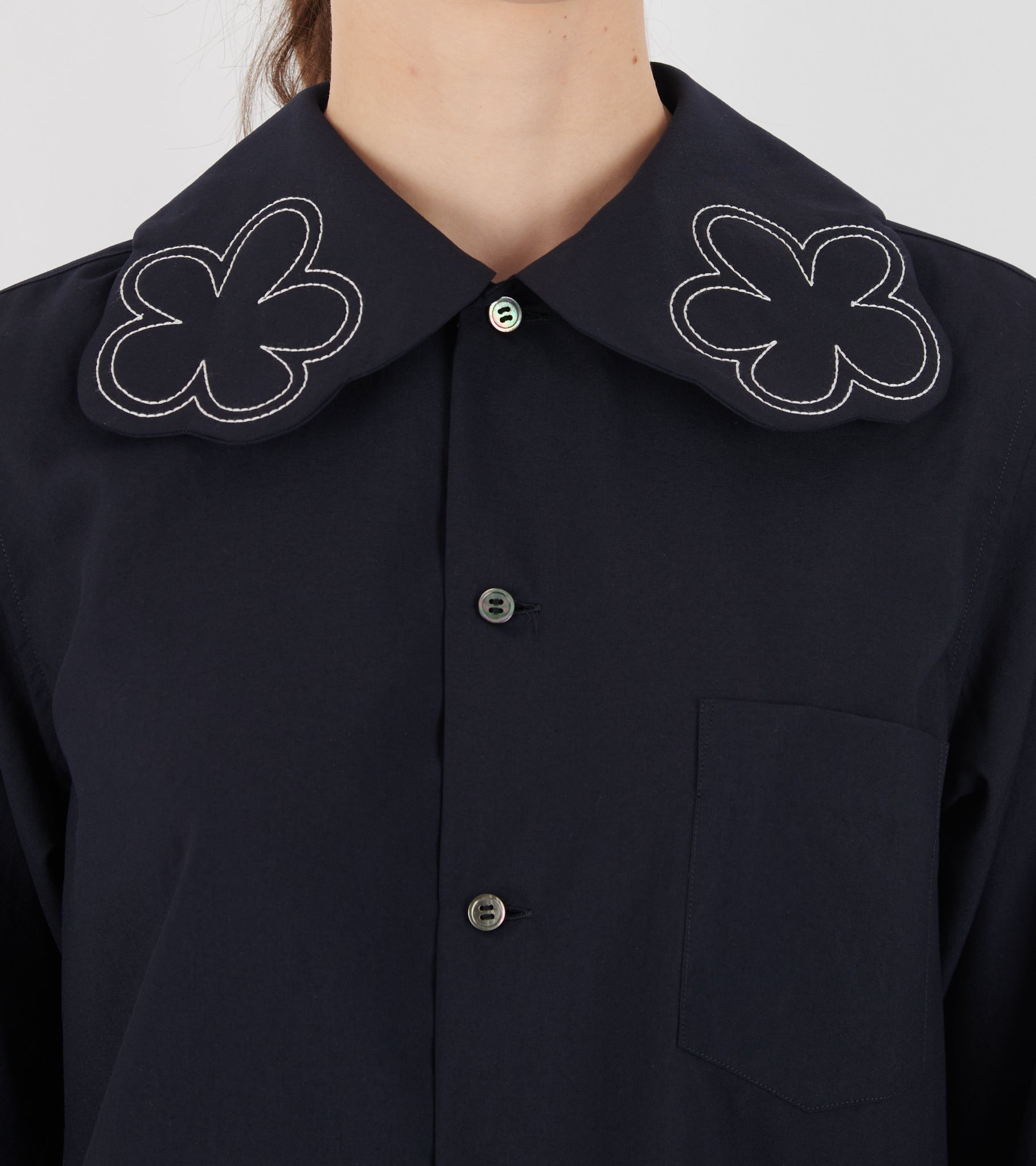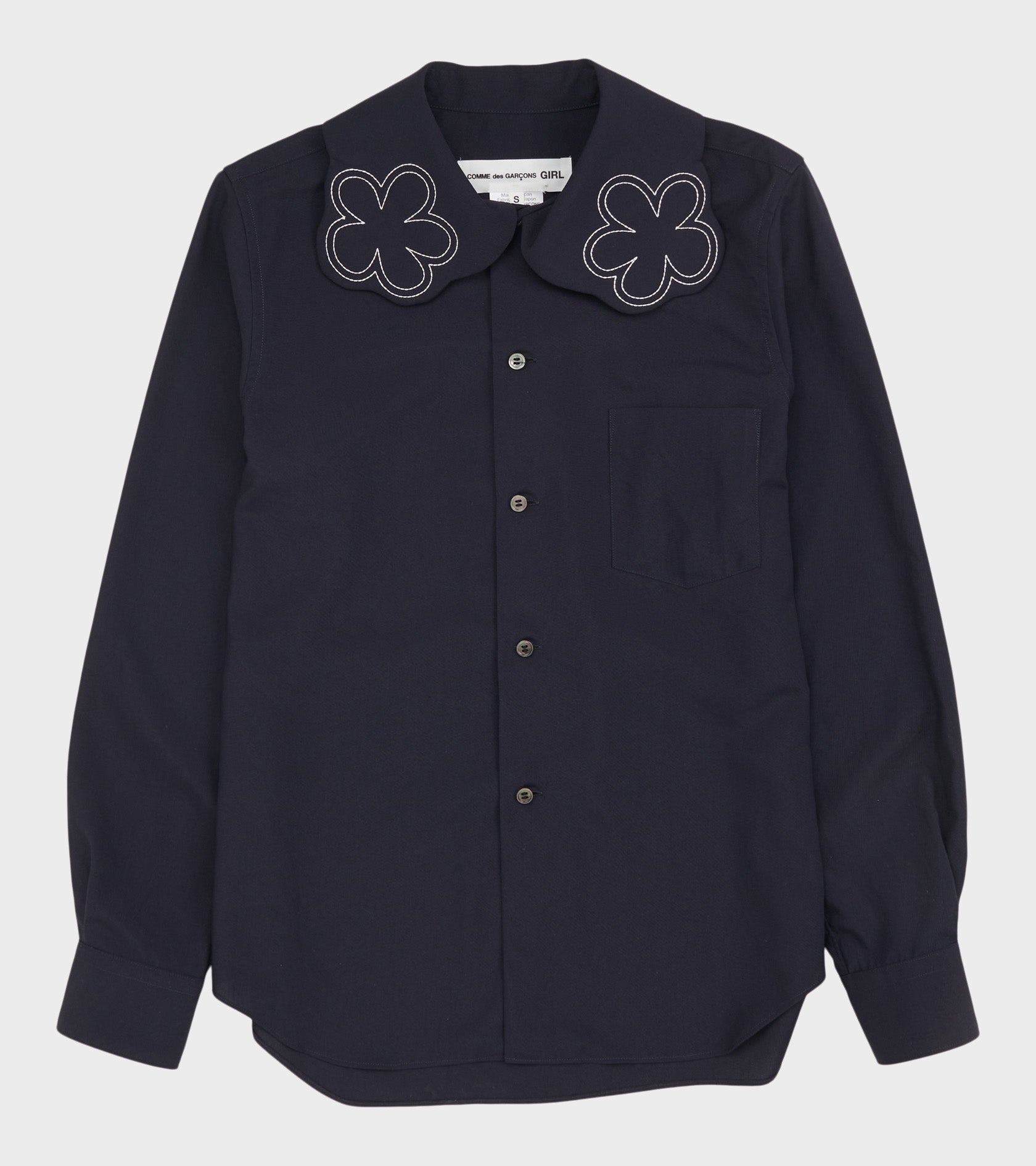 Navy skjorte fra Comme des Garcons Girl. Skjorten har en rund krave med hvide broderede blomster, en knaplukning samt en brystlomme på fronten.