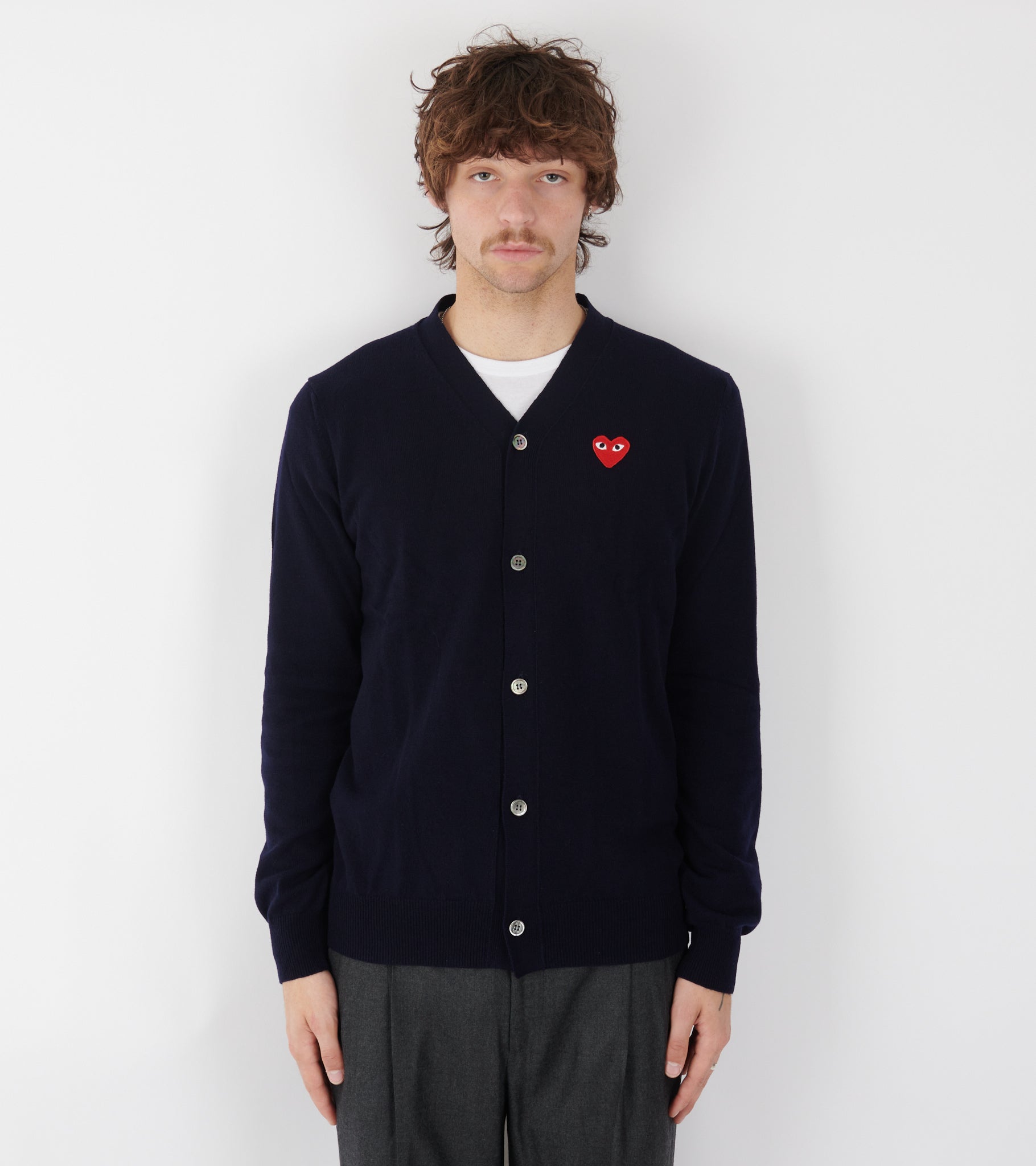 Navy unisex cardigan fra Comme des Garcons PLAY. Denne cardigan er fremstillet i uld og har en v-udskæring og knaplukning på fronten. Ved venstre bryst er det røde PLAY-hjerte broderet. Det ikoniske hjerte med øjnene fra PLAY er designet af Filip Pagowski og er gennemgående på alle PLAY produkter.