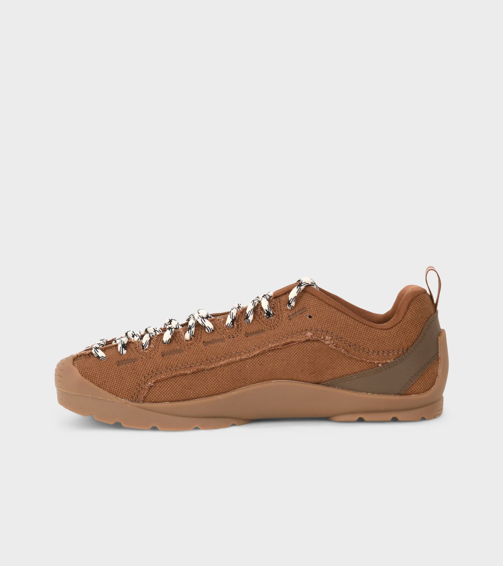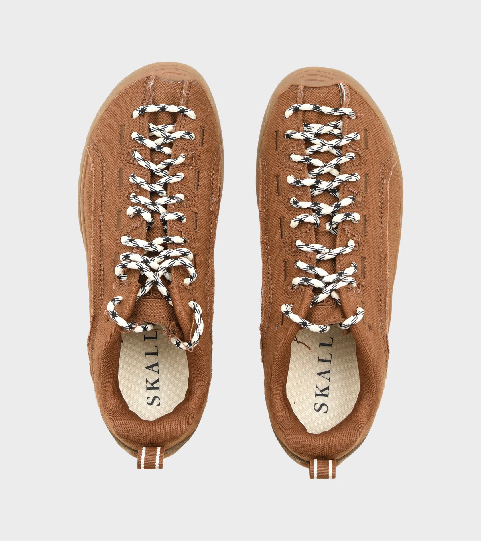 Klatre-inspirerede kanvas sneakers fra Skall X Keen. Jasper Sneakers har runde sorte og hvide snørebånd som går helt ud til tåen og en brun ydresål i gummi.