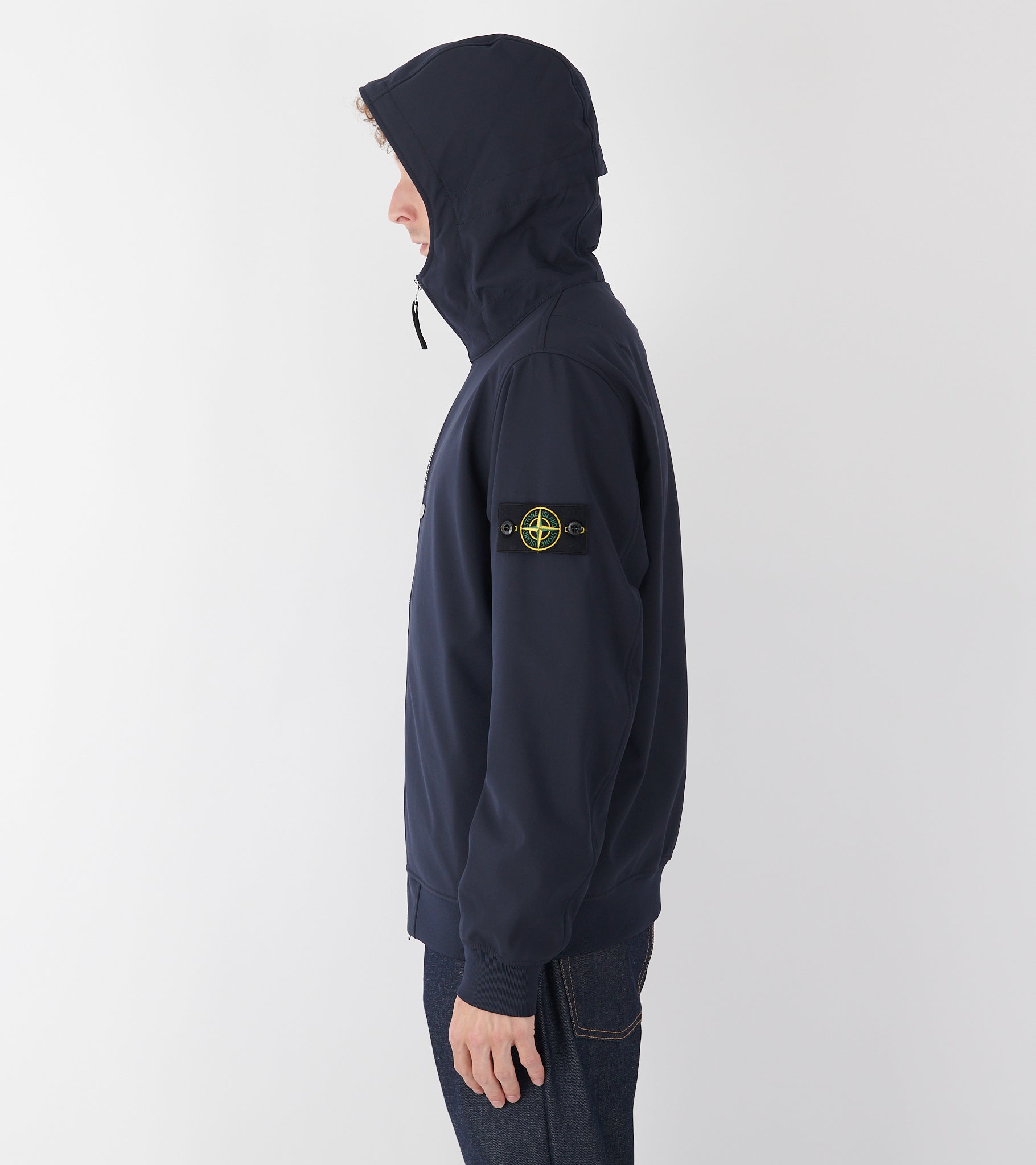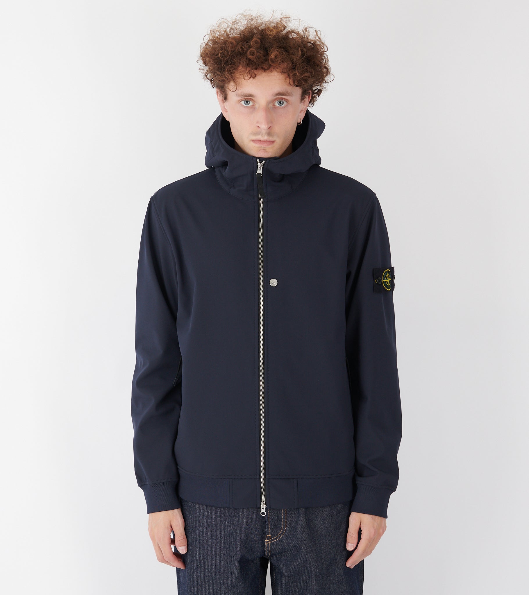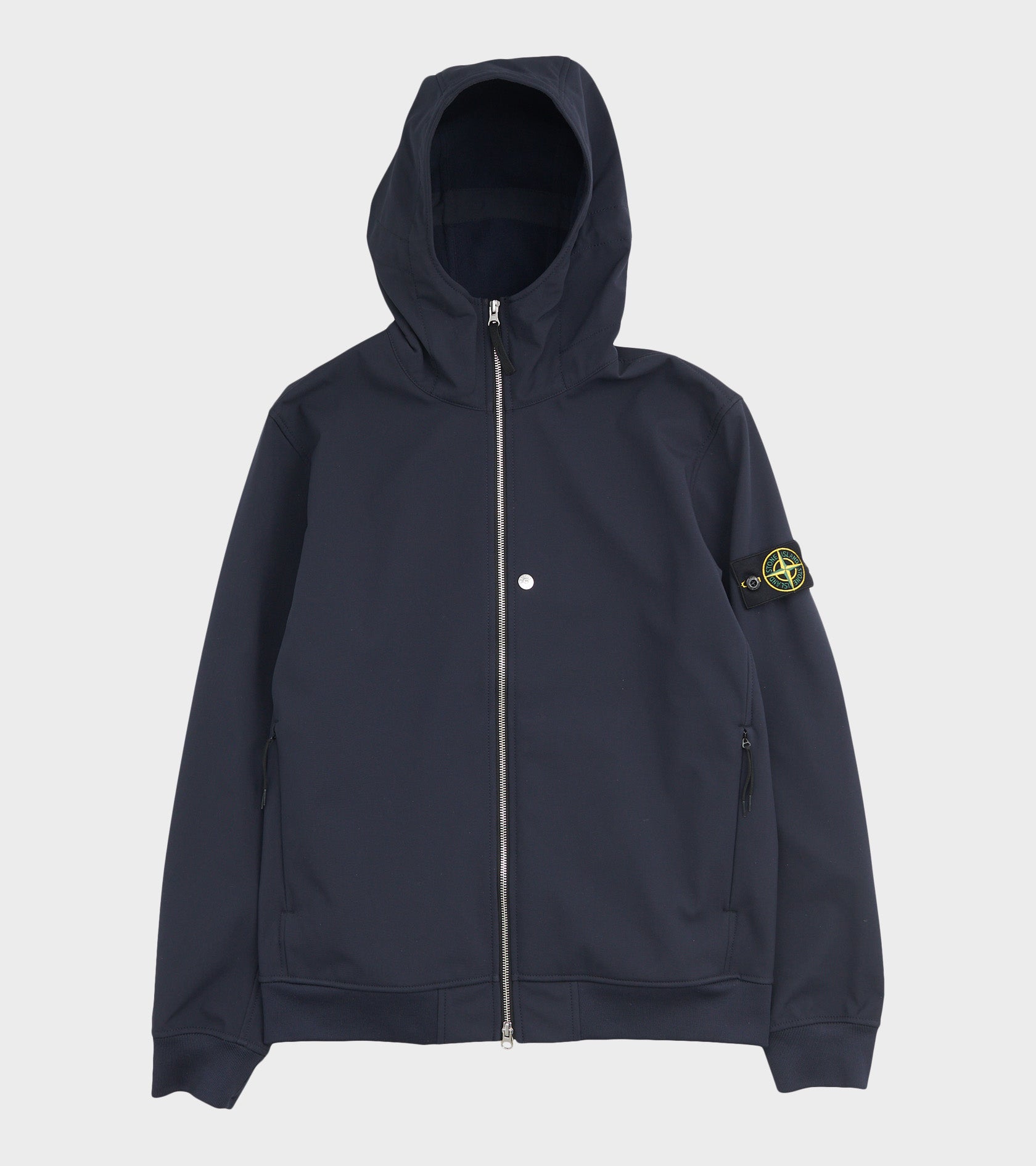 Navy jakke med hætte og lynlåslukning fra Stone Island. Denne jakke har det ikoniske Stone patch på venstre ærme samt lommer i siderne.