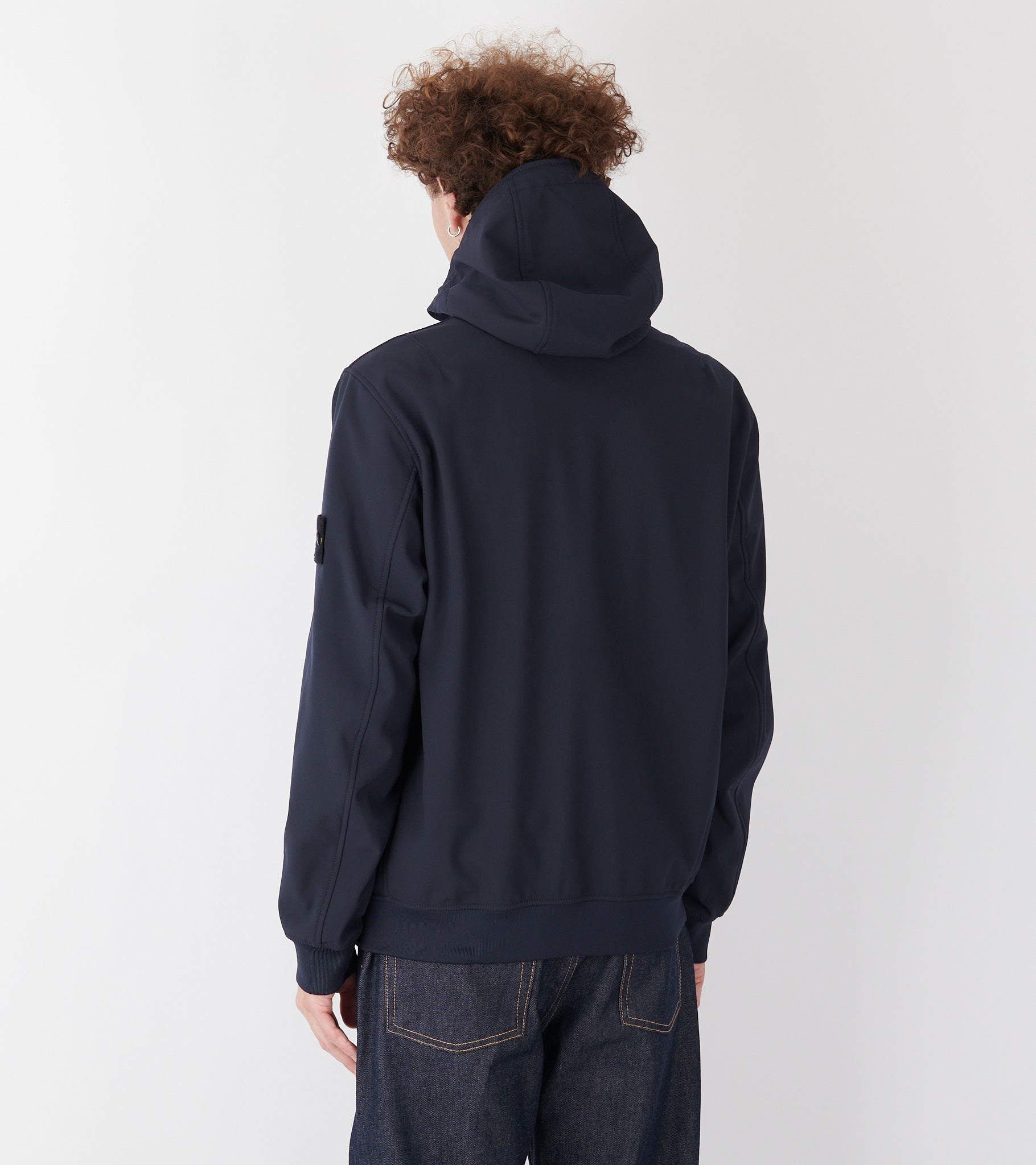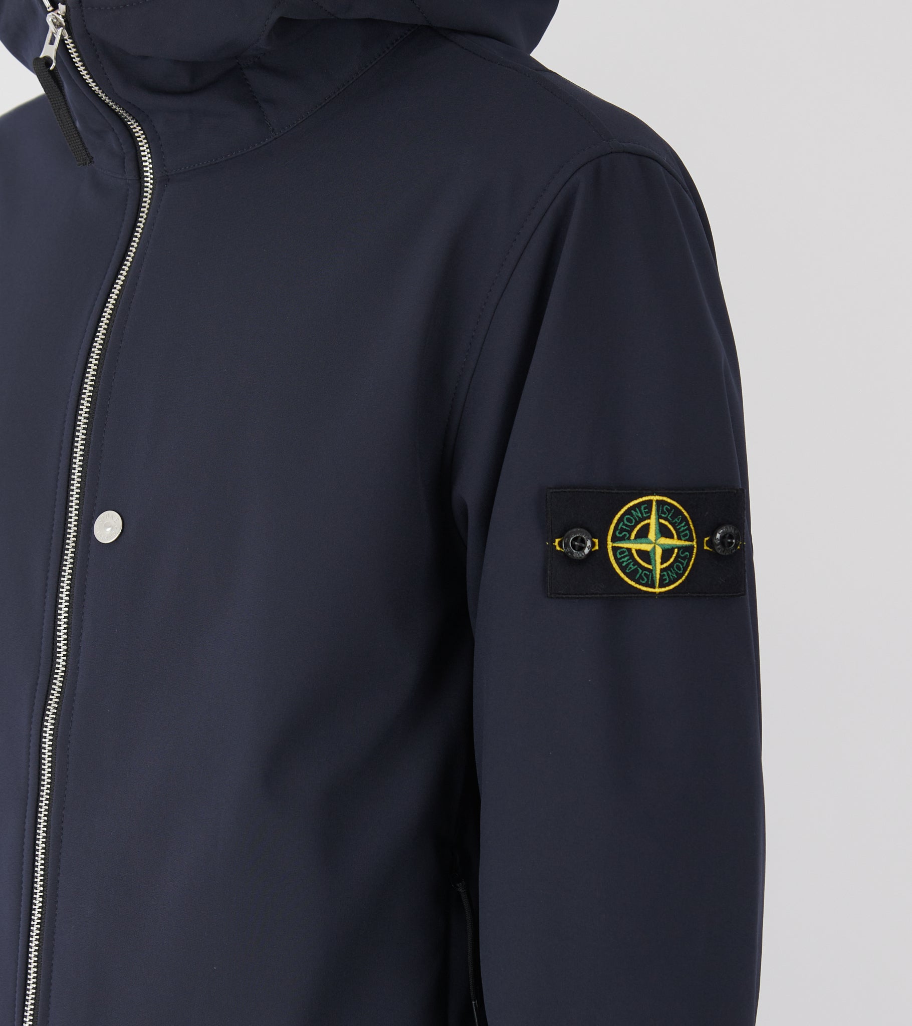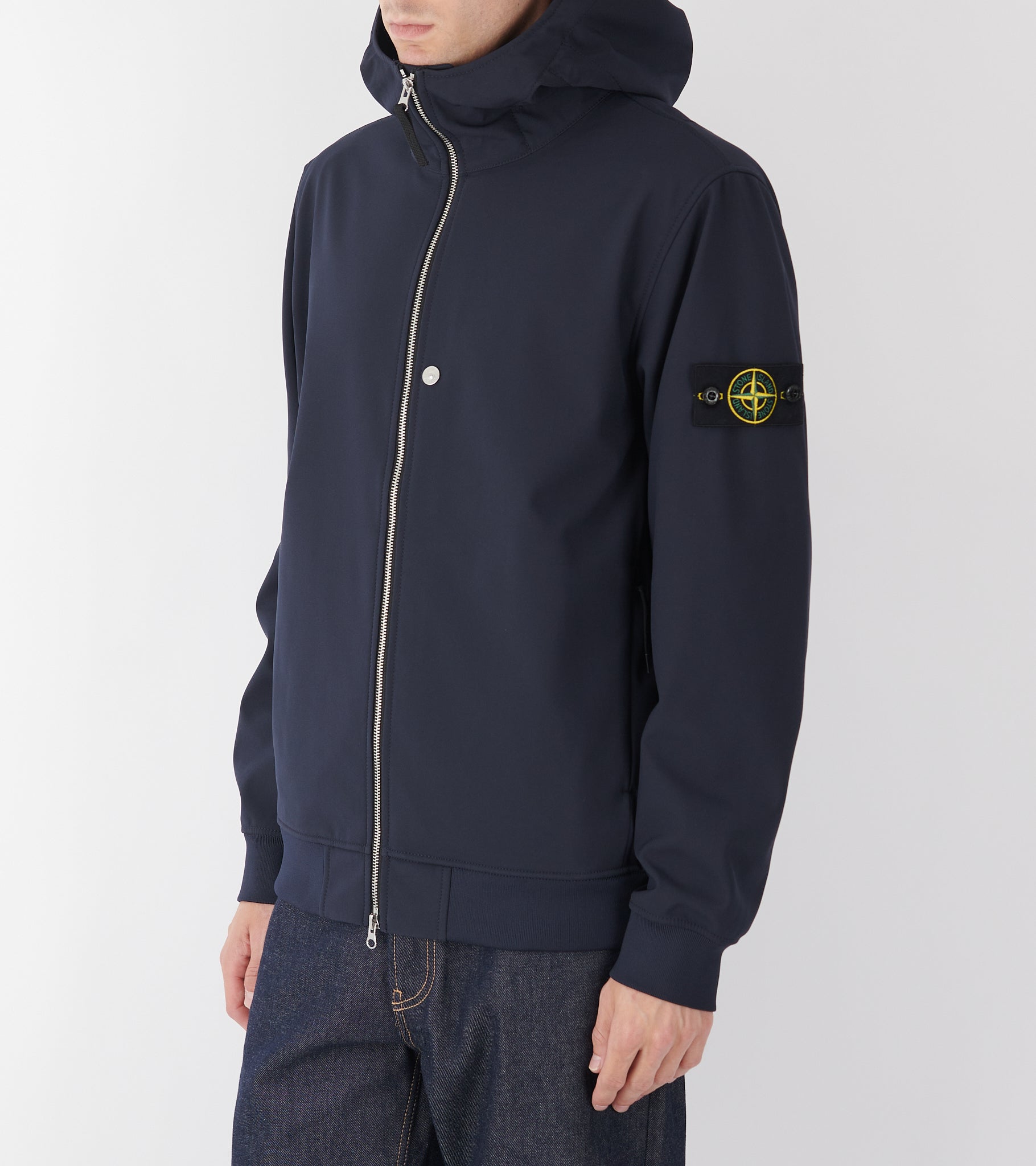 Navy jakke med hætte og lynlåslukning fra Stone Island. Denne jakke har det ikoniske Stone patch på venstre ærme samt lommer i siderne.