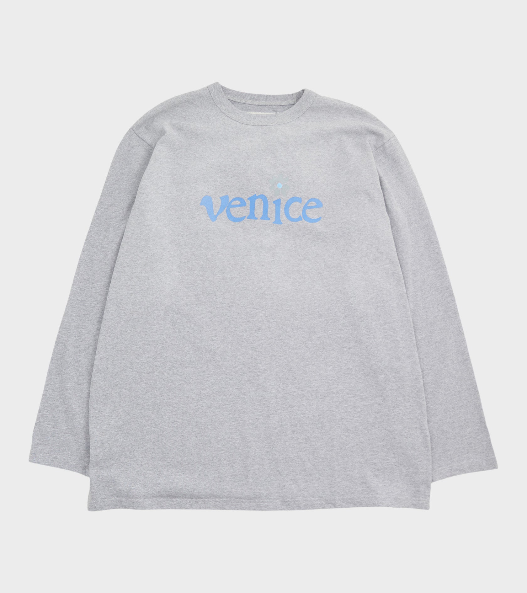 Grå langærmet t-shirt fra ERL. På fronten er 'Venice' printet i blå.