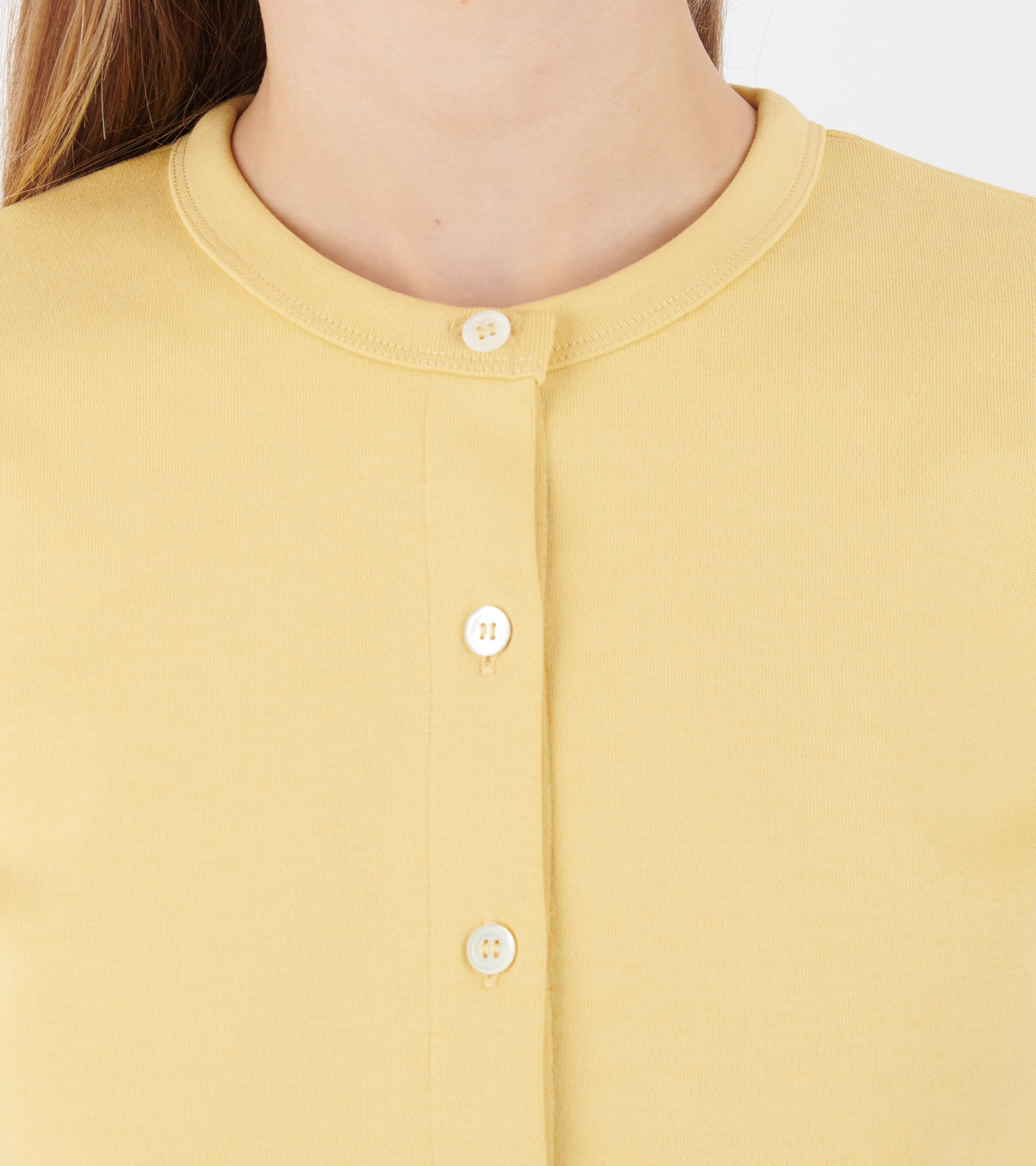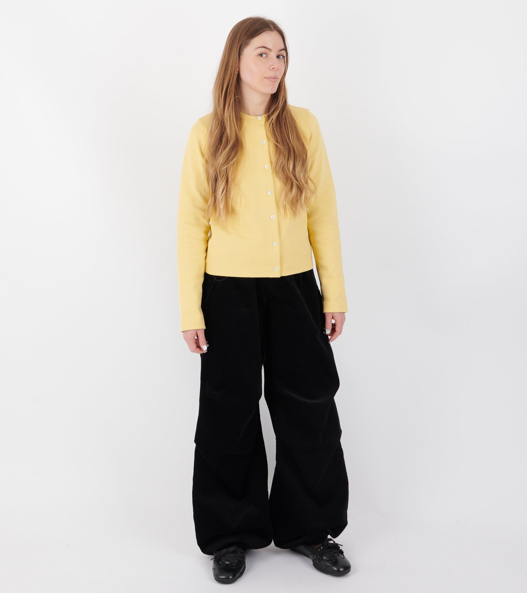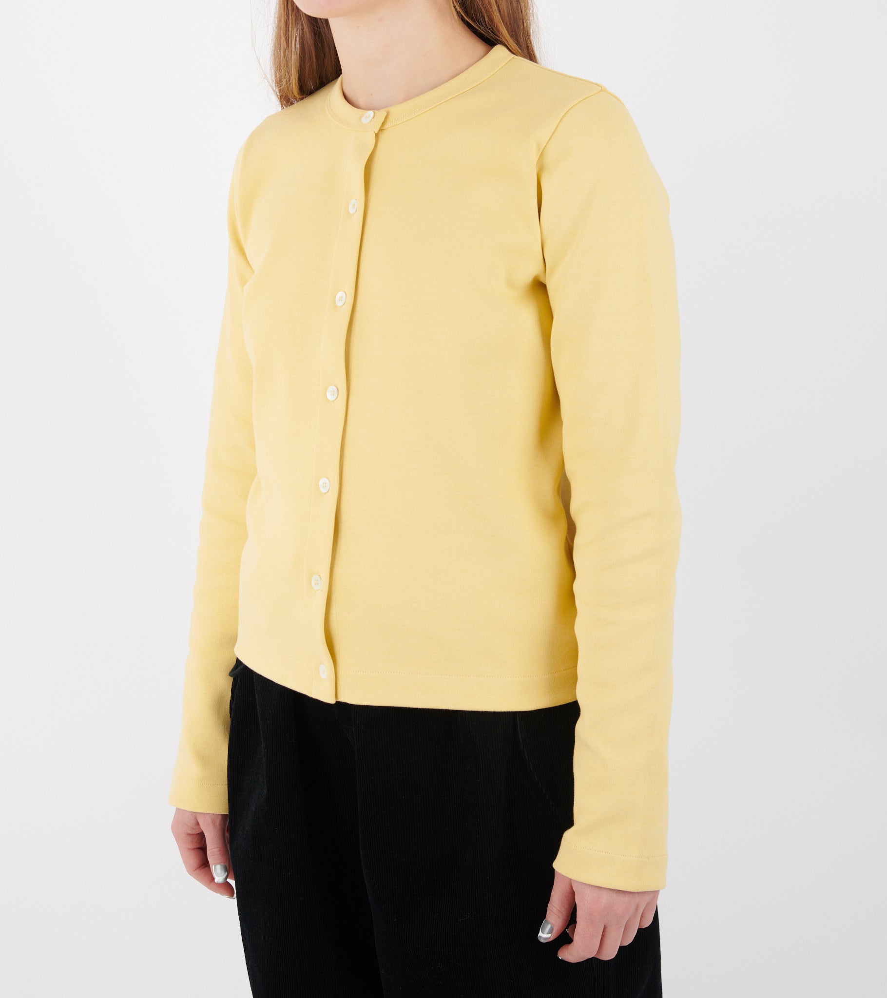 Gul cardigan fra Flore Flore. Poppy Cardigan er fremstillet i en 'heavyweight' økologisk bomuldskvalitet og har en rund hals samt en knaplukning med perlemorsknapper på fronten. Kvaliteten er let stiv.