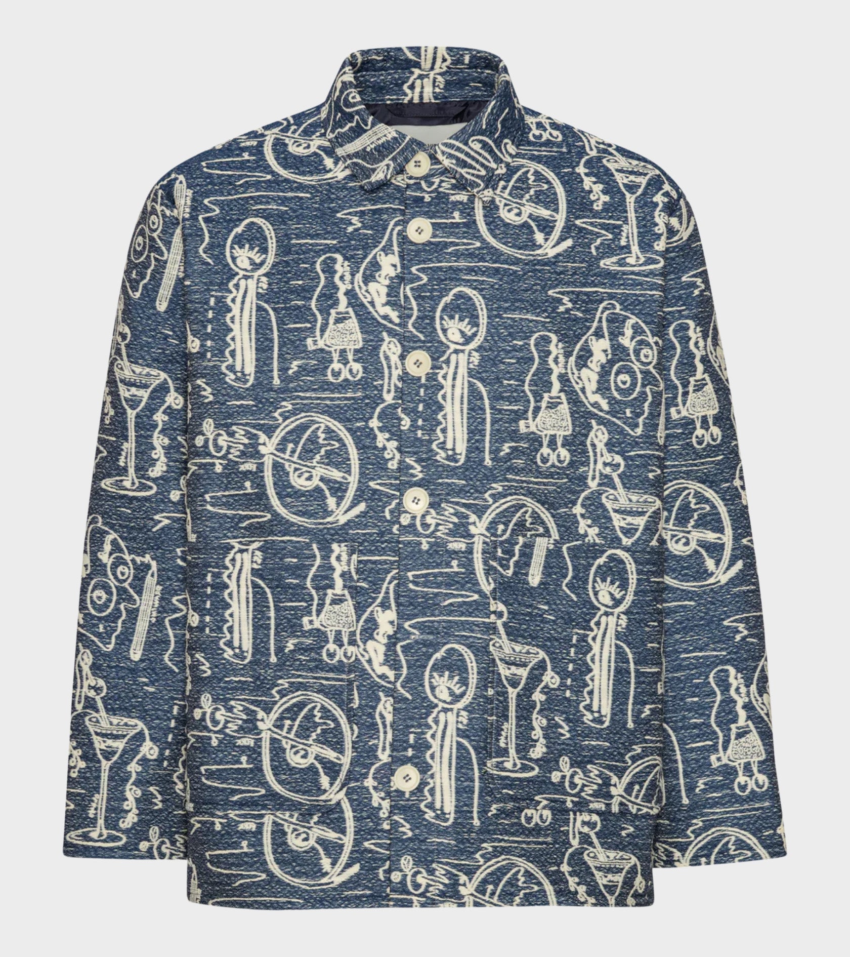Blå jakke med vævede hvide illustrationer fra Henrik Vibskov. Jakken har en klassisk krave samt en knaplukning og to store lommer på fronten.