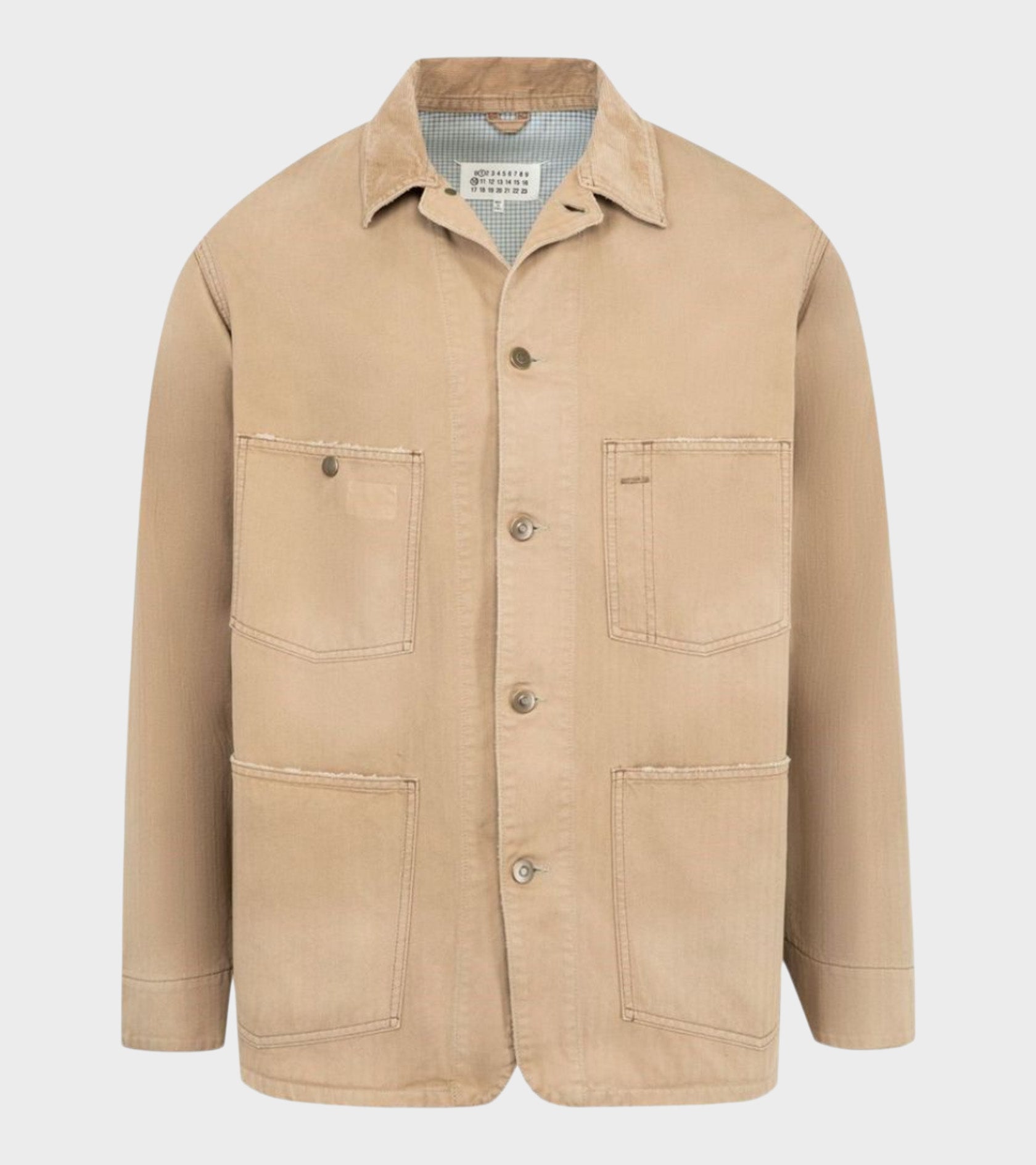 Beige jakke i bomuldskanvas fra Maison Margiela. Jakken har en klassisk krave, en knaplukning og fire lommer på fronten. Jakken er foret med ternet tekstil. Øverst bagpå er de ikoniske 'Four Stitchings'.