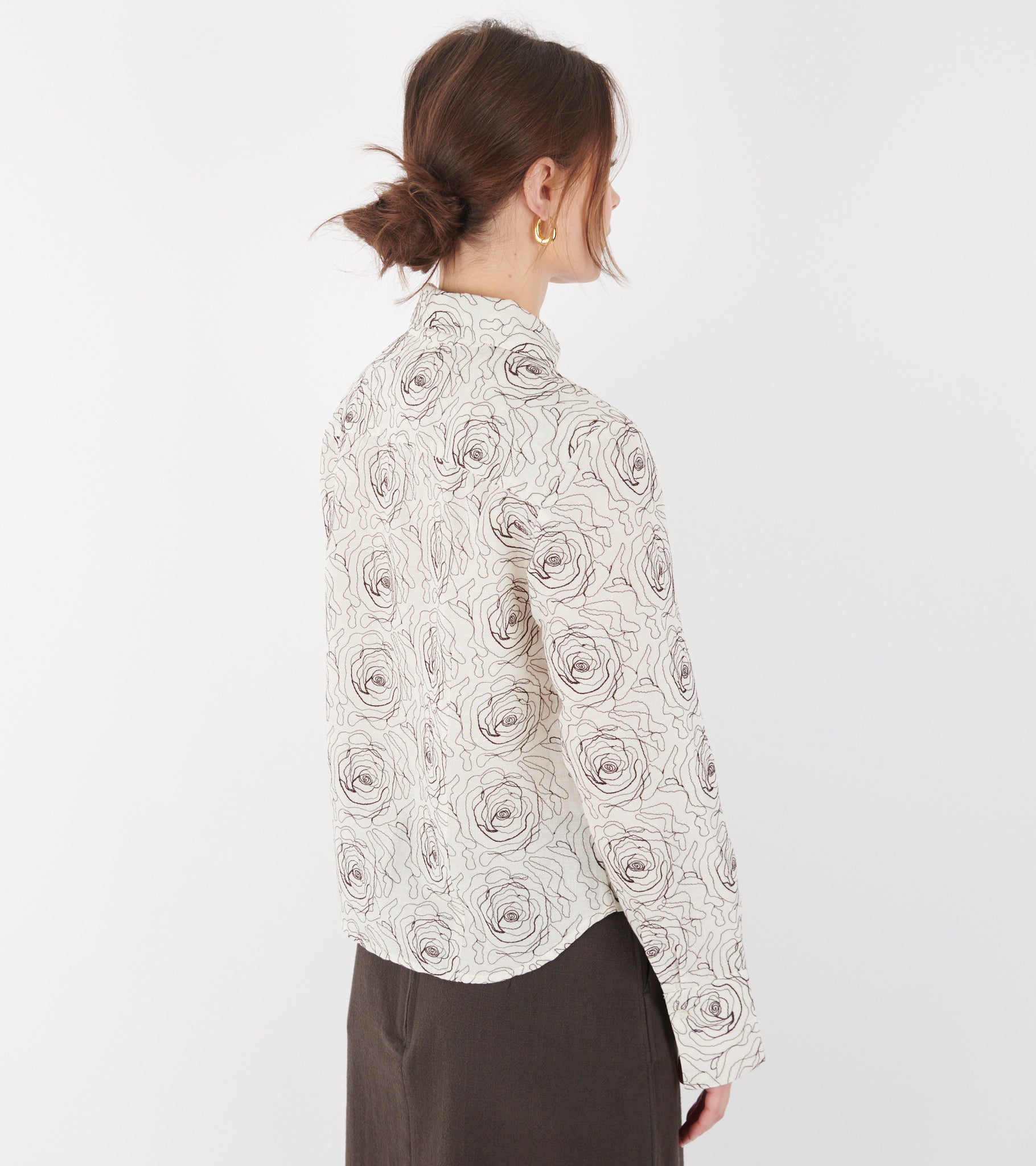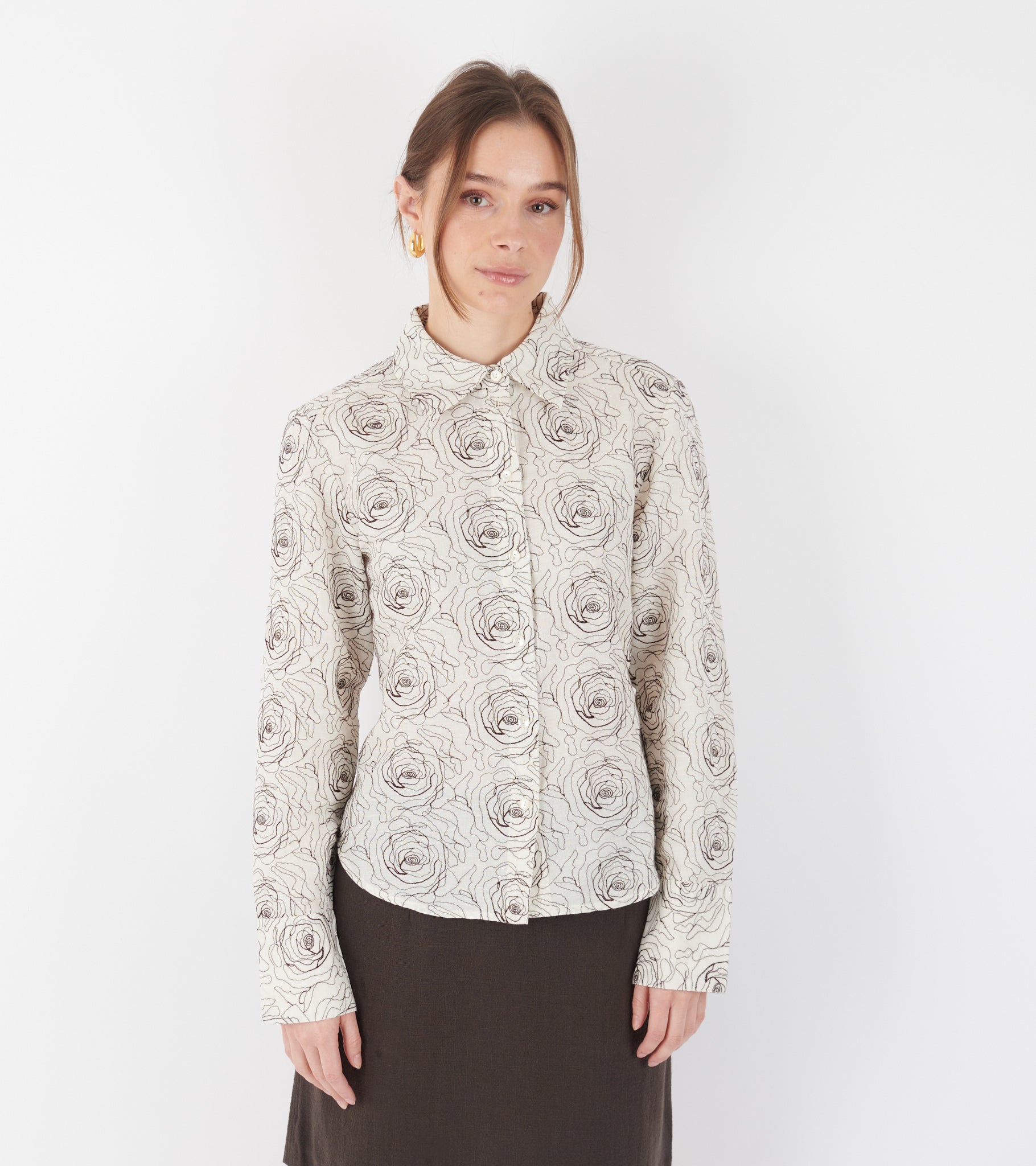 Råhvid skjorte med et mørkebrunt fuldbroderet rosemønster fra Skall Studio.