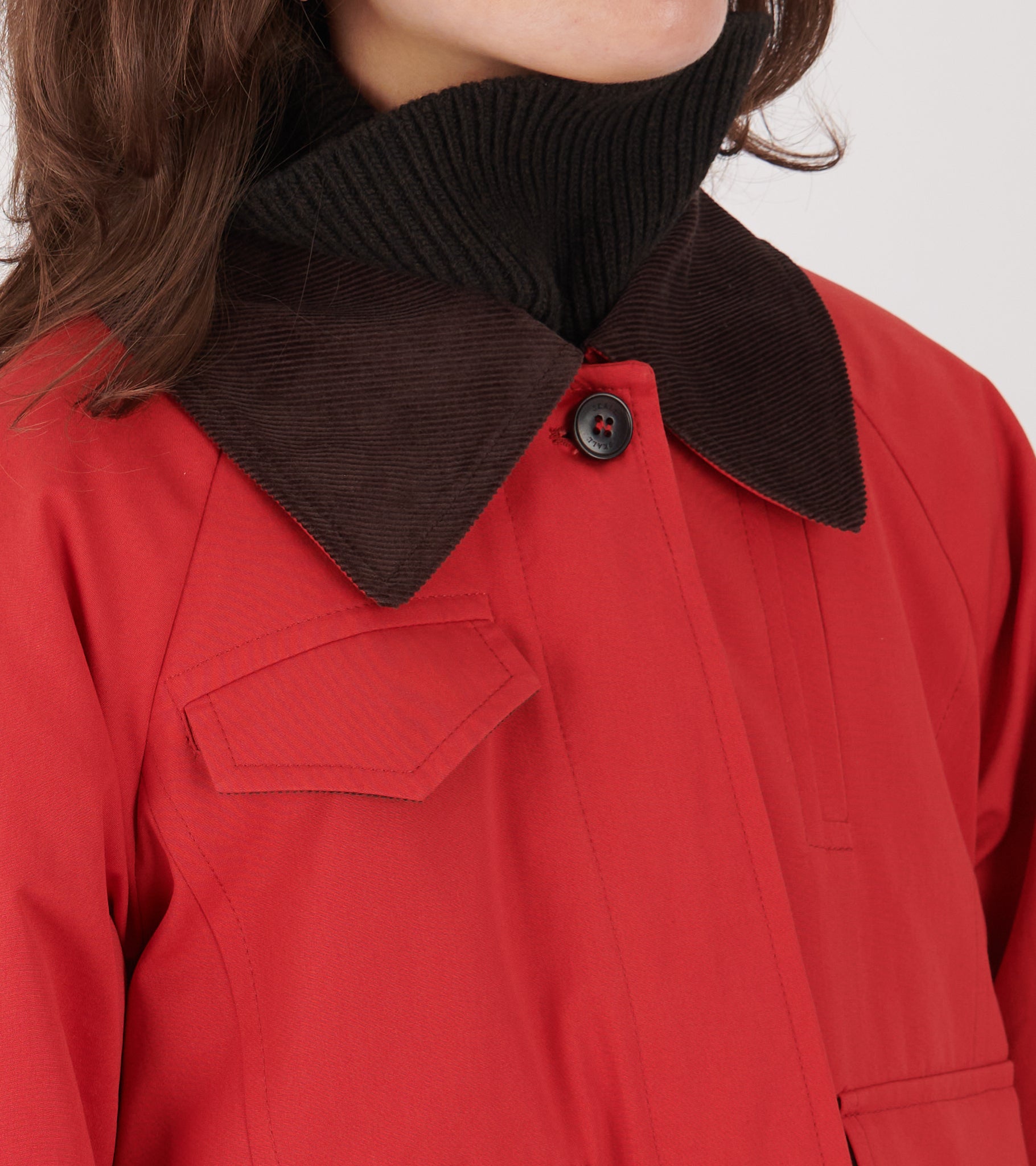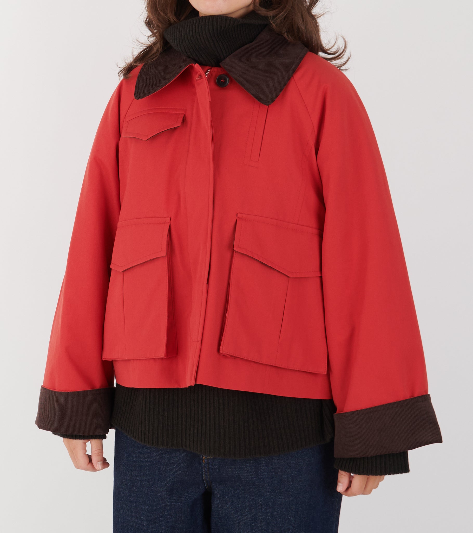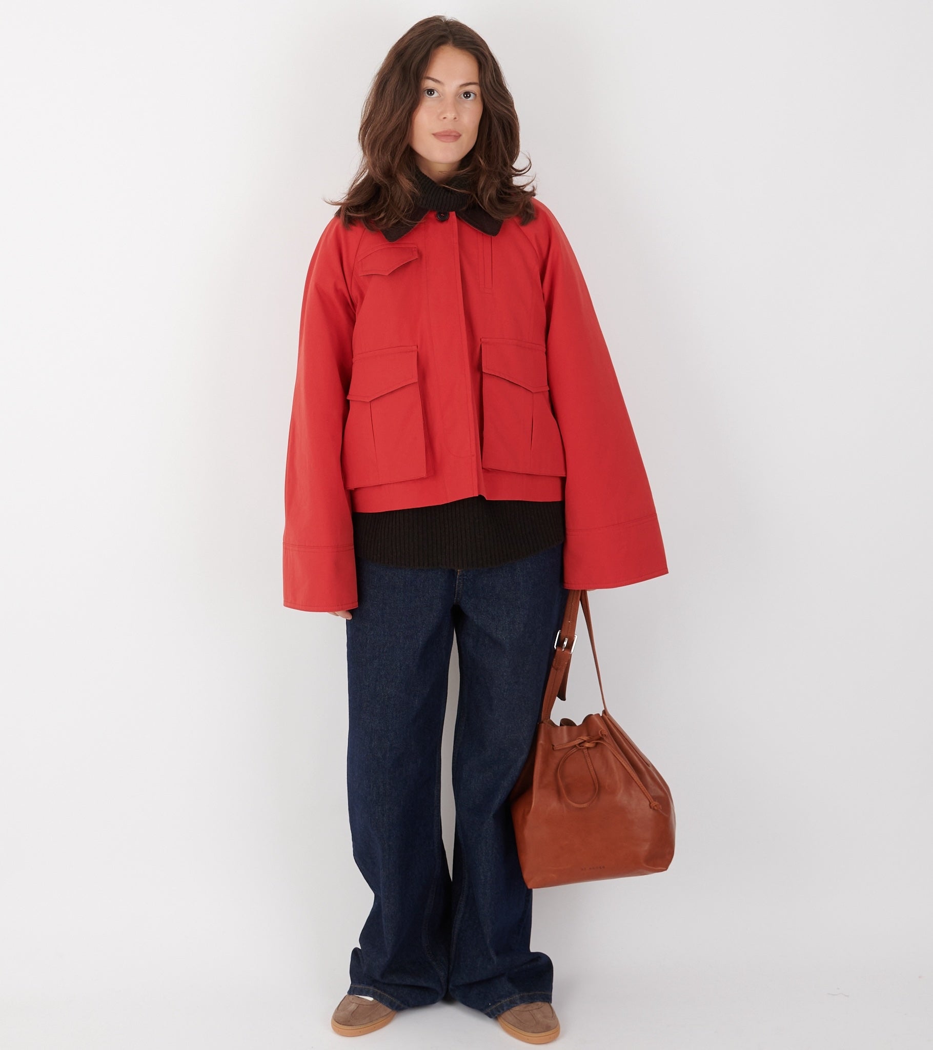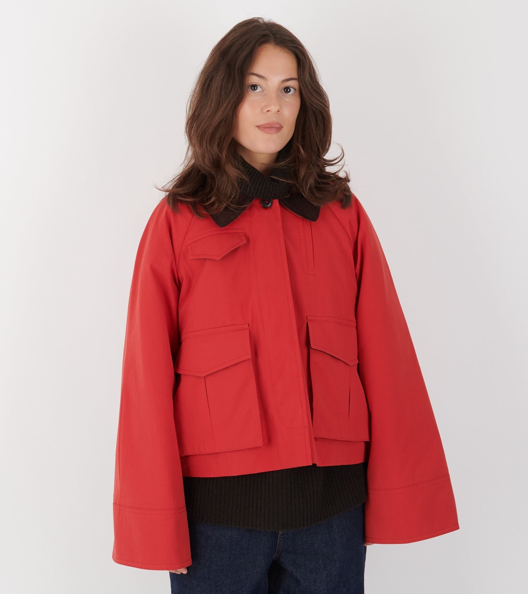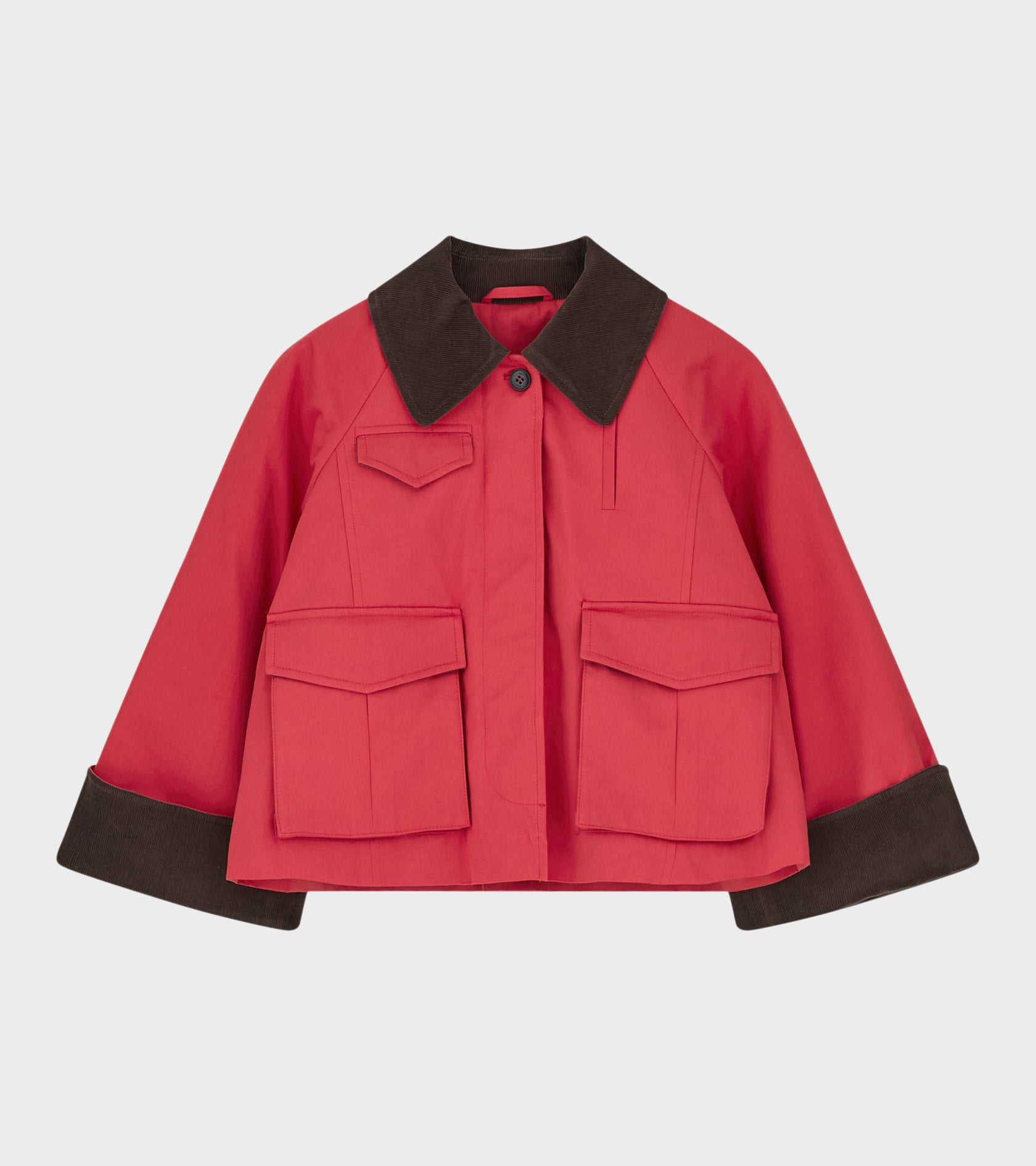 Kort jakke i økologisk bomuld fra Skall Studio. Gaby City Jacket Aurora Red har en stor krave i brunt bomuldsfløjl, en skjult lynlås- og trykknaplukning og tre lommer på fronten. Jakken har brede raglanærmer og er foret med fløjl, som ses når ærmerne foldes op.