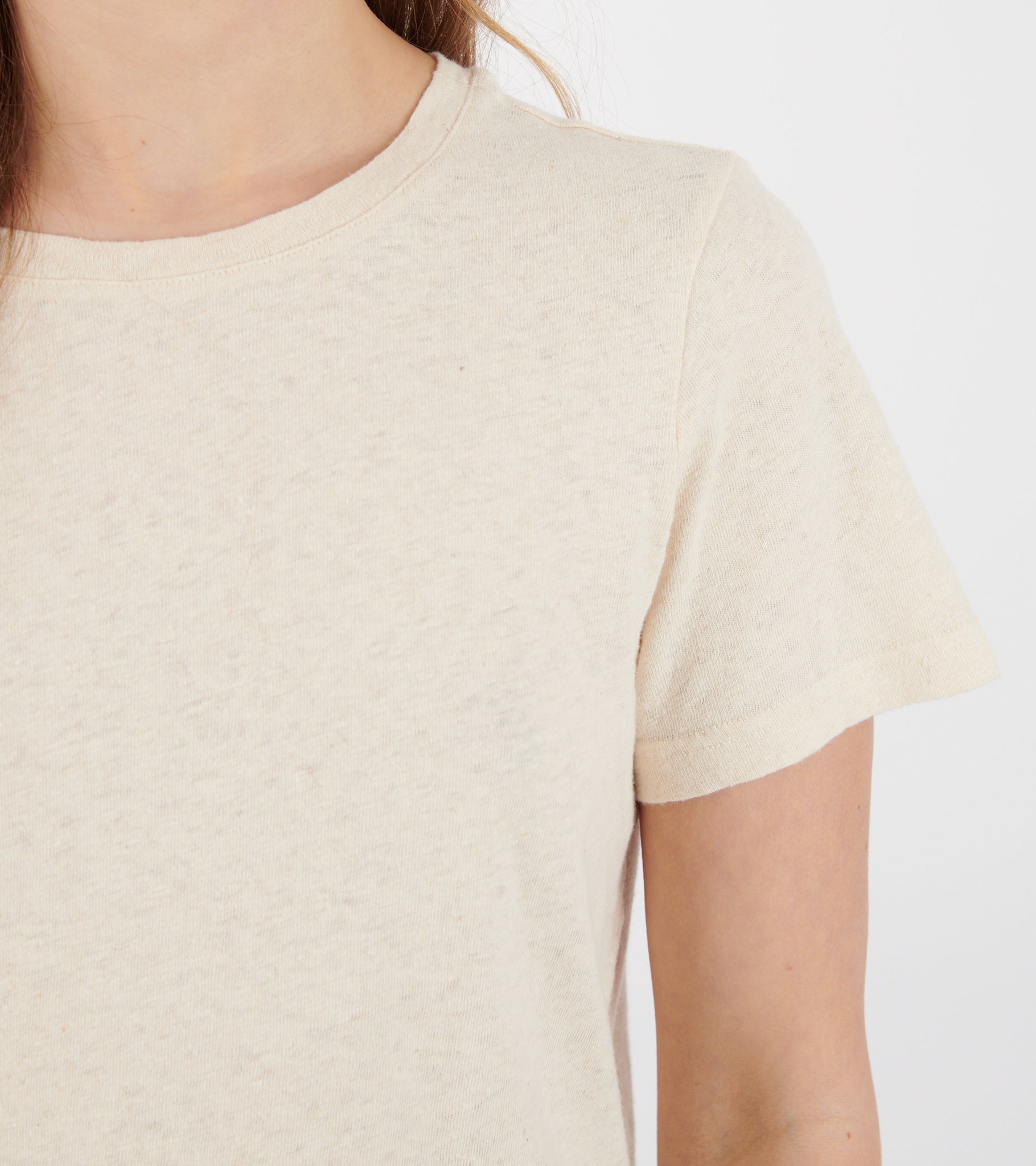 Mika Tee i råhvid fra Skall Studio. T-shirten har en rund hals og er fremstillet i en blanding af økologisk bomuld og hør.