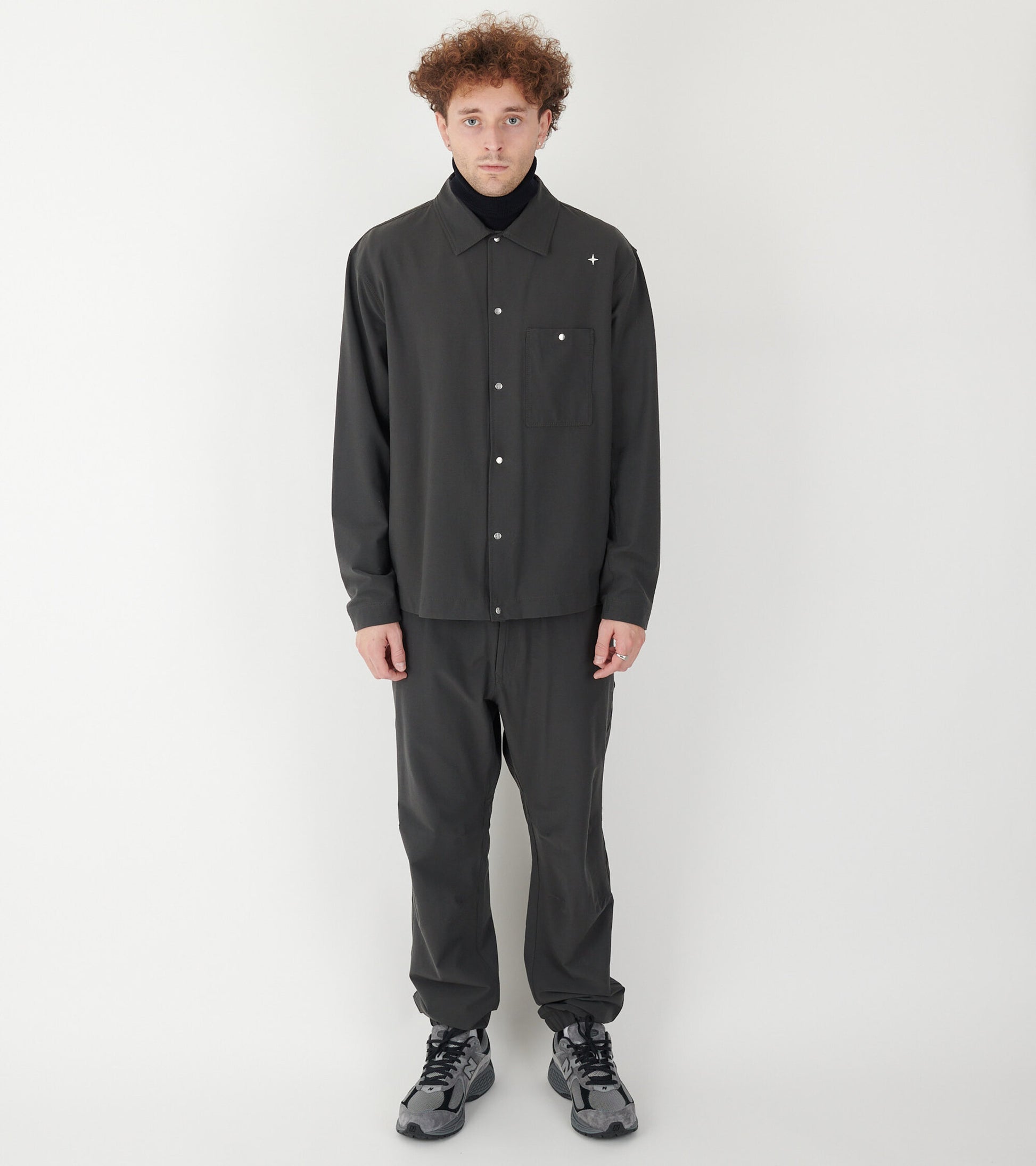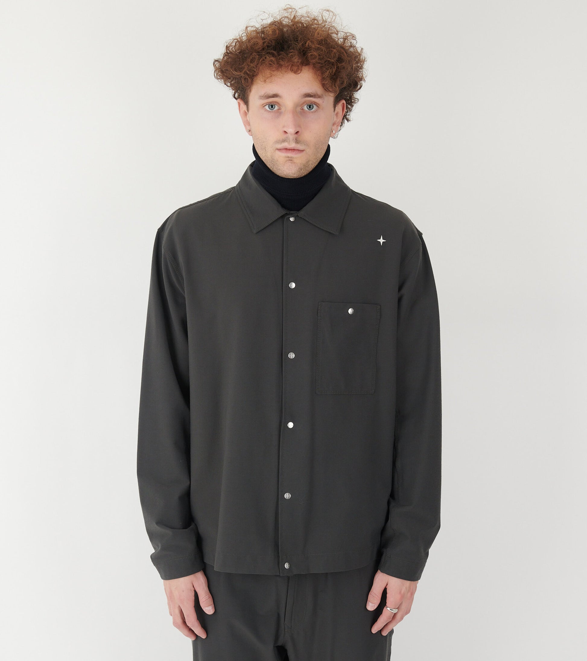Overshirt fra Stone Island i en mørkegrå, næsten sort nuance. Denne overshirt er fremstillet i en teknisk uldblanding og har en klassisk krave, en trykknaplukning og en brystlomme. Øverst i venstre side er det ikoniske 'Stellina' logo broderet i hvid.