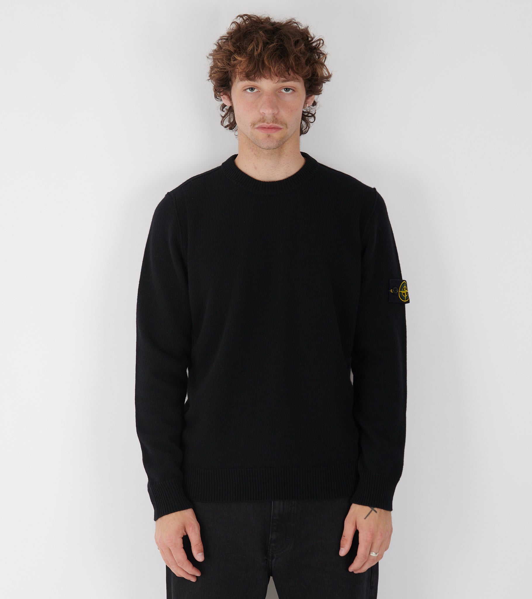 Sort strikket crewneck fra Stone Island. Denne strik har det ikoniske Stone patch på venstre ærme.