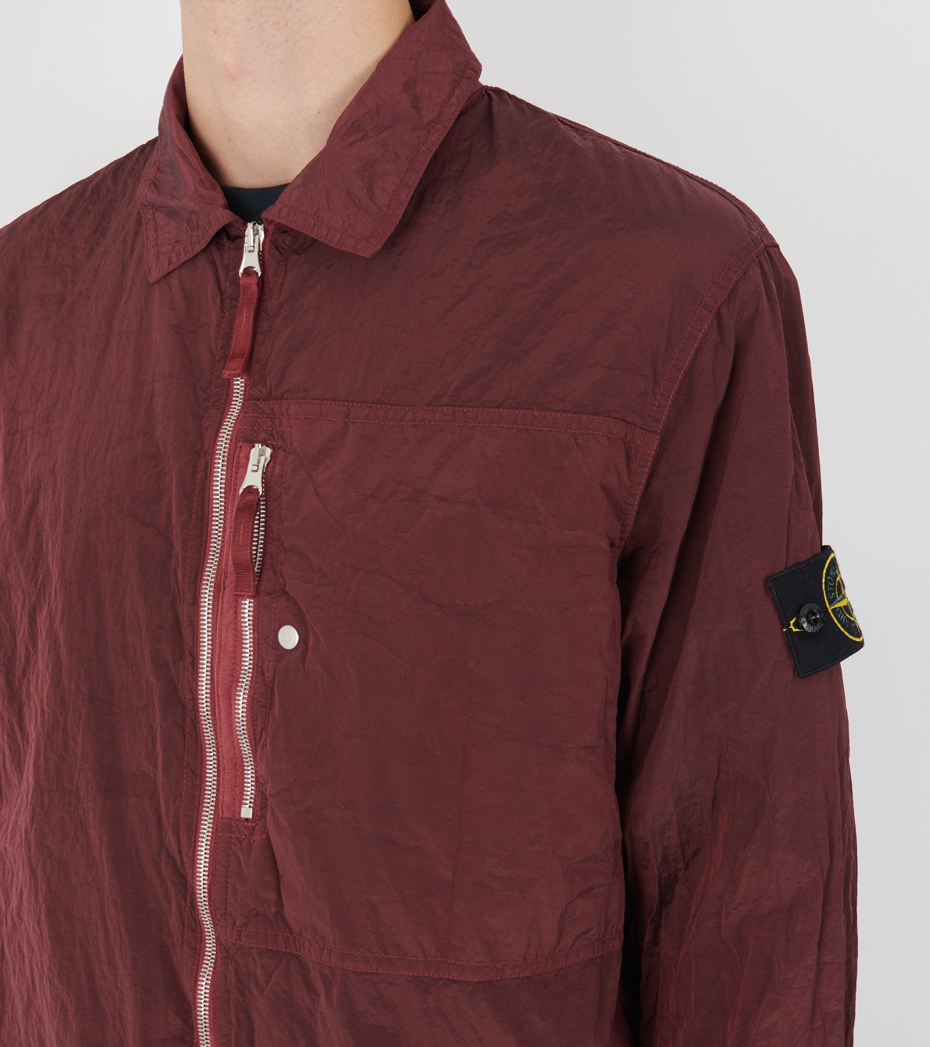 Bordeaux overshirt fra Stone Island. Denne overshirt er fremstillet i en let skinnende Econyl nylon kvalitet og har en klassisk krave, en dobbeltgående lynlåslukning samt en lynlåslomme ved venstre bryst. På venstre ærme er det ikoniske Stone Patch.