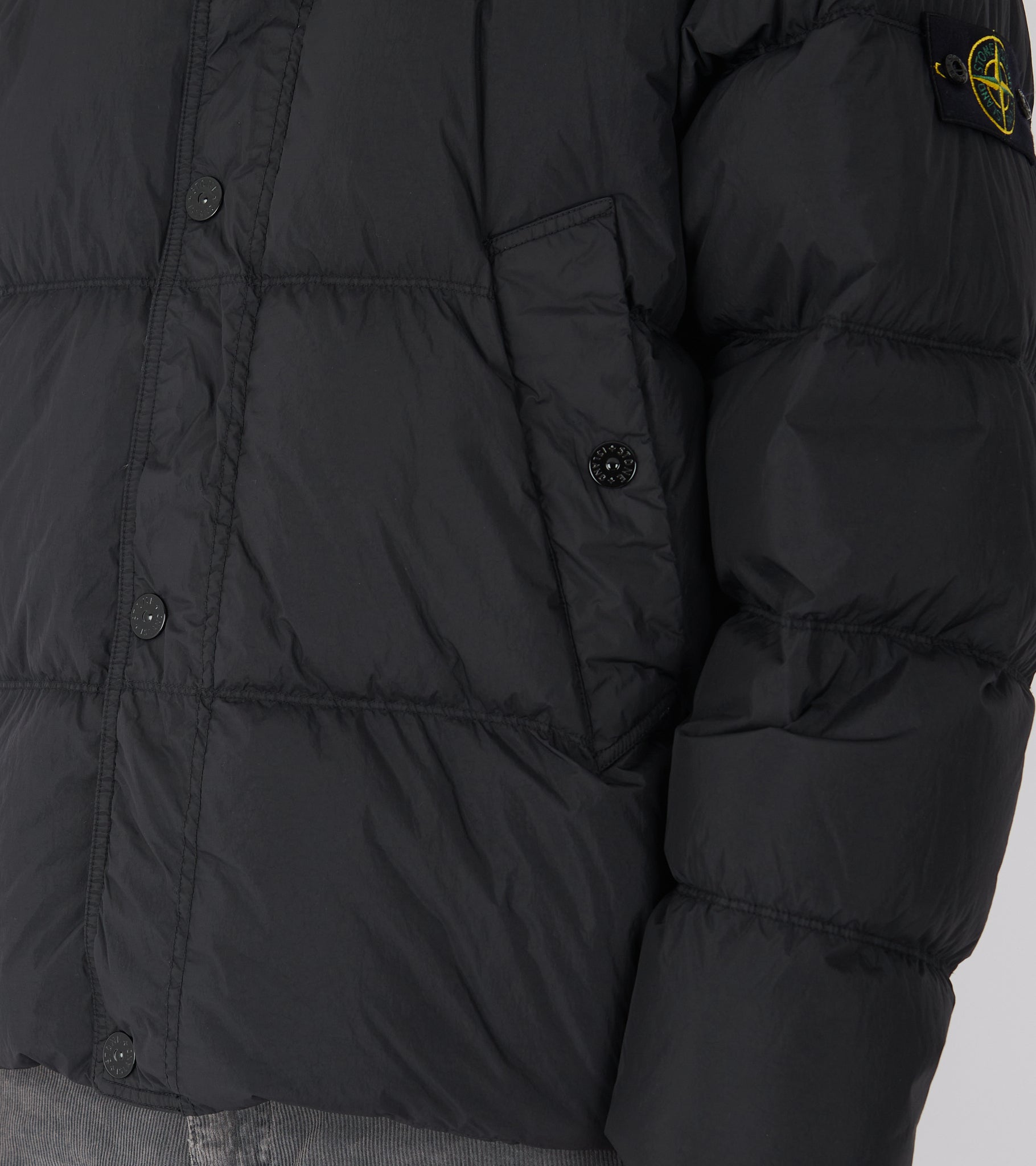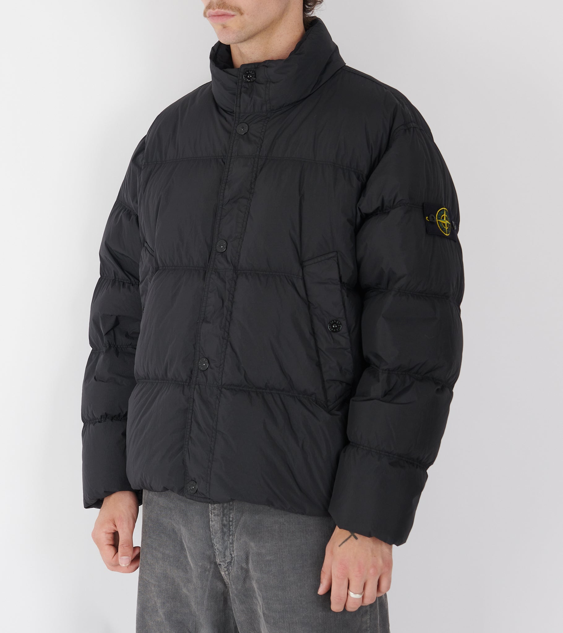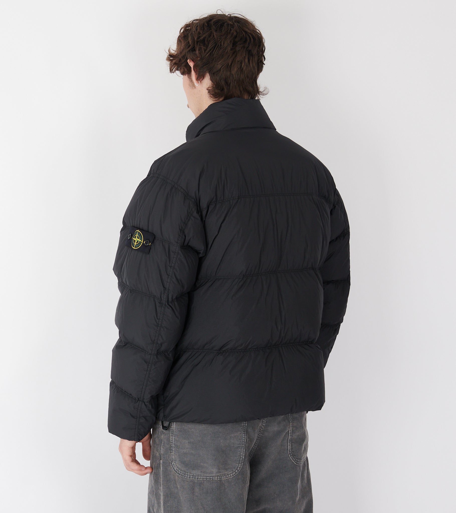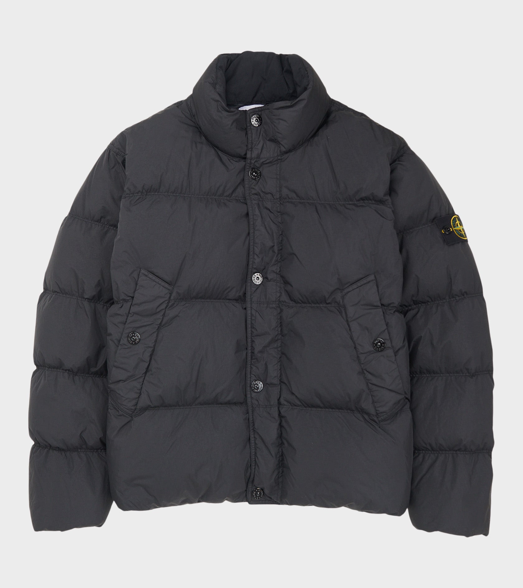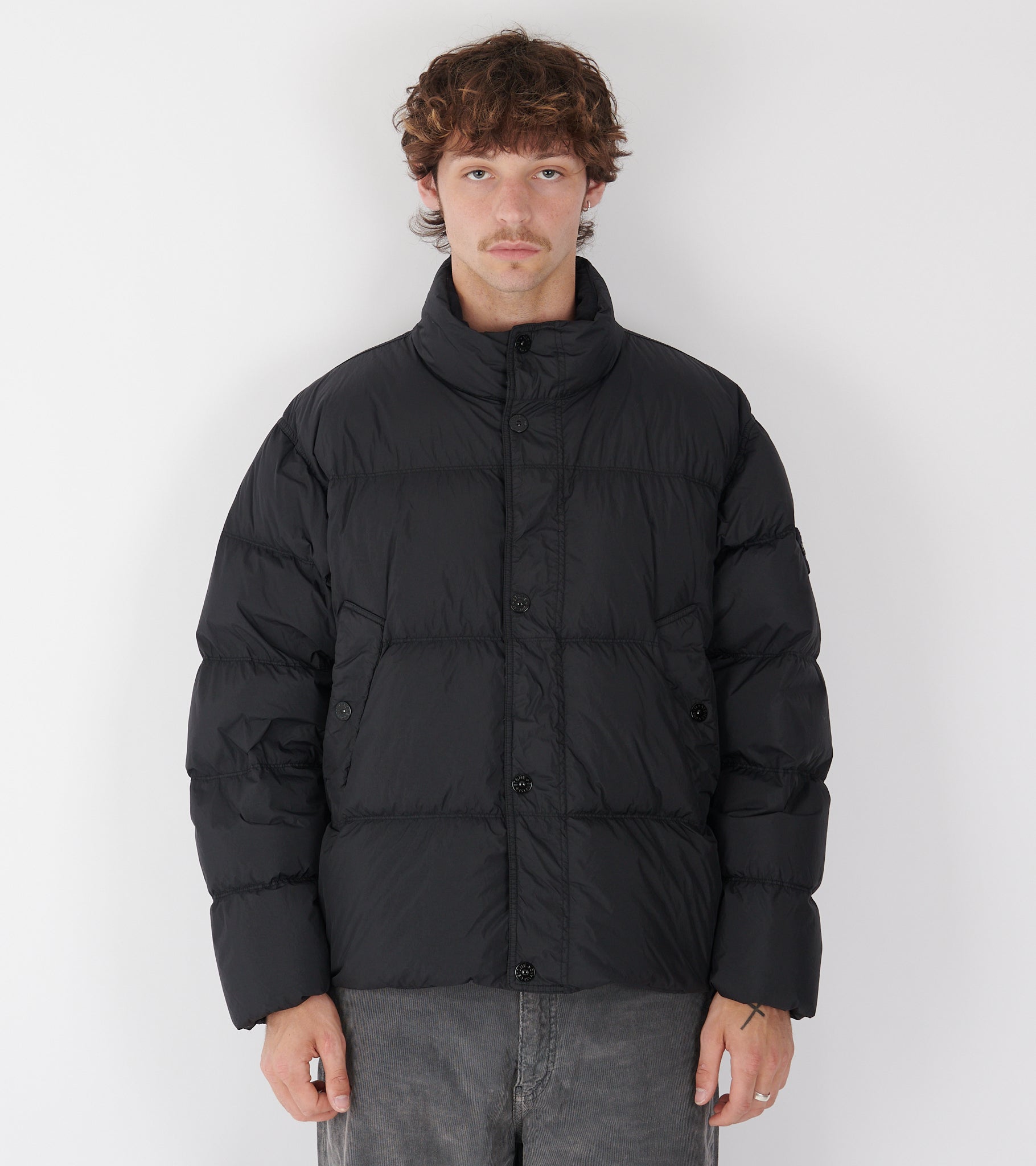 Sort dunjakke med høj hals fra Stone Island. Denne jakke har det ikoniske Stone patch på venstre ærme. Jakken har to lommer foran og lukkes med lynlås samt trykknapper.