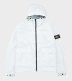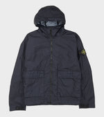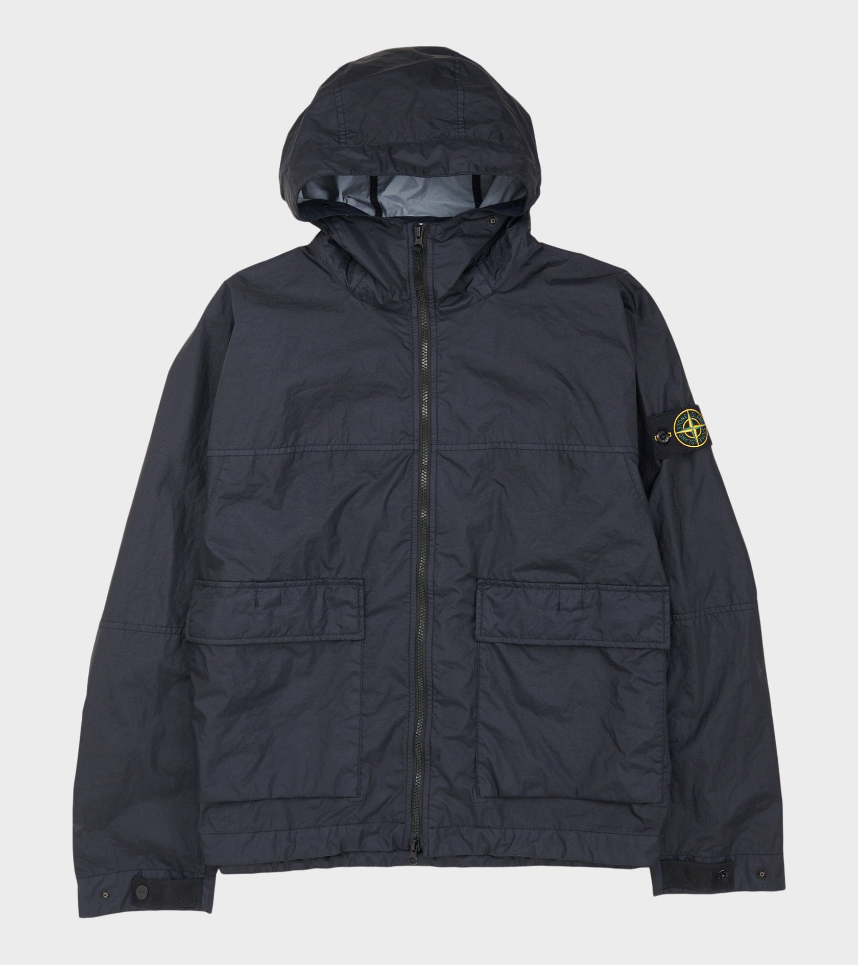 Navy vind- og vandafvisende jakke fra Stone Island. Jakken er fremstillet i garment dyed nylon, i en let 3-lags 'performance' kvalitet. Jakken har en justerbar hætte, en dobbeltgående lynlåslukning og to lommer på fronten. I bunden af jakken er en indvendig justerbar elastik, så den kan reguleres i vidden. På venstre ærme er det ikoniske Stone Patch.