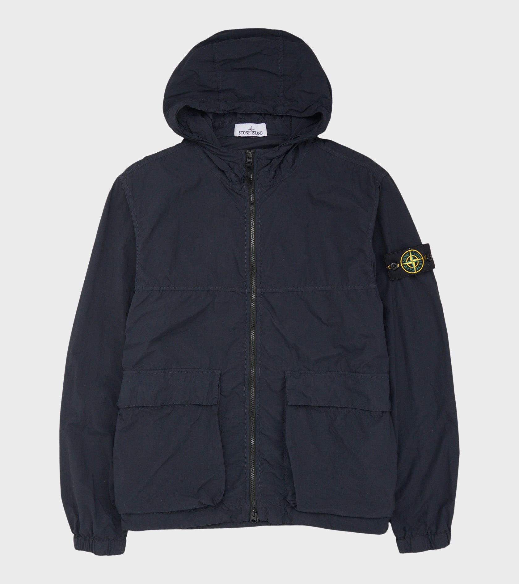 Navy jakke i garment dyed nylon fra Stone Island. Jakken har en justerbar hætte, en dobbeltgående lynlåslukning og to lommer på fronten. I bunden af jakken er en indvendig justerbar elastik, så den kan reguleres i vidden. På venstre ærme er det ikoniske Stone Patch.