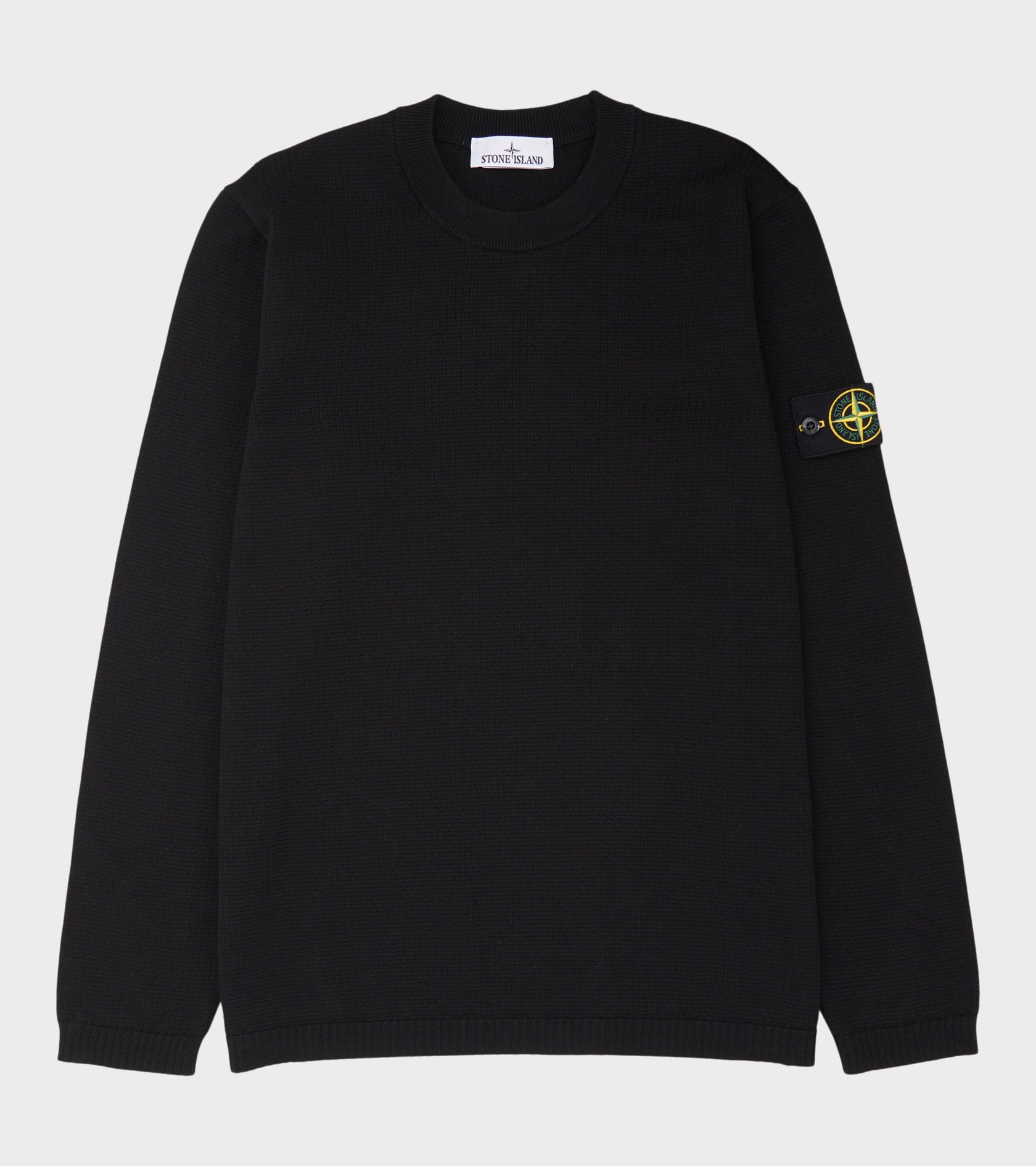 Sort strik i økologisk bomuldsgarn fra Stone Island. På venstre ærme er det ikoniske Stone Patch.