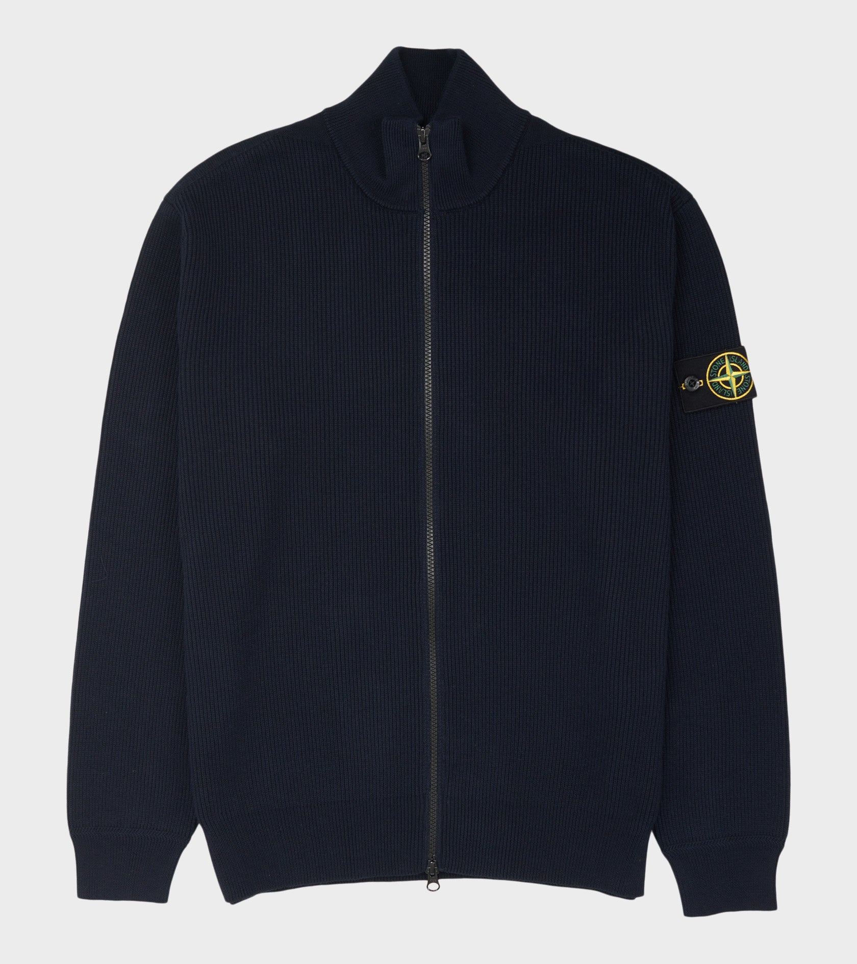 Navy ribstrikket cardigan i økologisk bomuldsgarn fra Stone Island. Strikken har en høj hals samt en dobbeltgående lynlåslukning. På venstre ærme er det ikoniske Stone Patch.