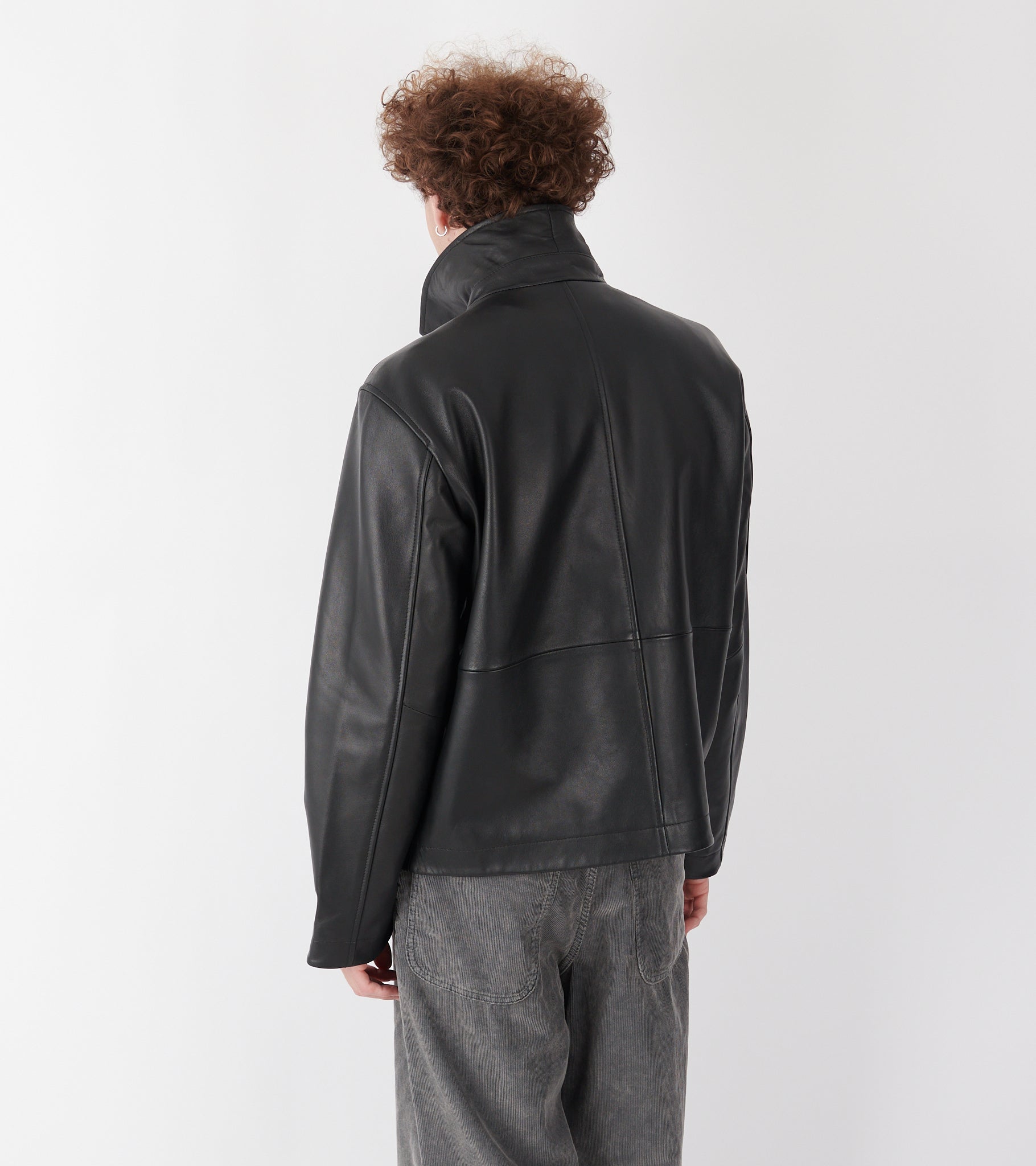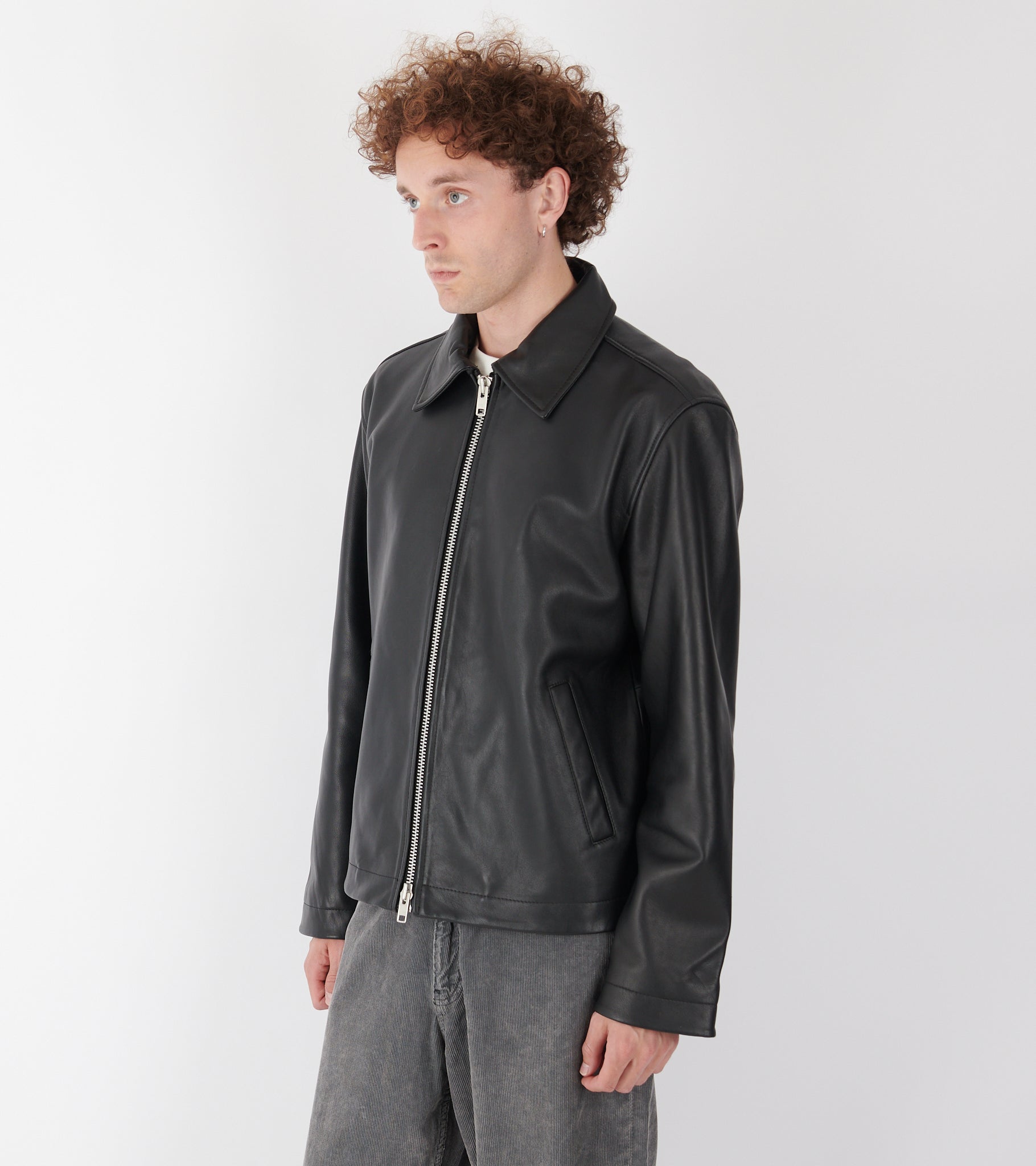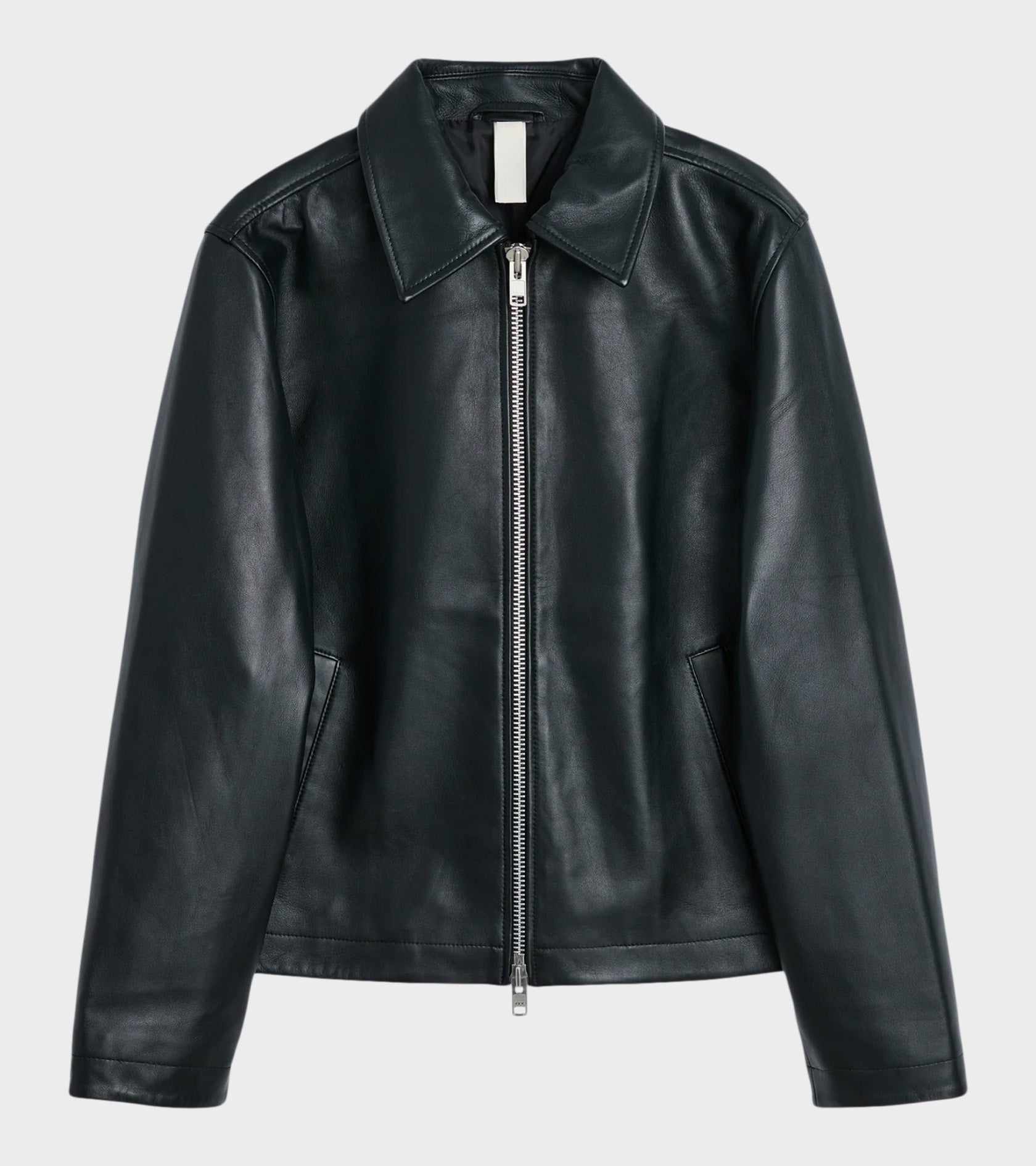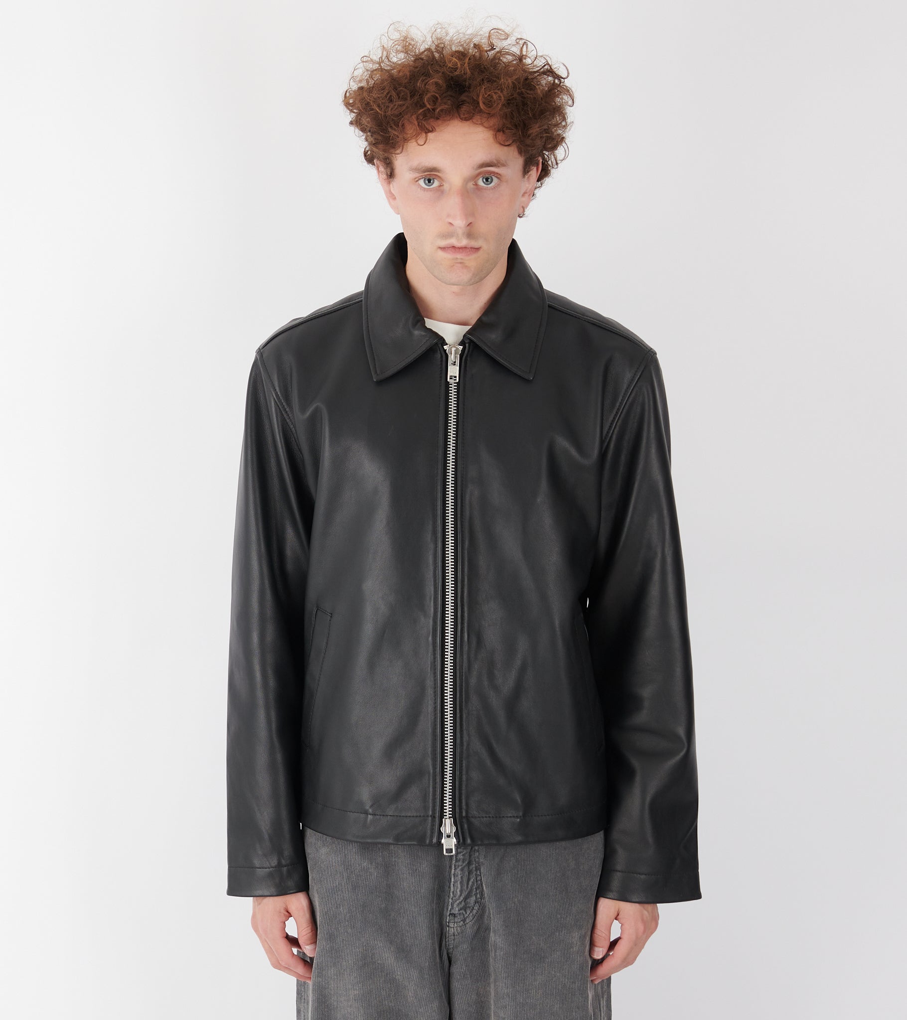 Sort jakke i lammelæder fra Sunflower. Short Leather Jacket har en klassisk krave, en dobbeltgående sølv lynlåslukning og en skrålomme i hver side.