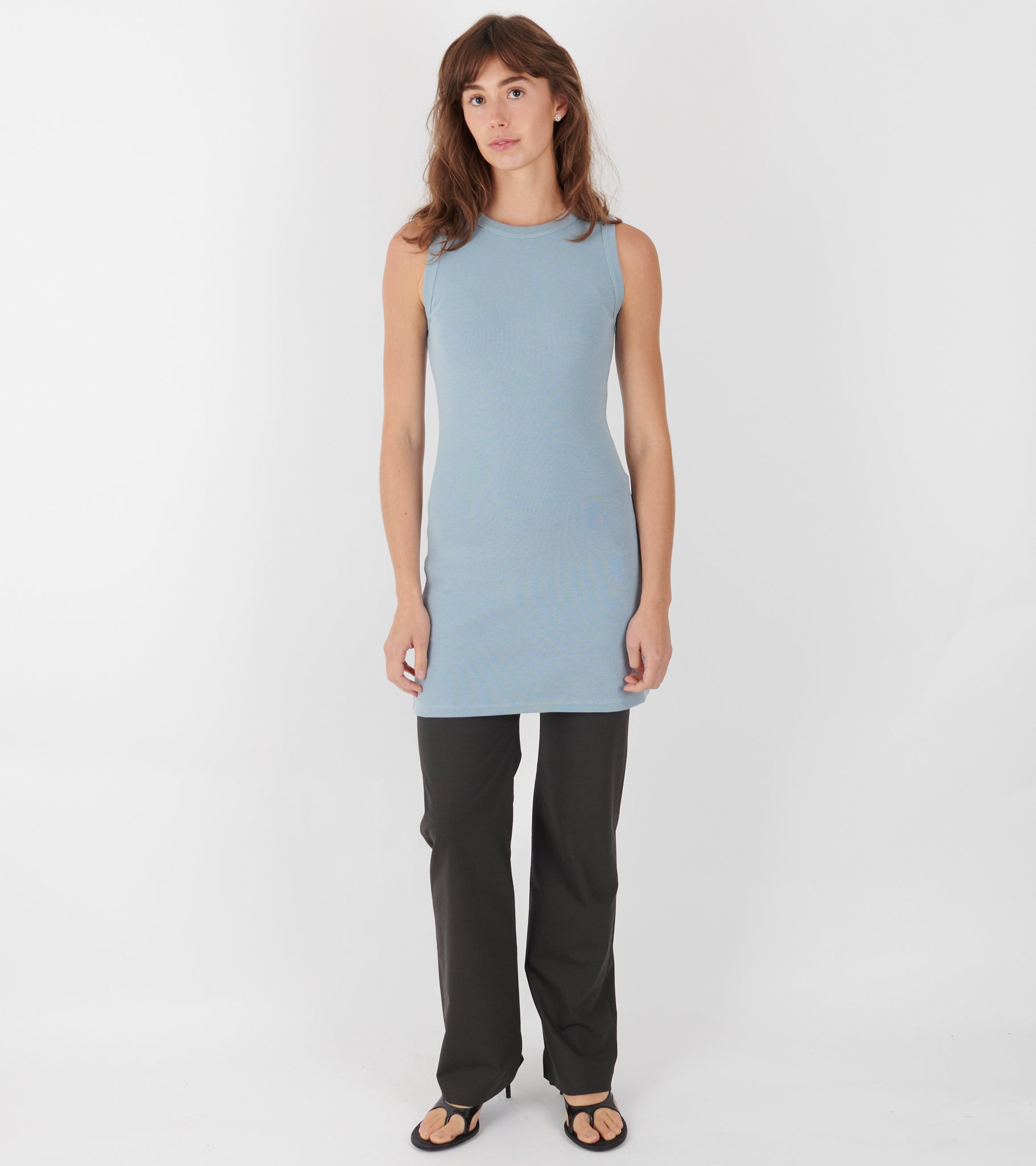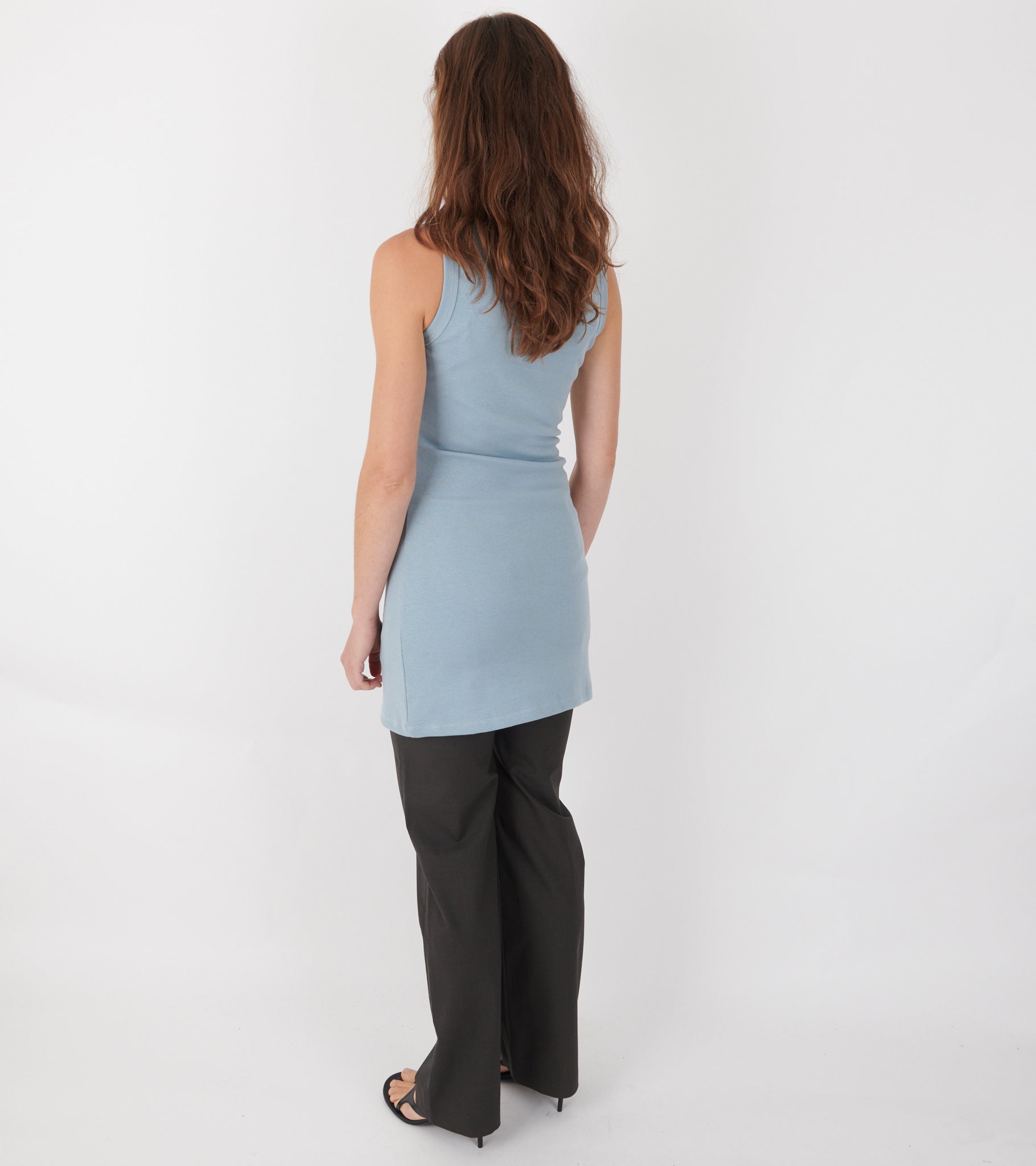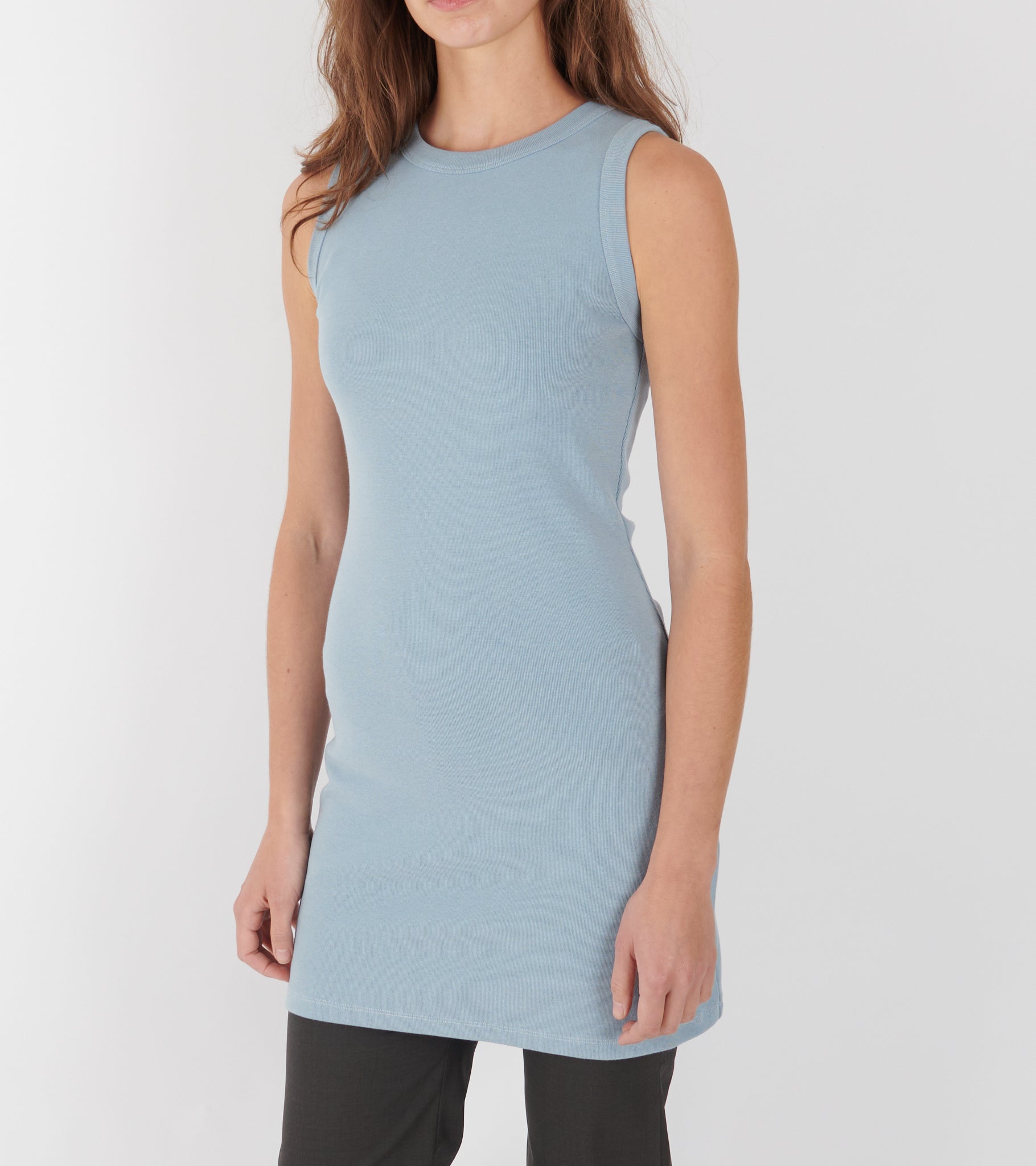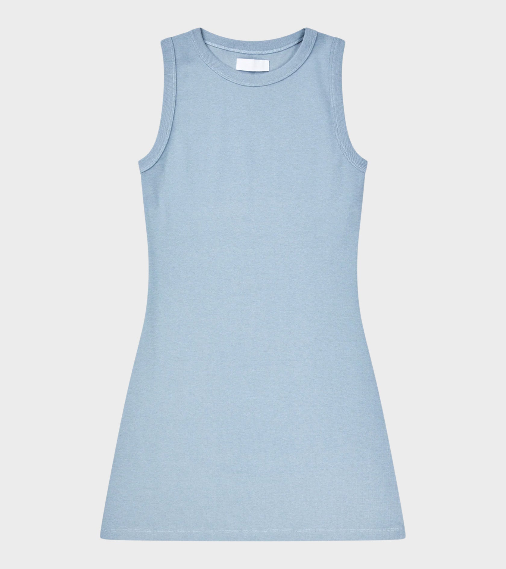 Lyseblå kjole lavet af restbomuld fra Teira 1996.
