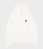 White hoodie from Comme des Garcons PLAY. This hoodie has two embroidered PLAY hearts on the left chest and closes with a zipper. The iconic heart with eyes from PLAY was designed by Filip Pagowski and is featured on all PLAY products.