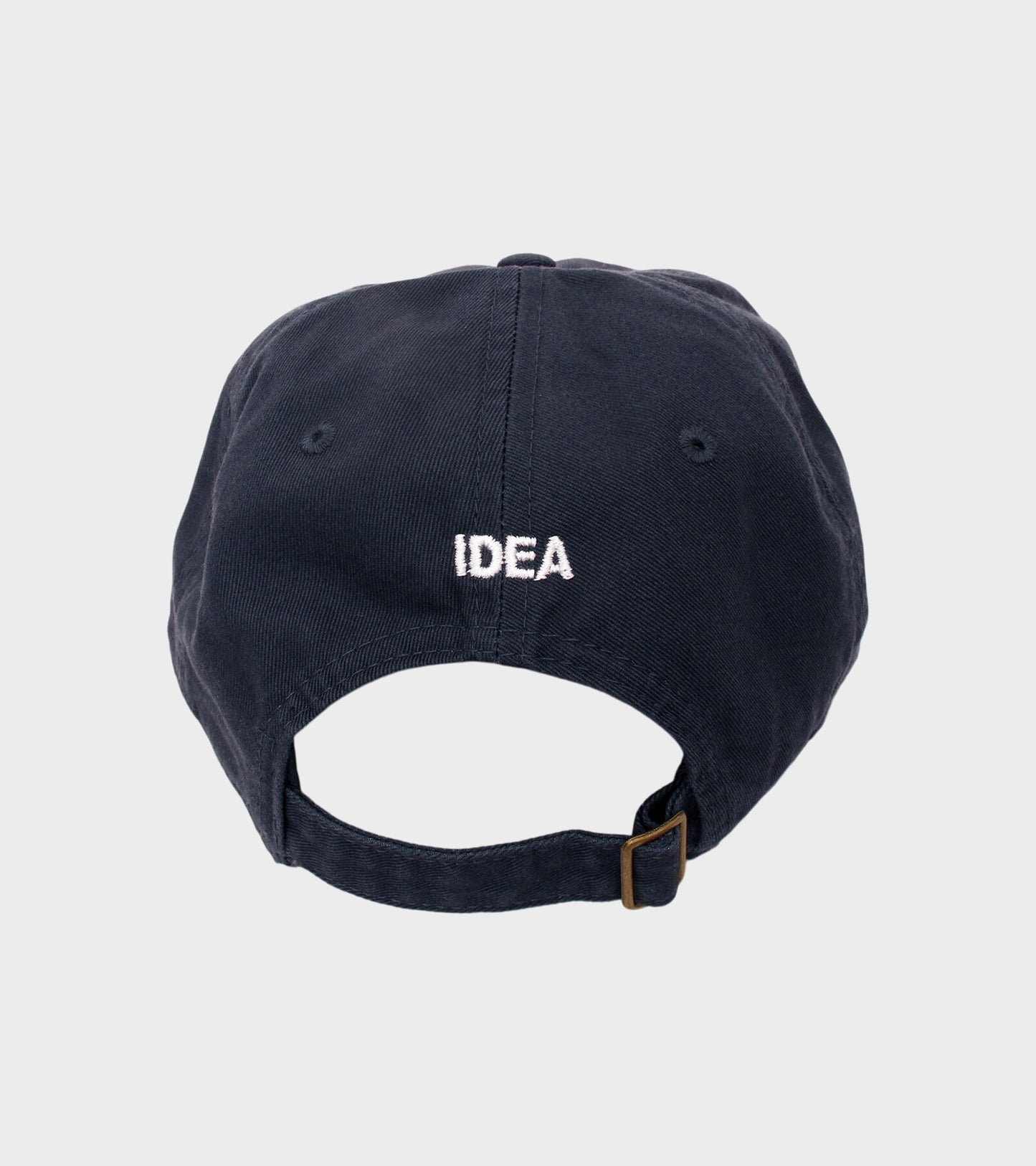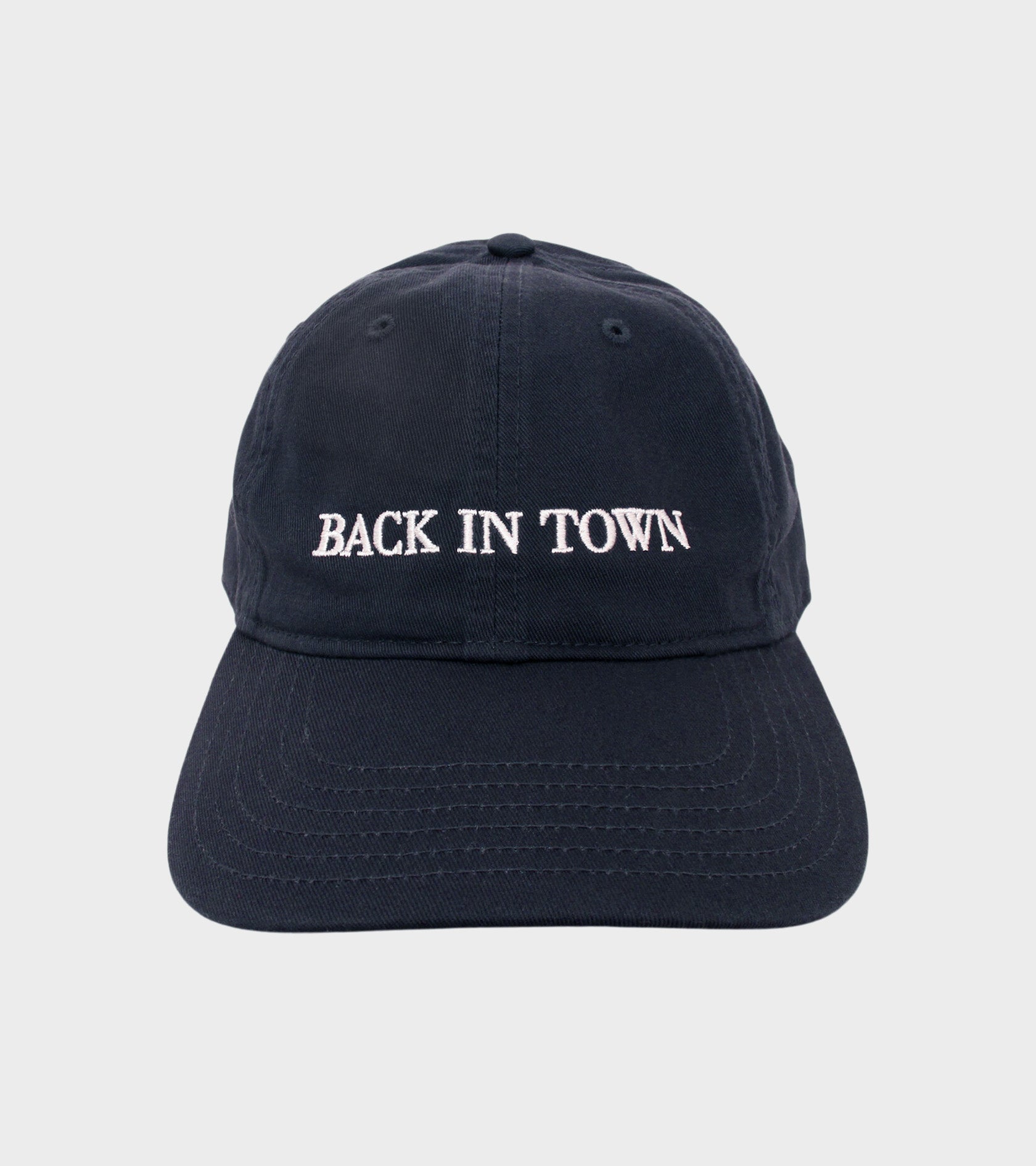 Navy cap from IDEA. The cap has white embroidery on the front with the text 'Back In Town' and 'IDEA' on the back. This unisex cap is made of organic cotton and is one size. IDEA has made a range of caps in different colours with fun statements and motifs.