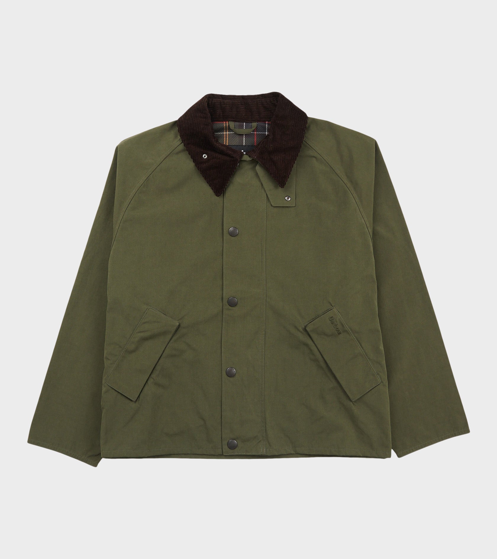 Olive green jacket from Barbour. The OS Transporter Casual Jacket is made from a blend of polyester, nylon and waxed cotton. It has a classic brown velvet collar, a concealed zip fastening, a press stud fastening and two front pockets. The collar has a strap detail which allows it to be closed all the way up the neck.
